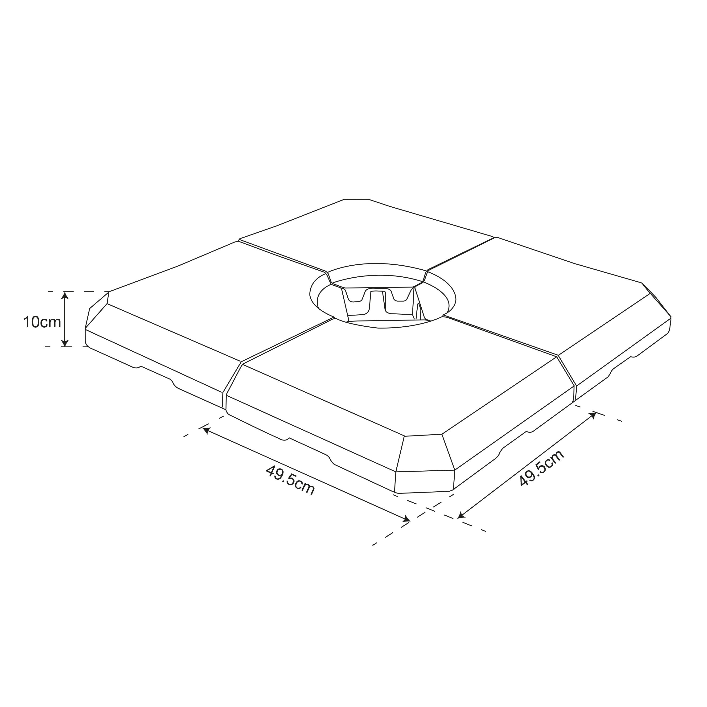 De parasolvoet is vervaardigd uit sterk HDPE kunststof, een materiaal dat goed bestand is tegen weersinvloeden en weinig onderhoud vraagt. De zwarte kleur zorgt voor een rustige, neutrale uitstraling die past bij vrijwel elke zweefparasol. Geschikt voor zweefparasols tot maximaal 2,5 x 2,5 meter of een diameter van 3 meter zonder draaifunctie.