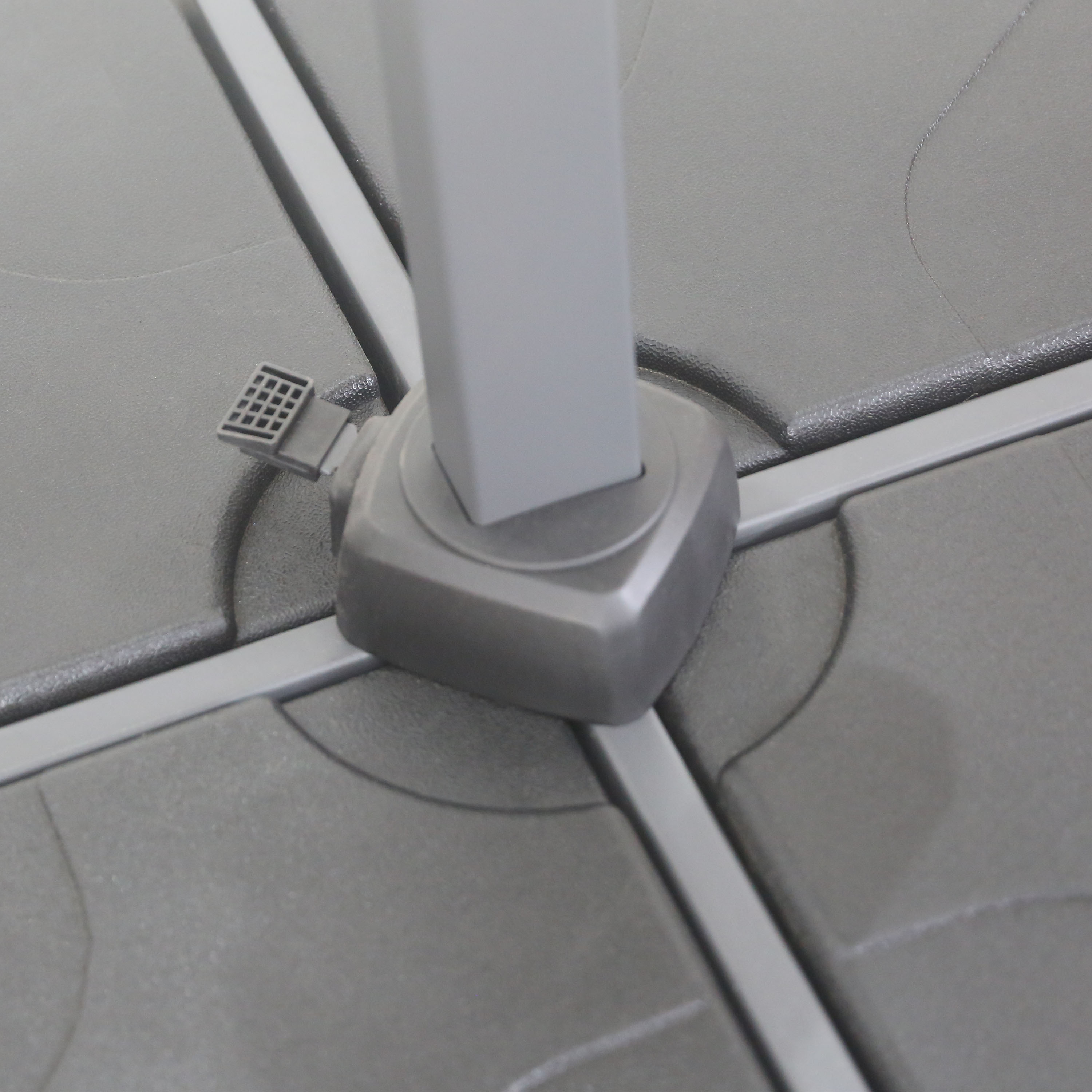 De parasol wordt geleverd met een stabiele kruisvoet. Voor optimale stabiliteit adviseren we om de voet te verzwaren tot minimaal 90 kg met bijvoorbeeld tegels. Ook wordt een beschermende parasolhoes meegeleverd, zodat je de parasol gemakkelijk kunt beschermen wanneer deze niet in gebruik is. Zo blijft het doek langer mooi en verleng je de levensduur van de parasol.
