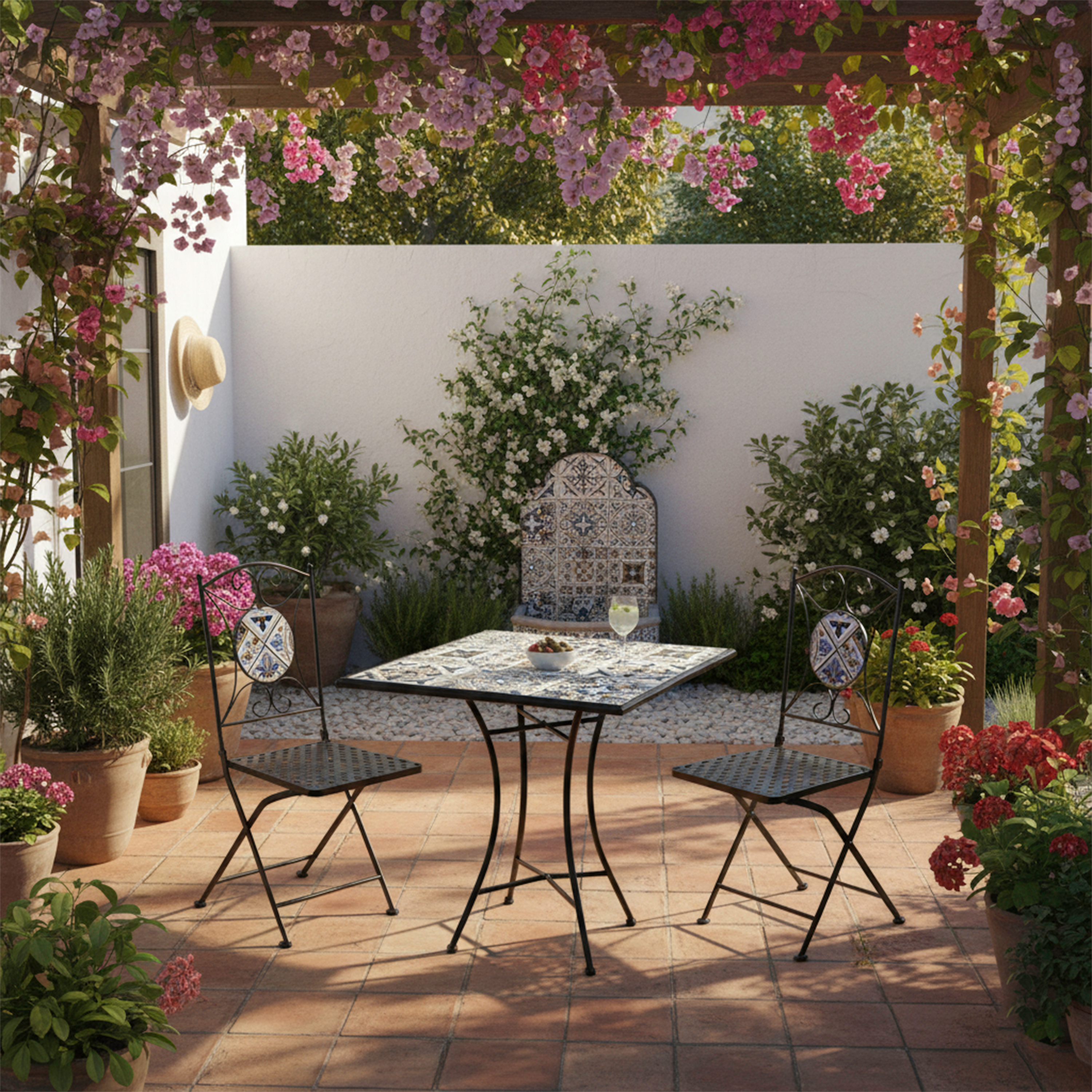 Het slanke metalen frame oogt verfijnd maar is dankzij de poedercoating ook bijzonder sterk. De rugleuningen zijn met de hand ingelegd met keramische tegels in mozaïekstijl, waardoor elk stoeltje nét een beetje anders is en een unieke uitstraling krijgt. Met een zithoogte van 46 cm en een draagvermogen van 150 kg per stoel zijn ze niet alleen stijlvol, maar ook comfortabel in gebruik.