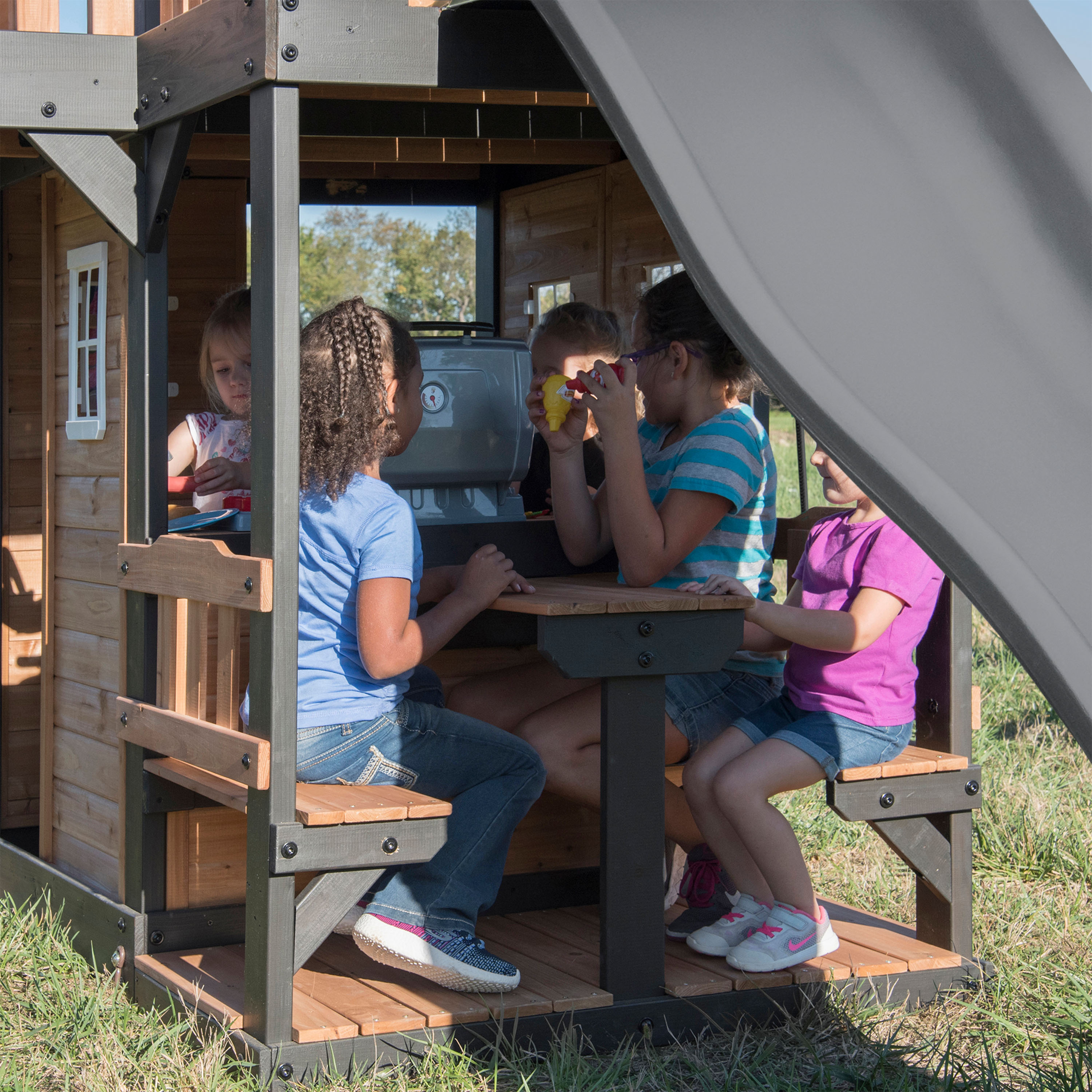 - Speelhuis onderin is uitgerust met barbecue, spoelbak en speeleten.