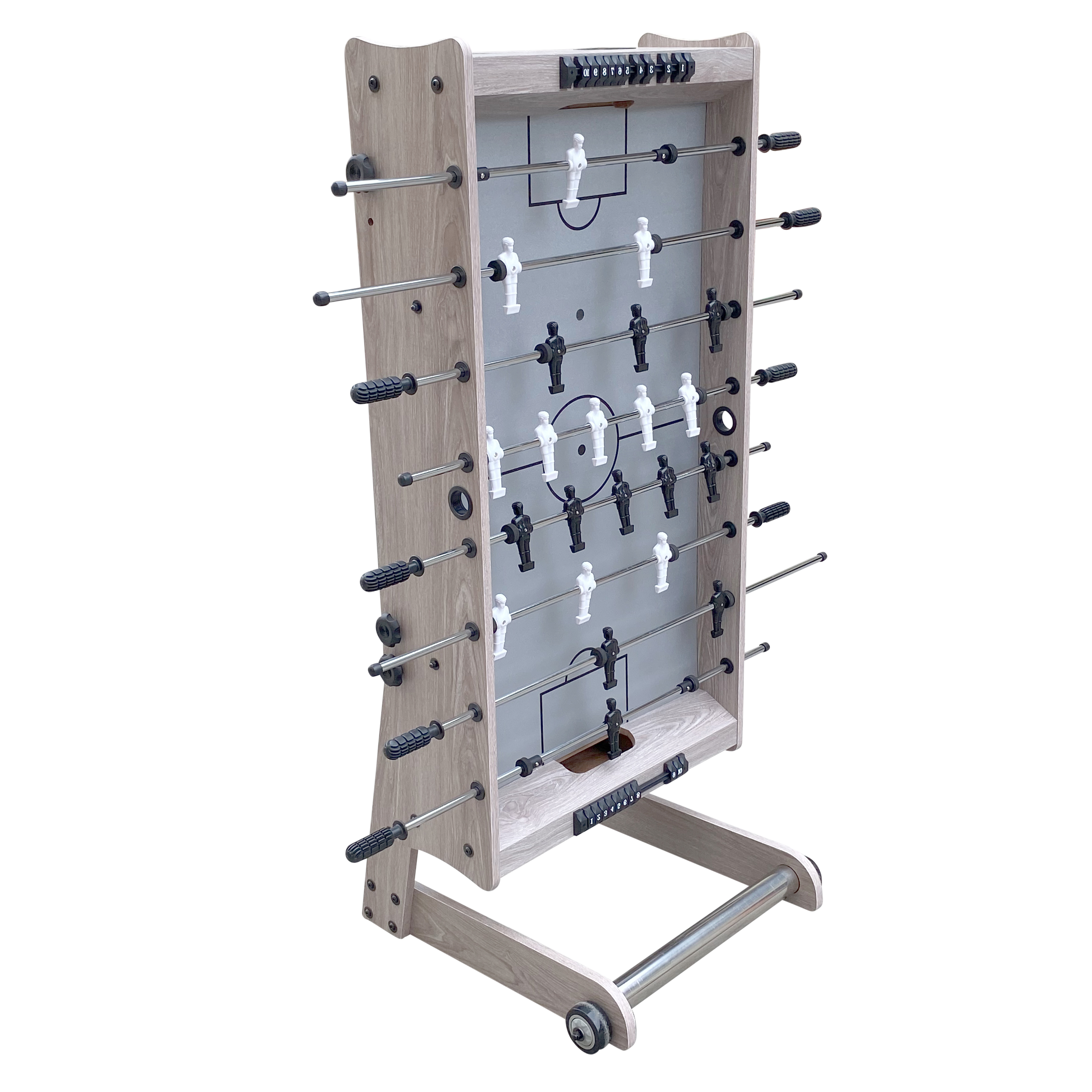 Der Scorpion Kick kommt mit einem Muster an den Seiten. Auf dem Klapprahmen ist ein Gehäuse mit 15 mm dicken Seiten und einer PVC-Deckschicht montiert. An den Spielstäben mit Ø12,7 mm sind 11 blaue und 11 rote Puppen befestigt. Die Spielstangen sind dank der Griffe aus Kunststoff (PP) leicht zu bedienen. Die Stoßstangen halten die Puppen von den Wänden fern, damit sie nicht beschädigt werden. Halte die Stangen geschmeidig, indem du sie regelmäßig mit Gleitmittel besprühst (nicht im Lieferumfang enthalten).