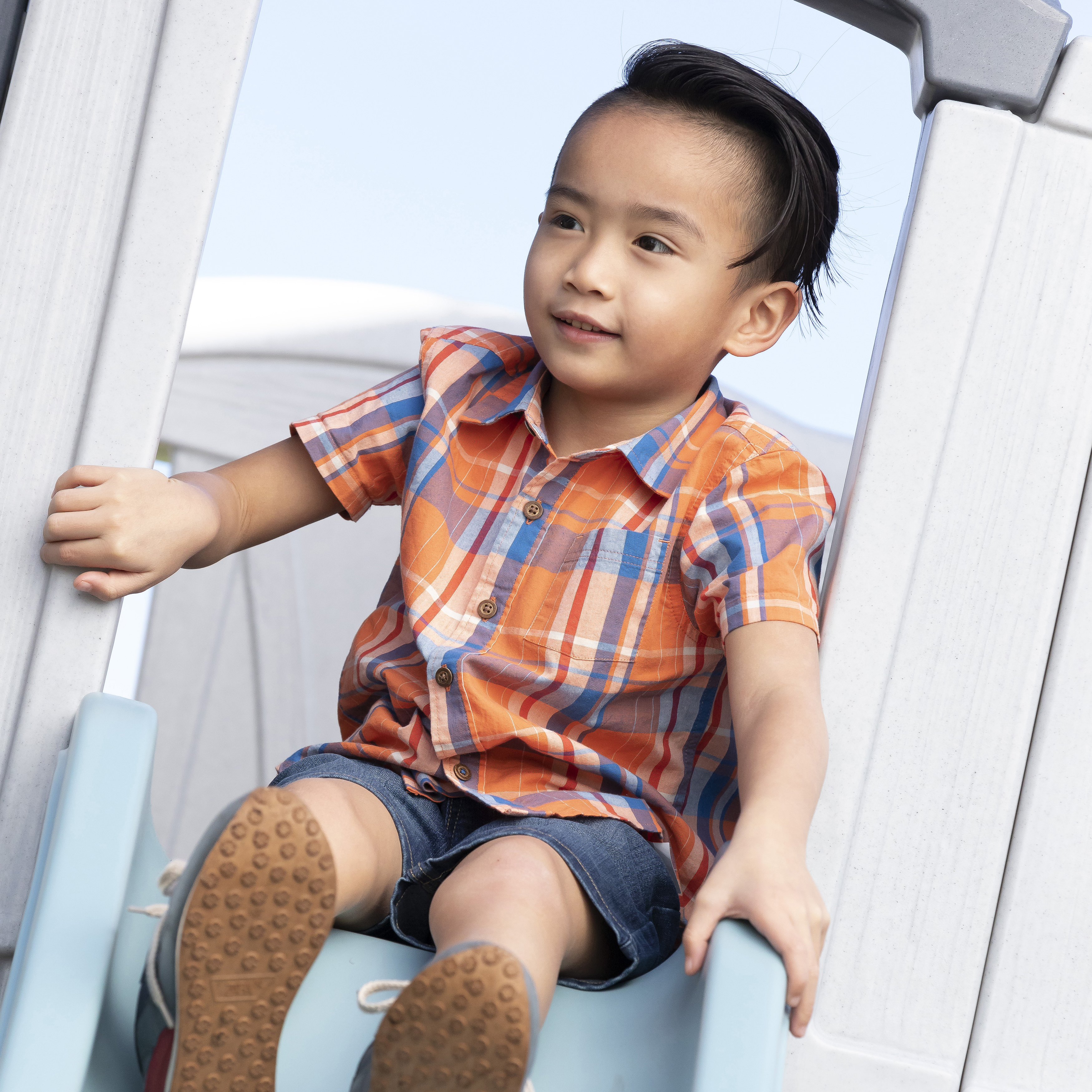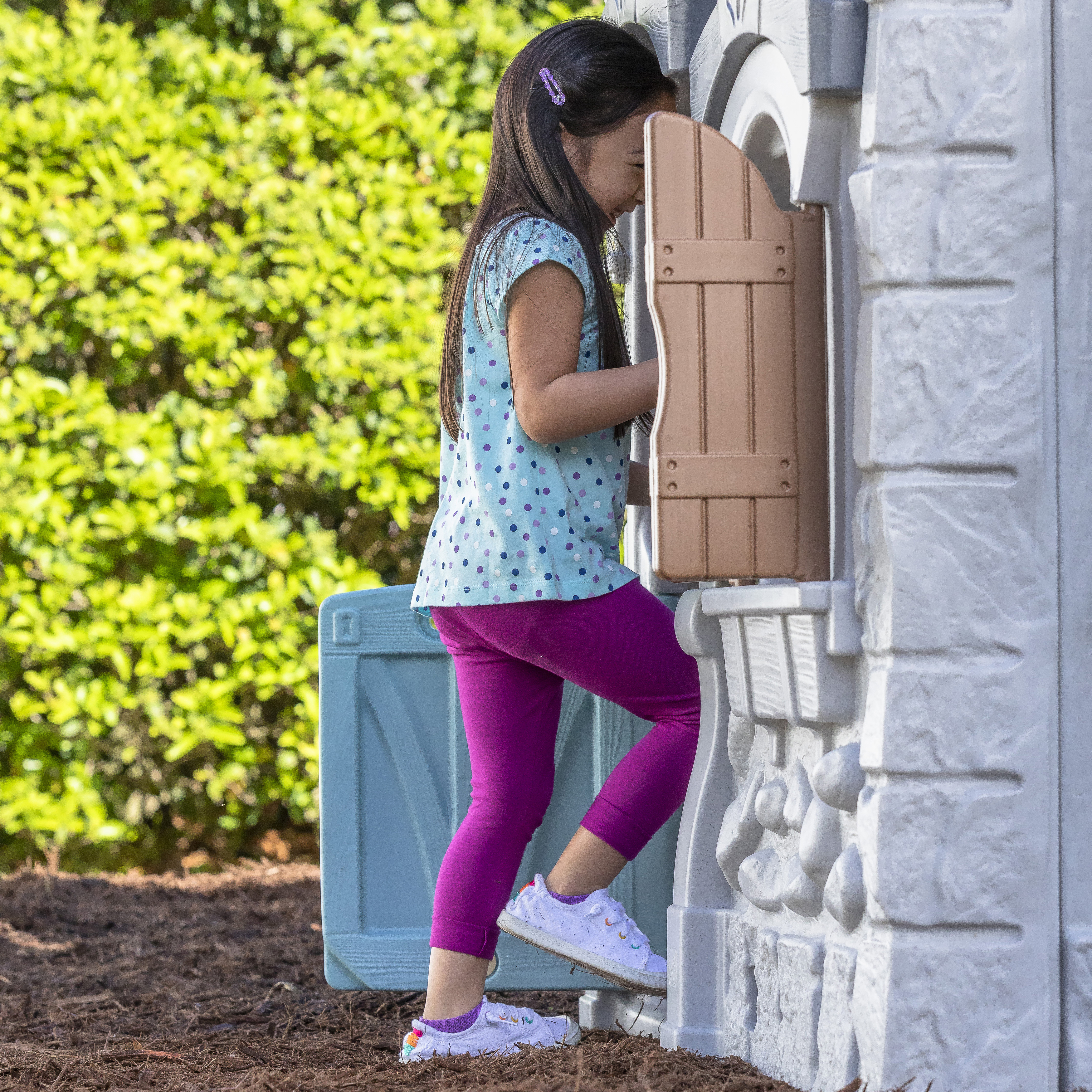 The Enchanting Adventures 2-Story Playhouse & Slide™ is the perfect backdrop for any adventure your little one dreams up. Their next enchanting adventure awaits with two stories for engaging social play, tons of storytelling, and pretend playtime fun with friends! From the indoor kitchenette to the top platform, slide, and more -- there’s something fun for everyone to do and so many pretend play opportunities in this charming kids playhouse. There’s a real working doorbell to let friends know it’s time to play and an inviting Dutch-style door that opens into the indoor kitchenette space with pretend oven, sink with faucet, and cooktop area to get cooking! Climb the built-in ladder to continue the fun outside on the top platform, complete with a quick getaway opportunity with the extra-long slide! Real working shutters along with the faux woodwork and stone accents add a charming storybook cottage look to this outdoor playhouse for toddlers.