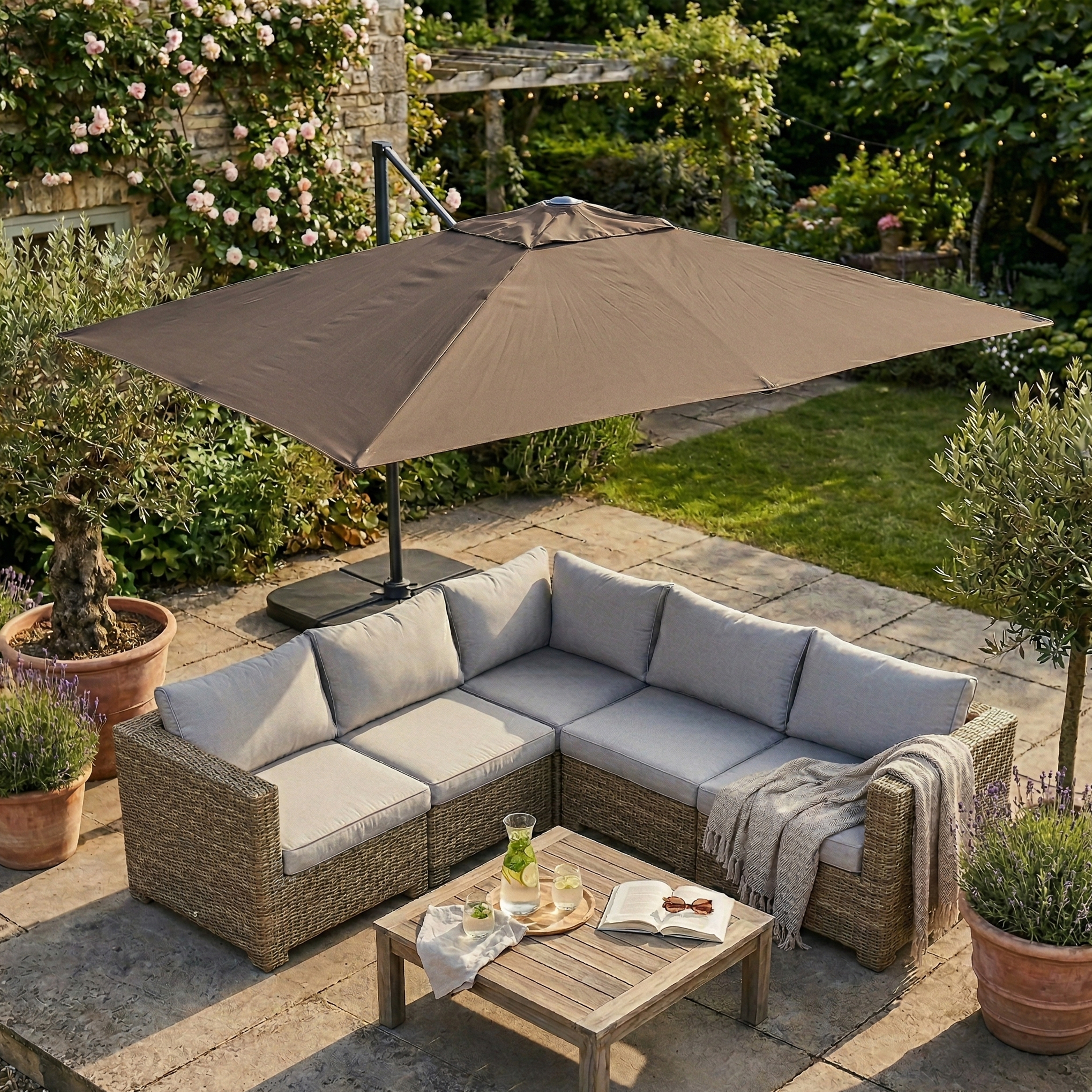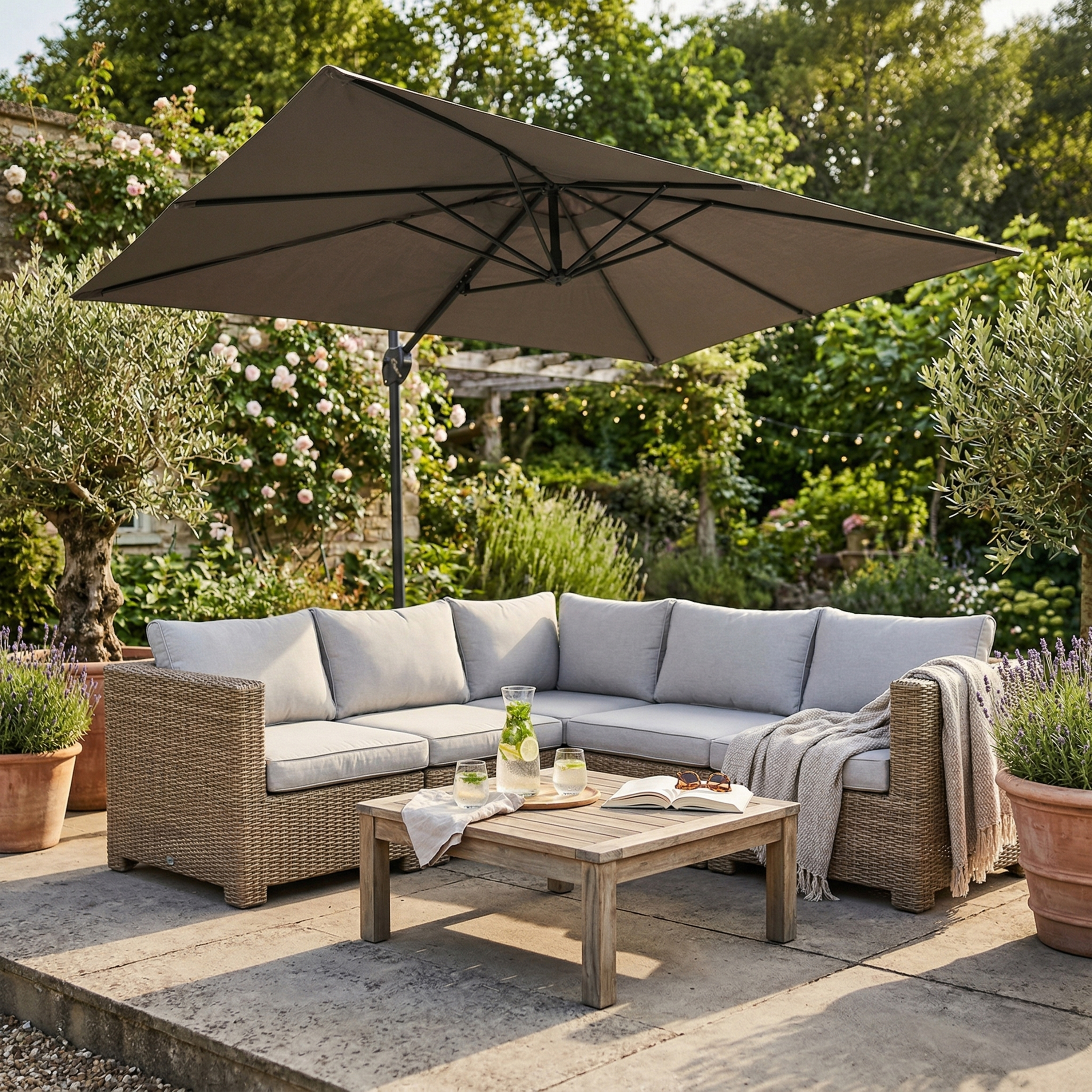 The Luma parasol features a cantilever design, with the pole positioned at the side. This means you have full use of the space underneath for your garden furniture. No obstacles in the middle, just an open and flexible seating area. Ideal for both compact terraces and larger gardens.