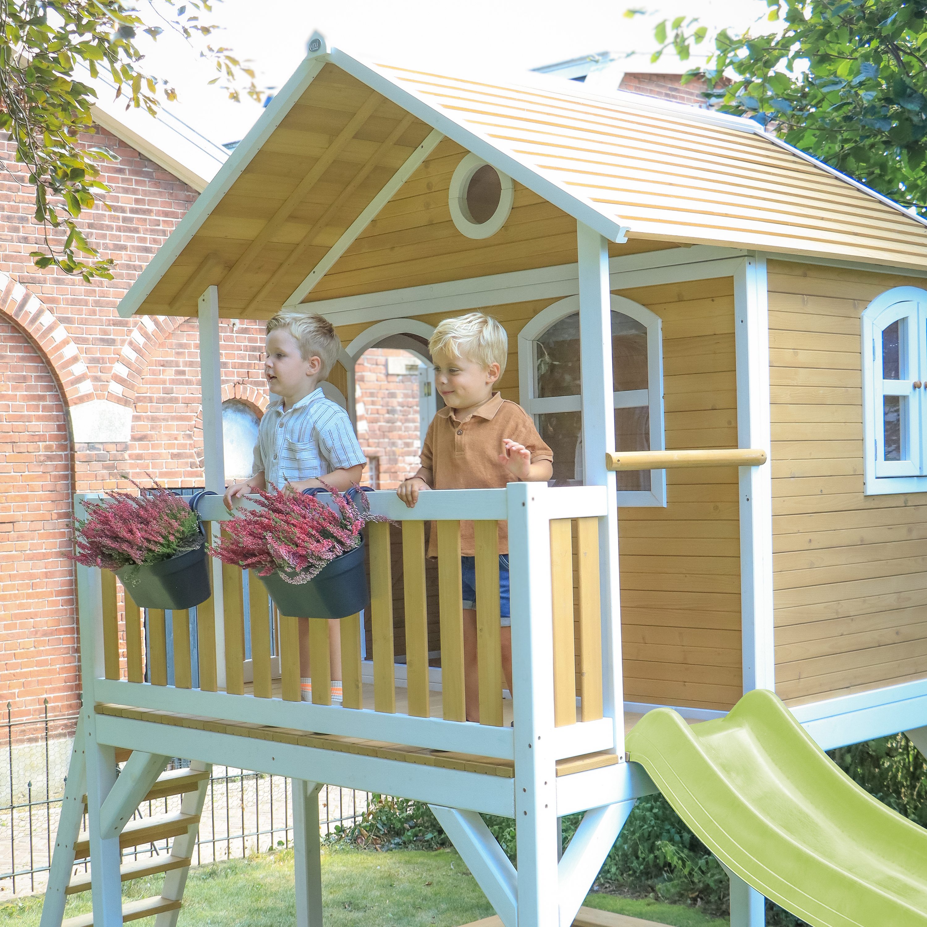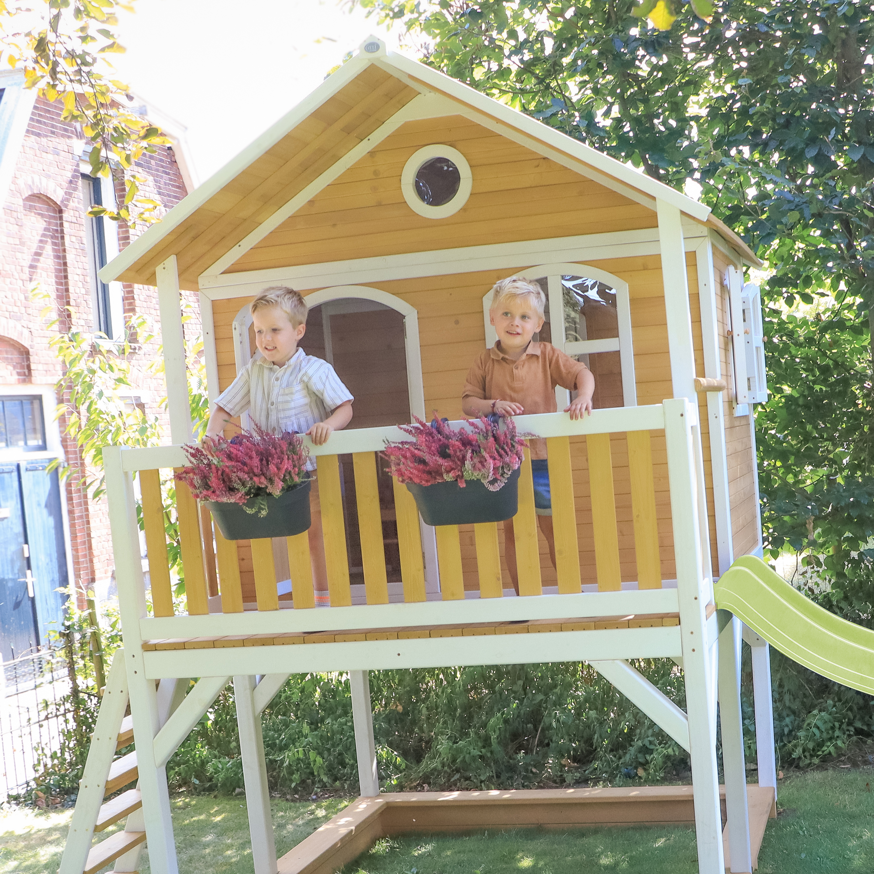 The Marc Playhouse Brown/White from AXI really has everything your children could wish for! A ladder to climb into the cottage and then go down the long slide. And then they are not finished yet, because there is also a sandbox under the playhouse where they can all bake sand cakes together. In this playhouse they can tell each other the best secrets. As soon as they close the windows and door, nobody can listen to them anymore! Marc is a versatile wooden playhouse with a semi-circular door and windows. The door has a letter box where children can throw mail through when they play letter carrier. The playhouse is executed in modern brown/white colours which fits perfectly in any contemporary garden. Marc playhouse has a platform height of 118 cm and is equipped with a large slide of 228 cm long. The ladder and slide can be attached both on the left and on the right. When the children have finished playing, the sandbox can easily be covered with the supplied cover.