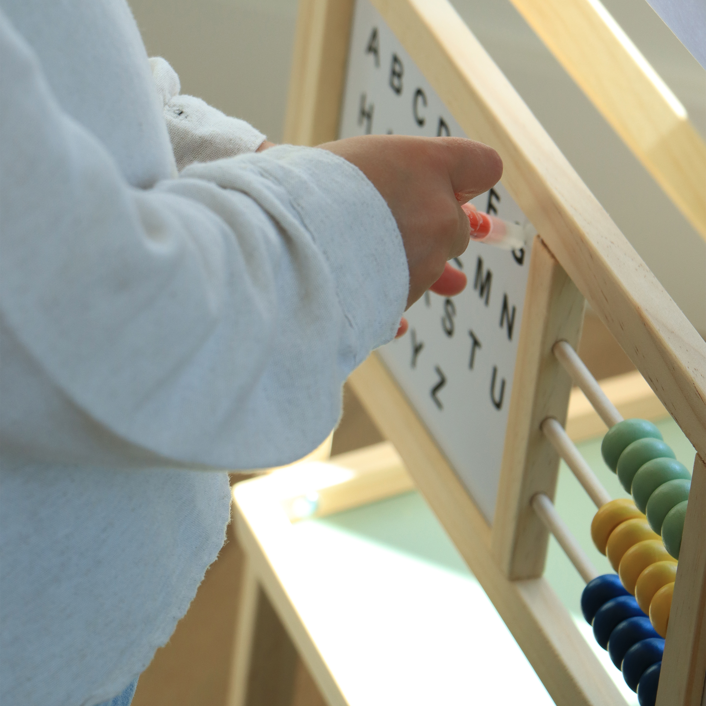 The Nola Activity Easel is more than just an easel. It turns learning through play into even more fun: counting beads for basic maths, a clock for learning to tell time, and a magnetic board to explore the alphabet. A great mix of play and learning!