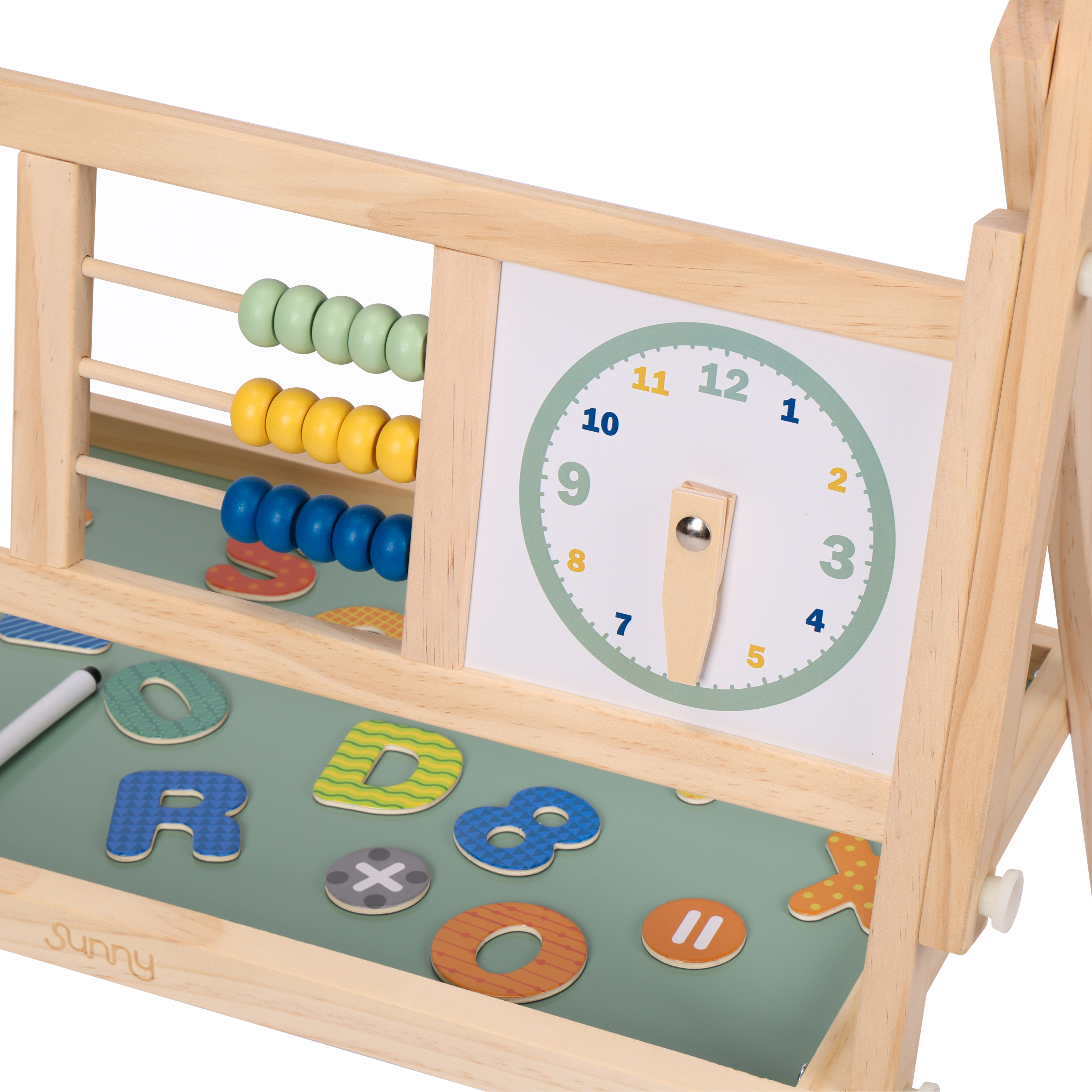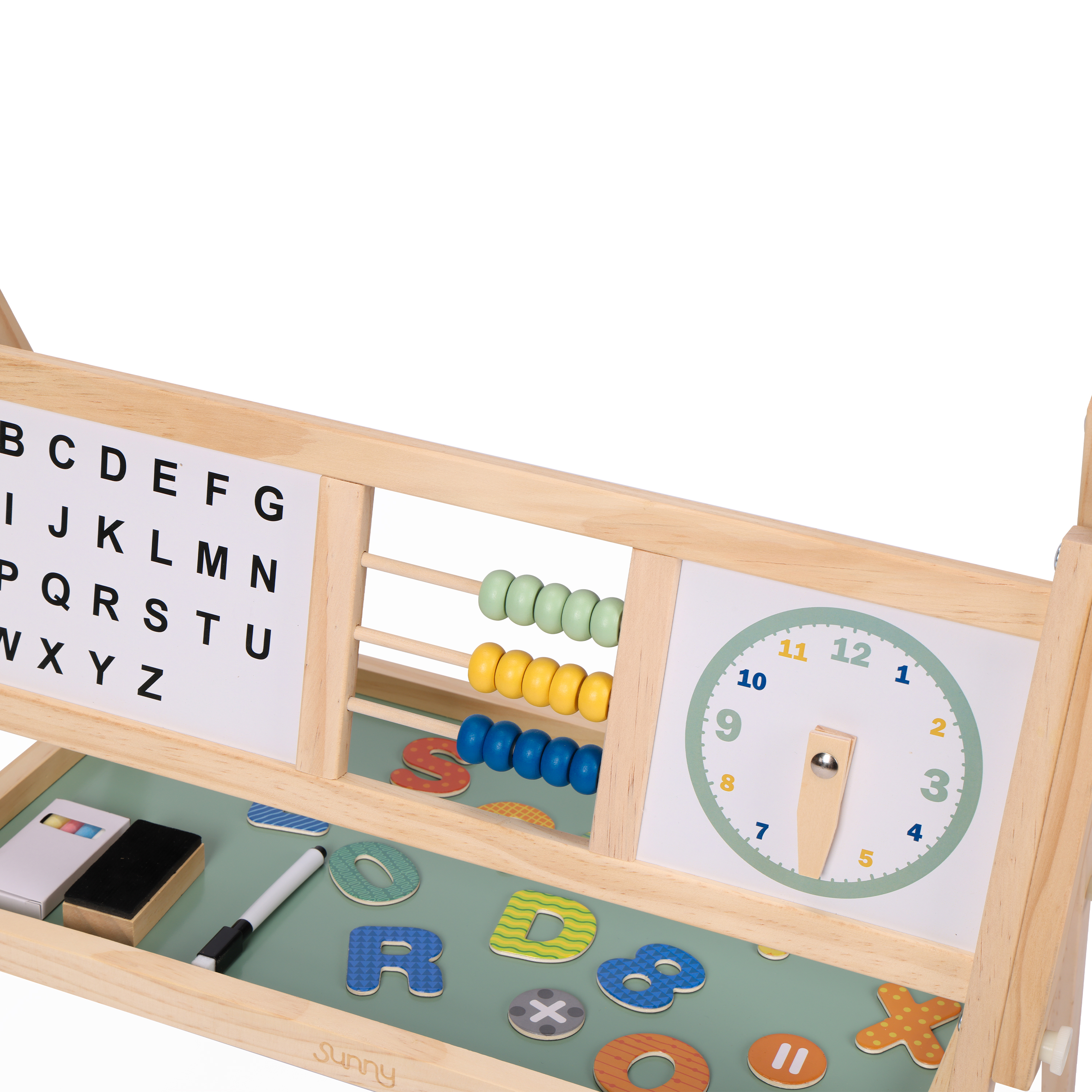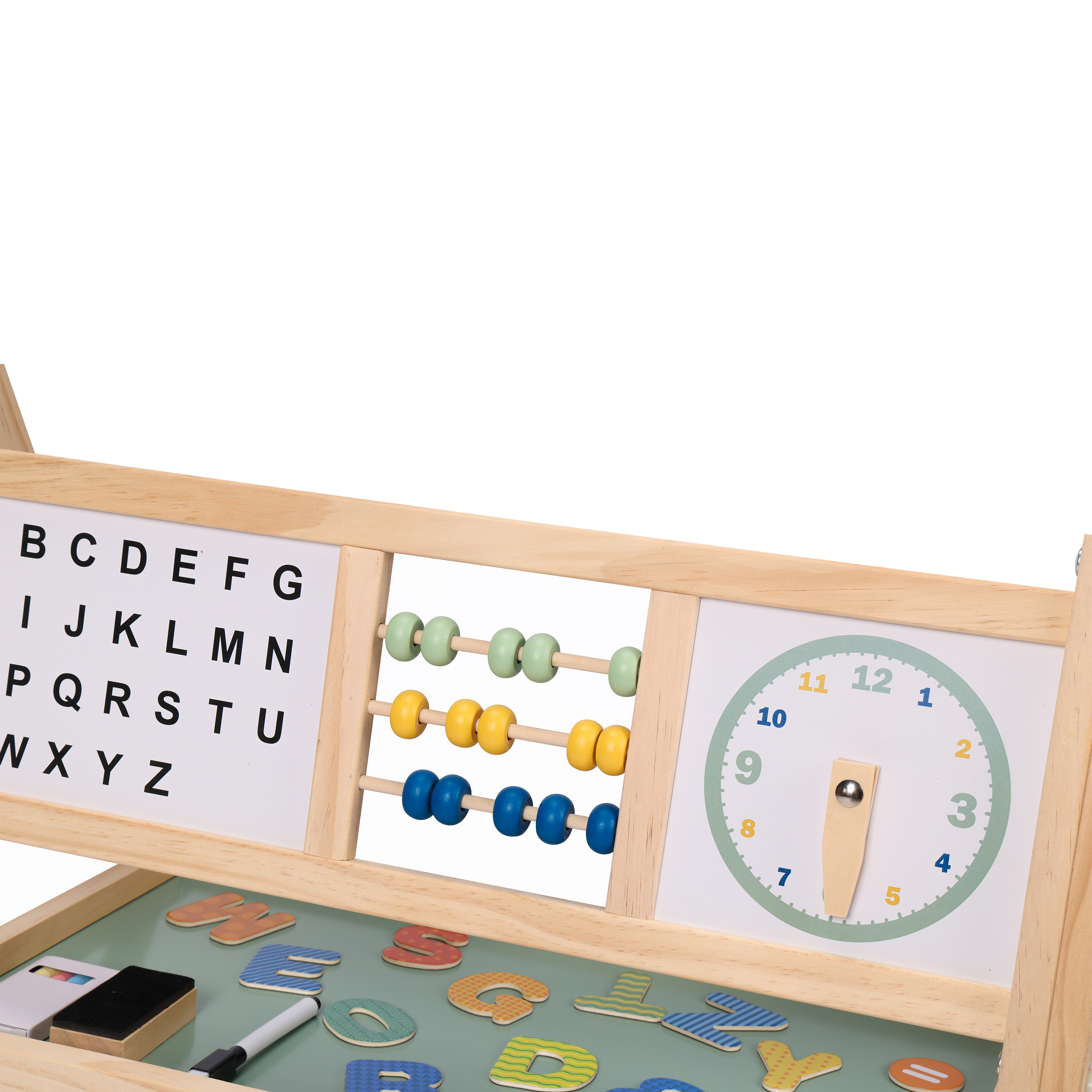 - Includes abacus, clock and alphabet board for fun learning.