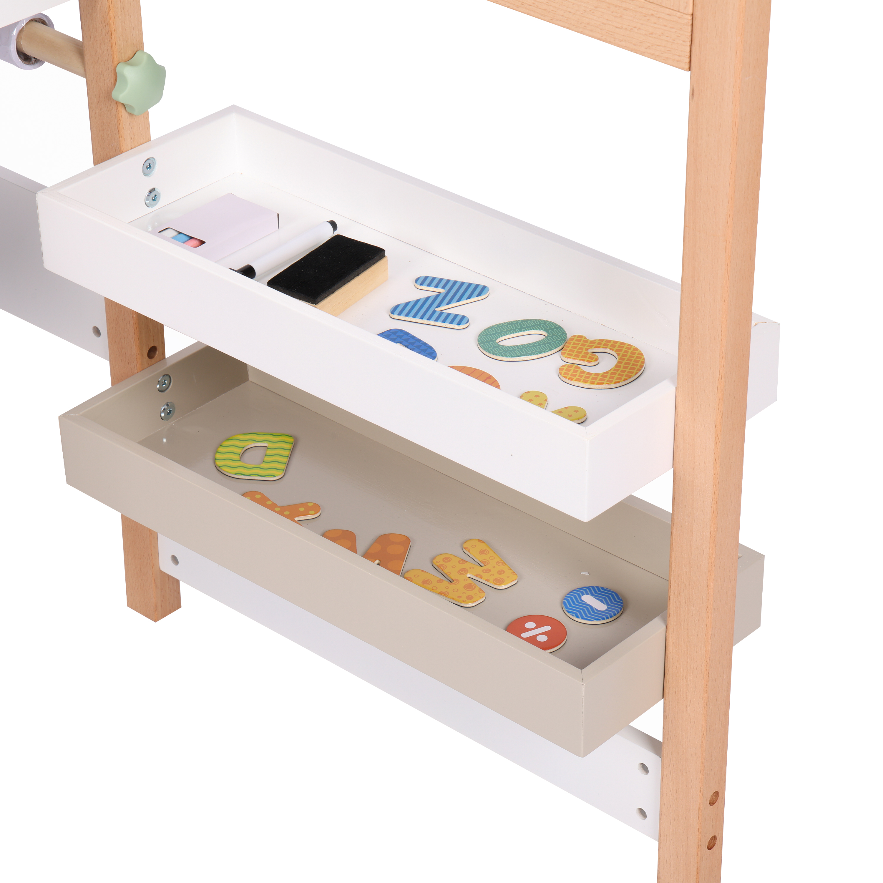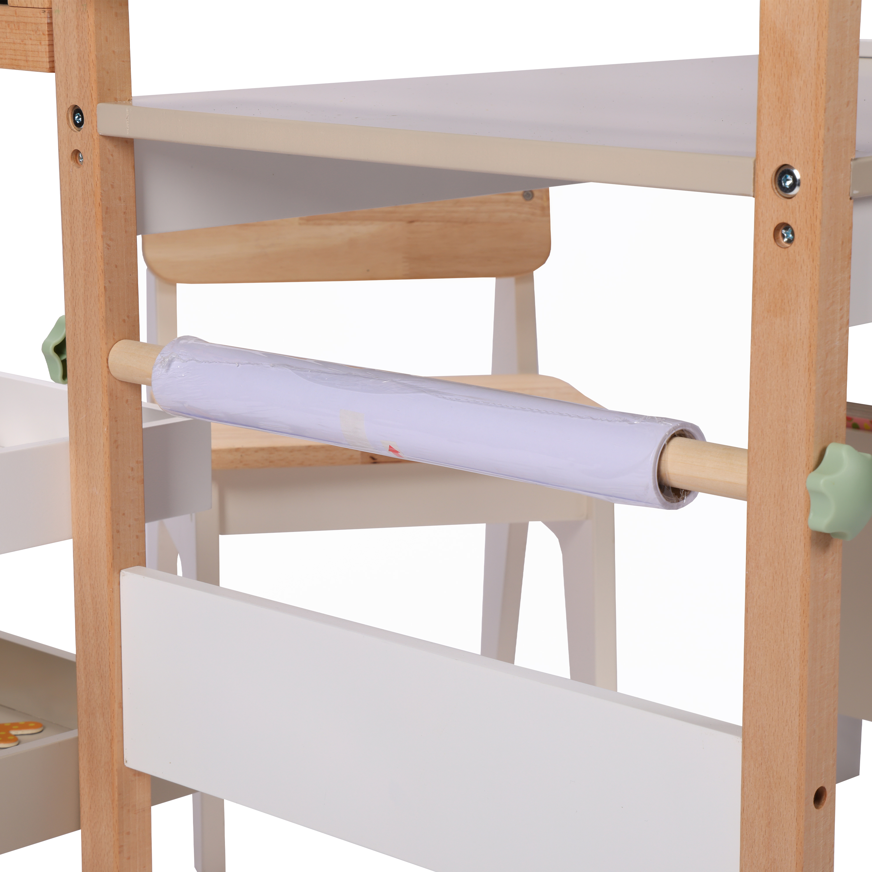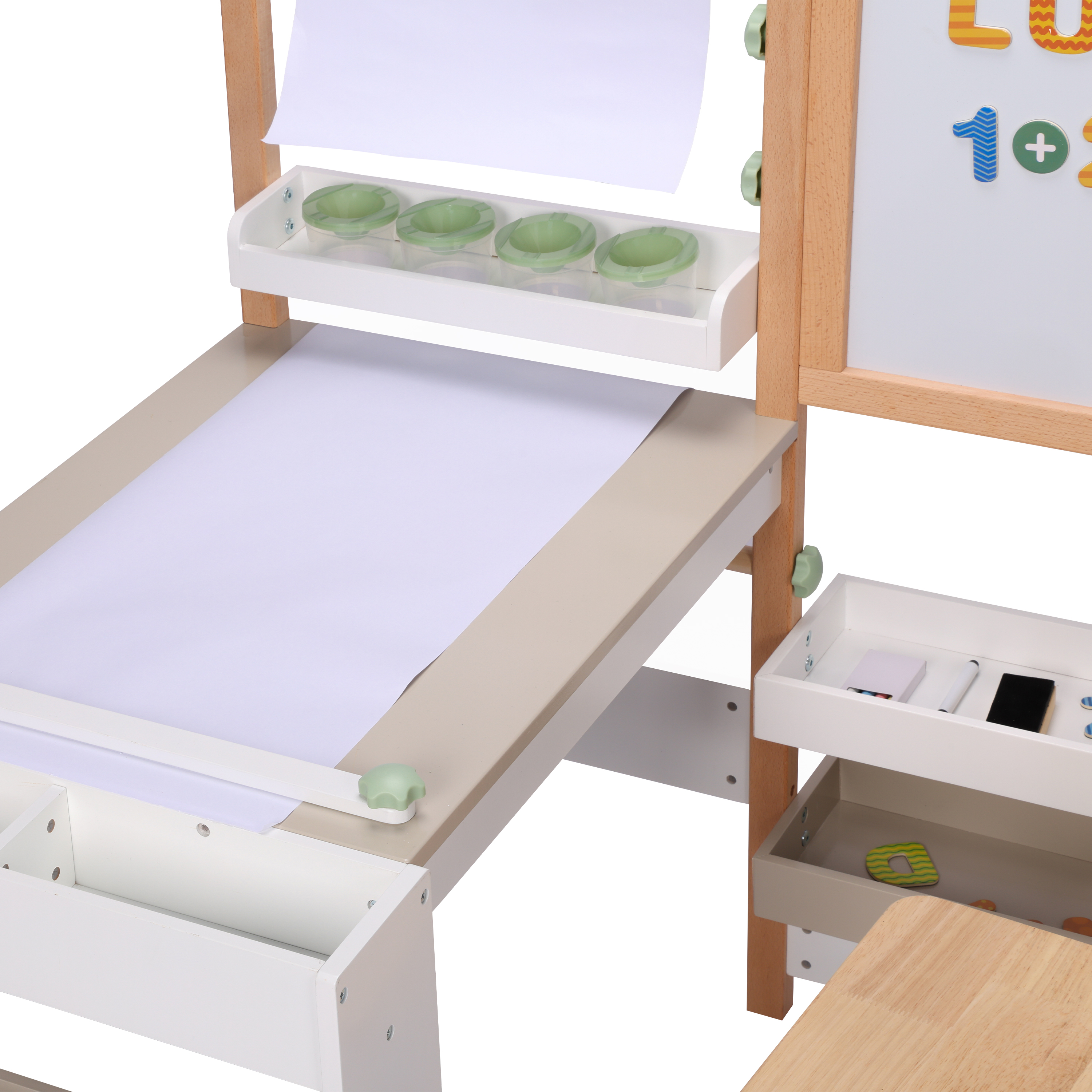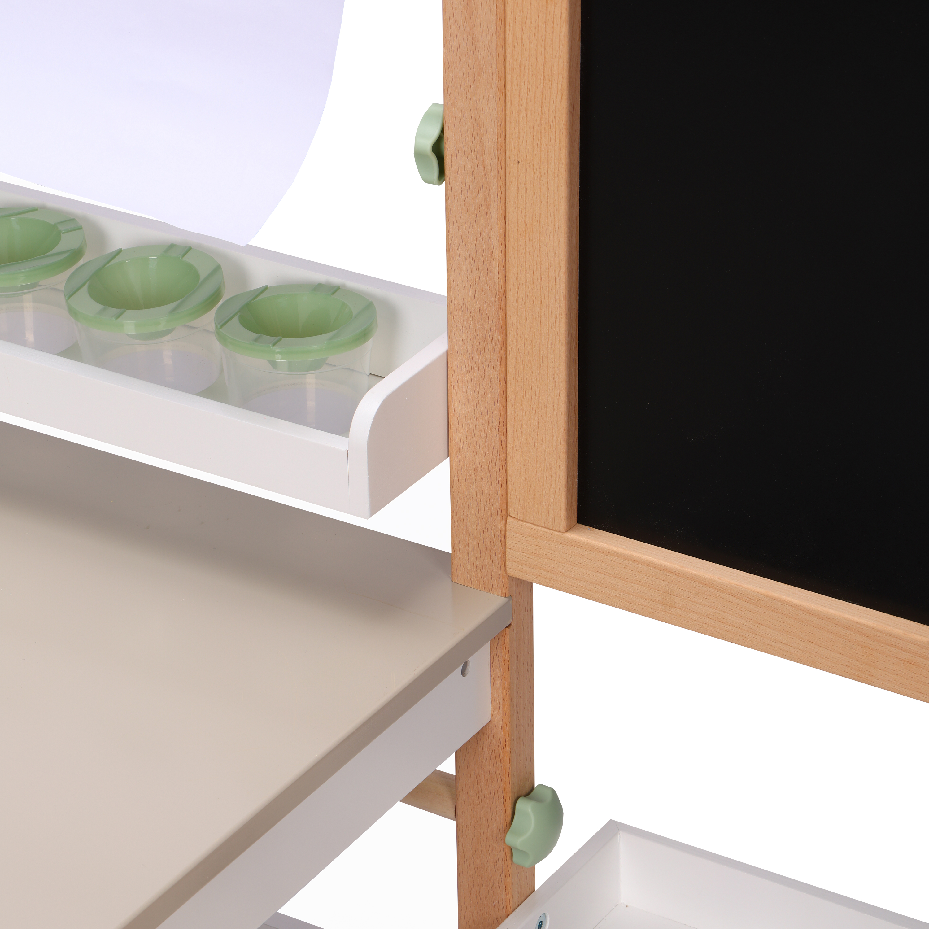 - Magnetic whiteboard, chalkboard and paper roll for endless creative fun.