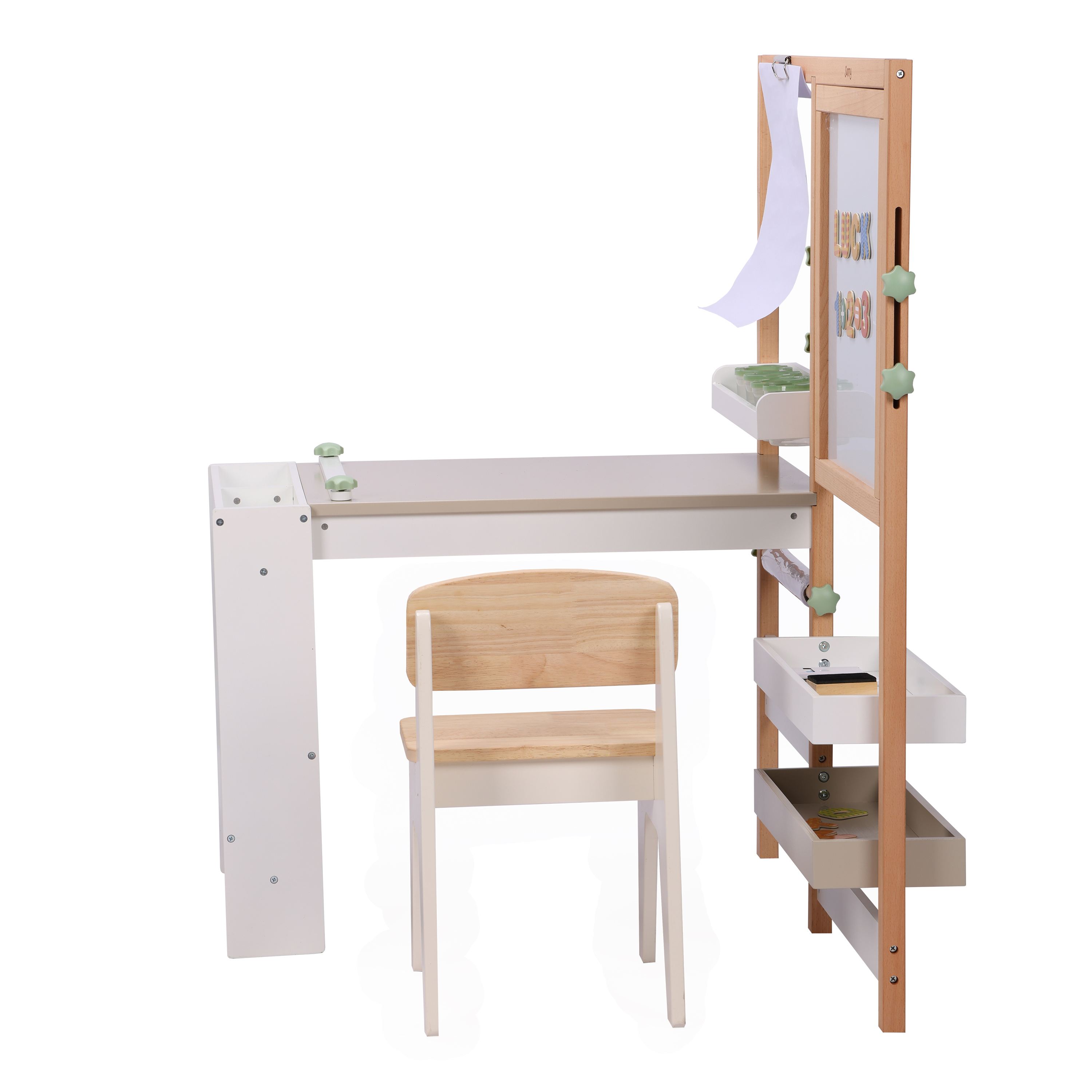 The Sunny Olivia Drawing and Craft Table also includes a matching chair. Comfortable and sturdy, so your child can draw, write or read for hours. Thanks to its timeless wooden design, this creative furniture fits beautifully in any playroom or living room.
