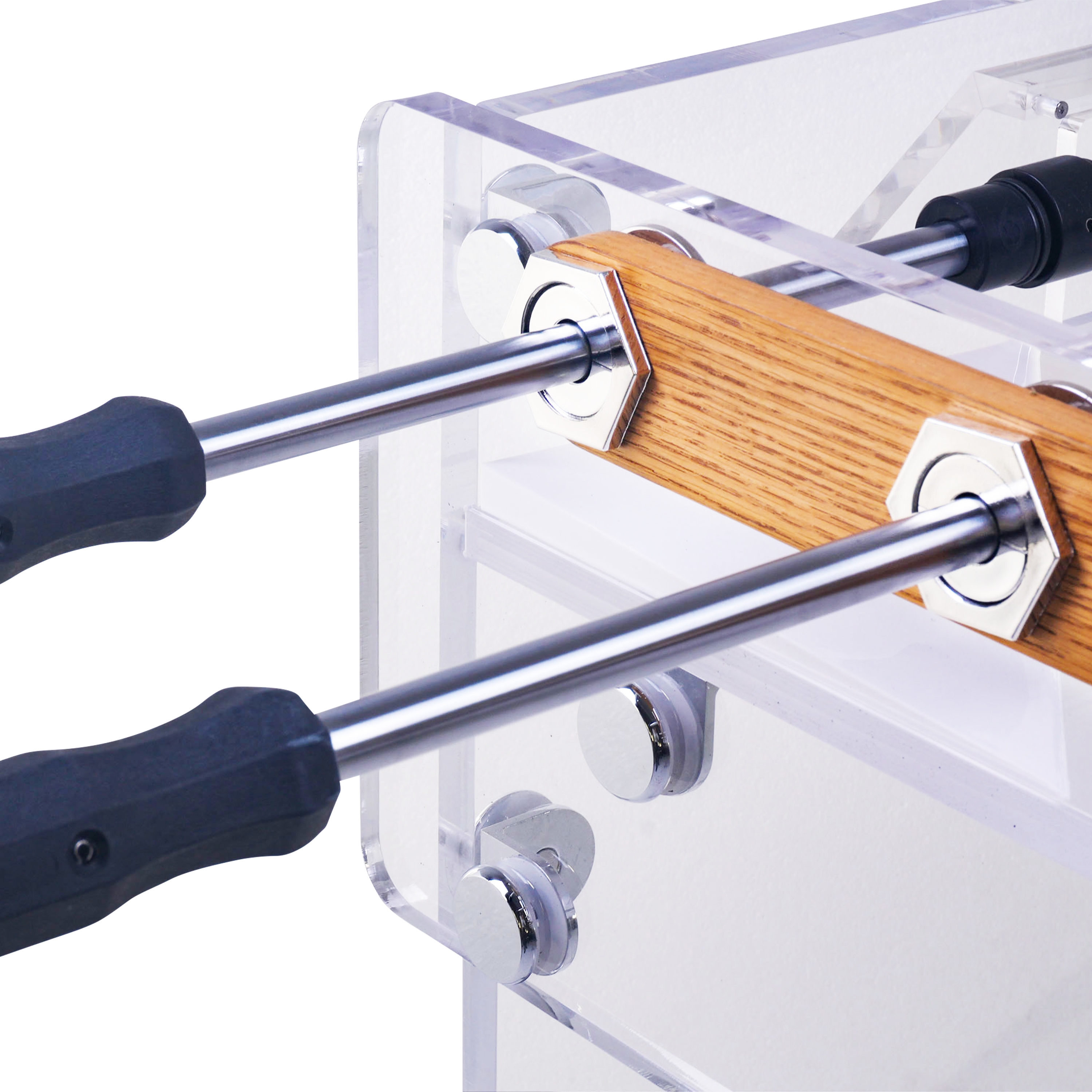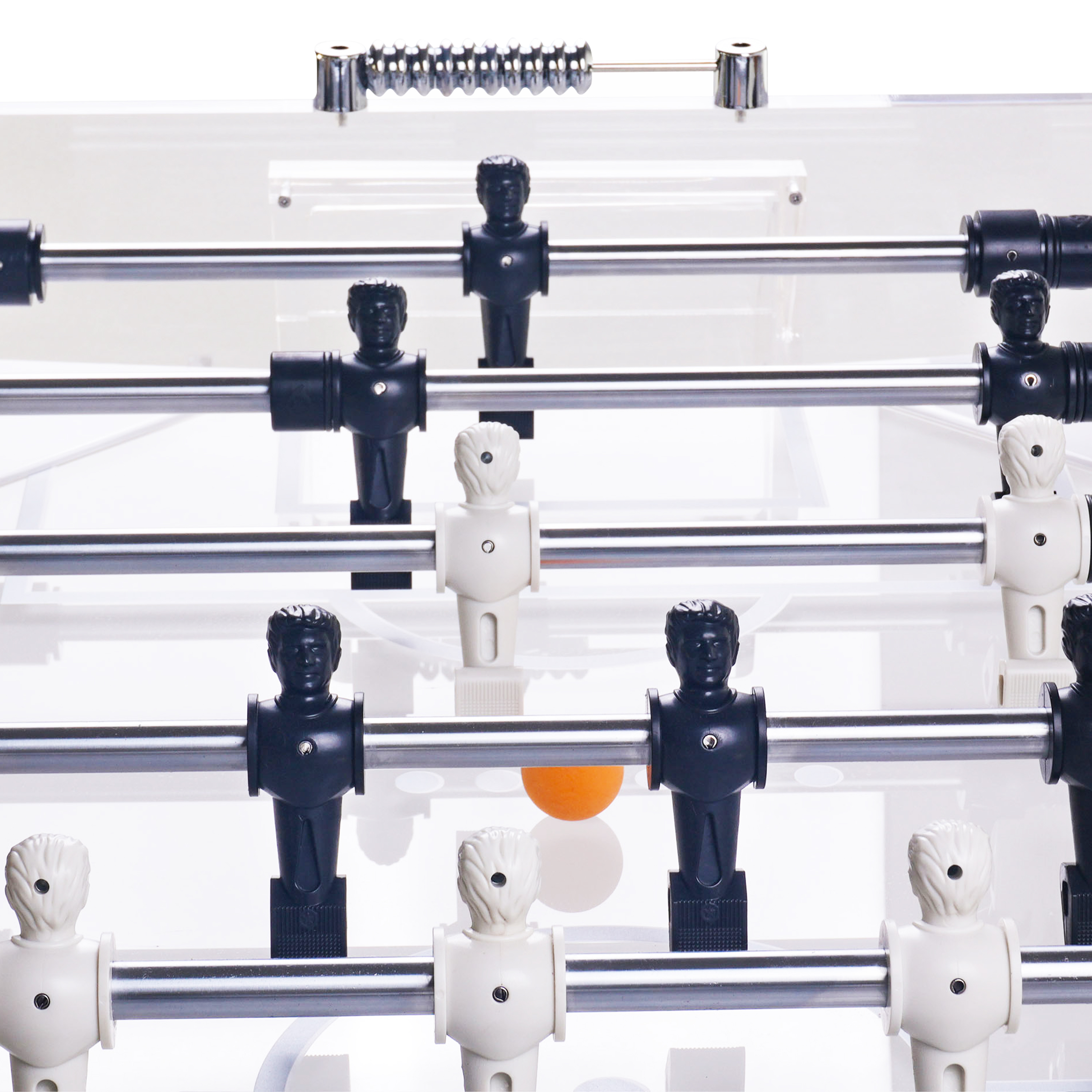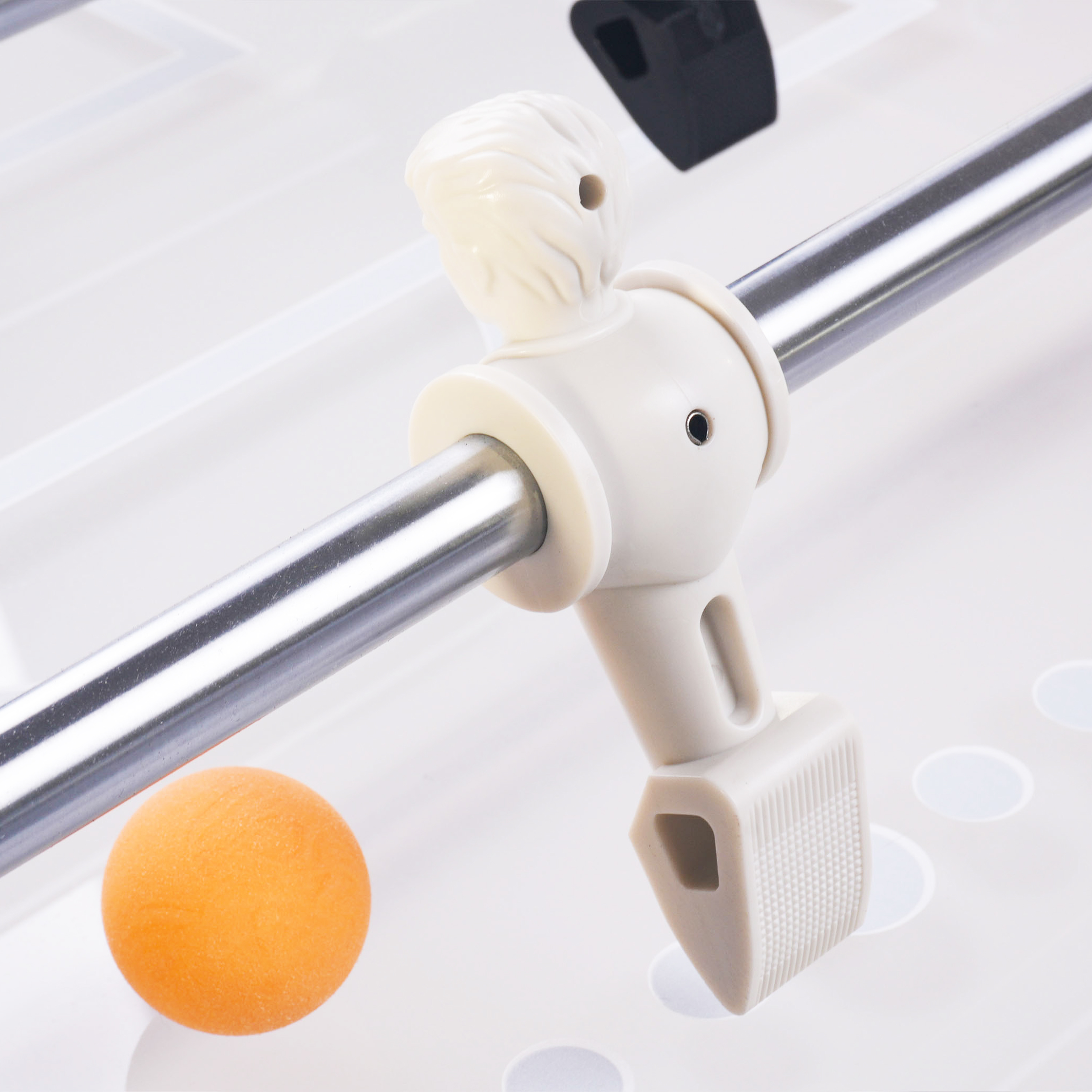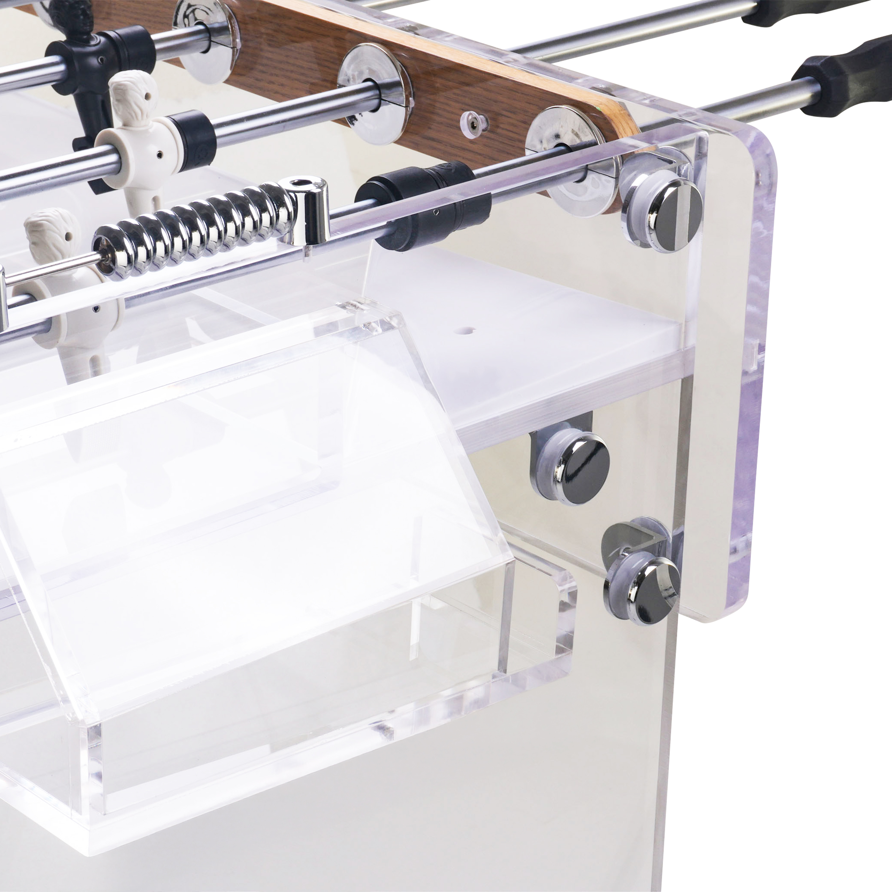 The 18 mm thick frosted acrylic playing field gives extra grip and quick ball control. The raised corners keep the game moving. And with inner dimensions of 120 x 68 cm you’ve got plenty of space for tactics, speed and spectacular goals.