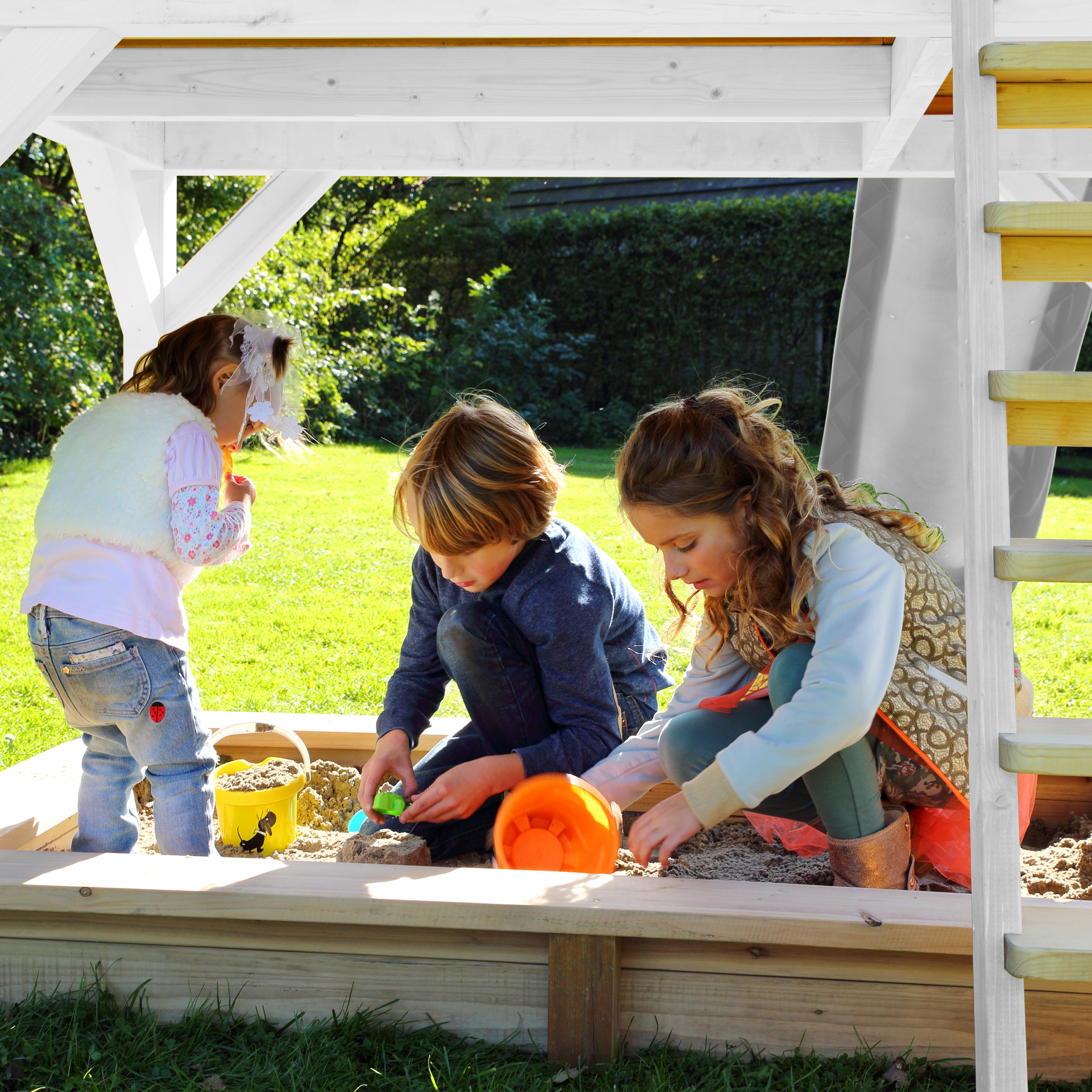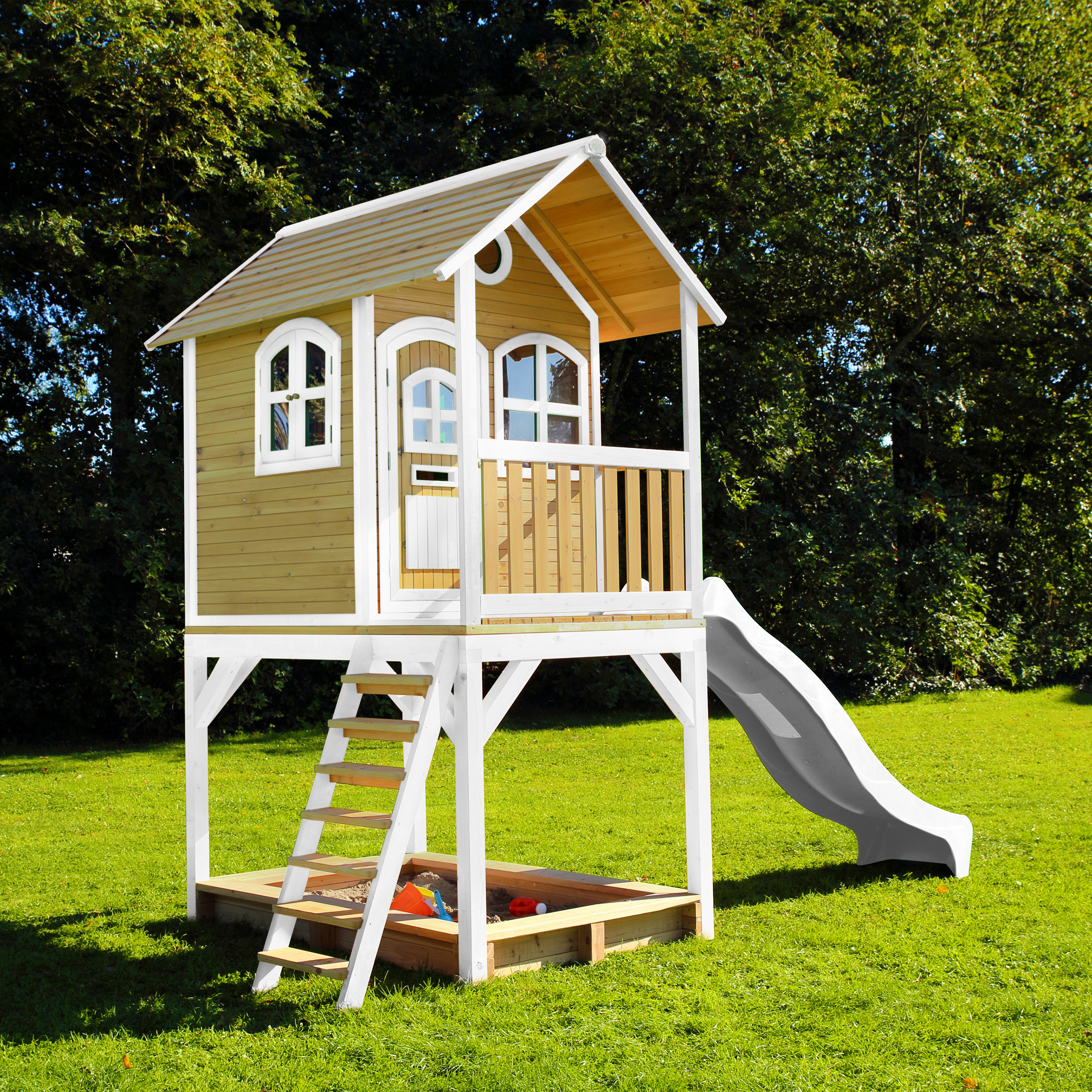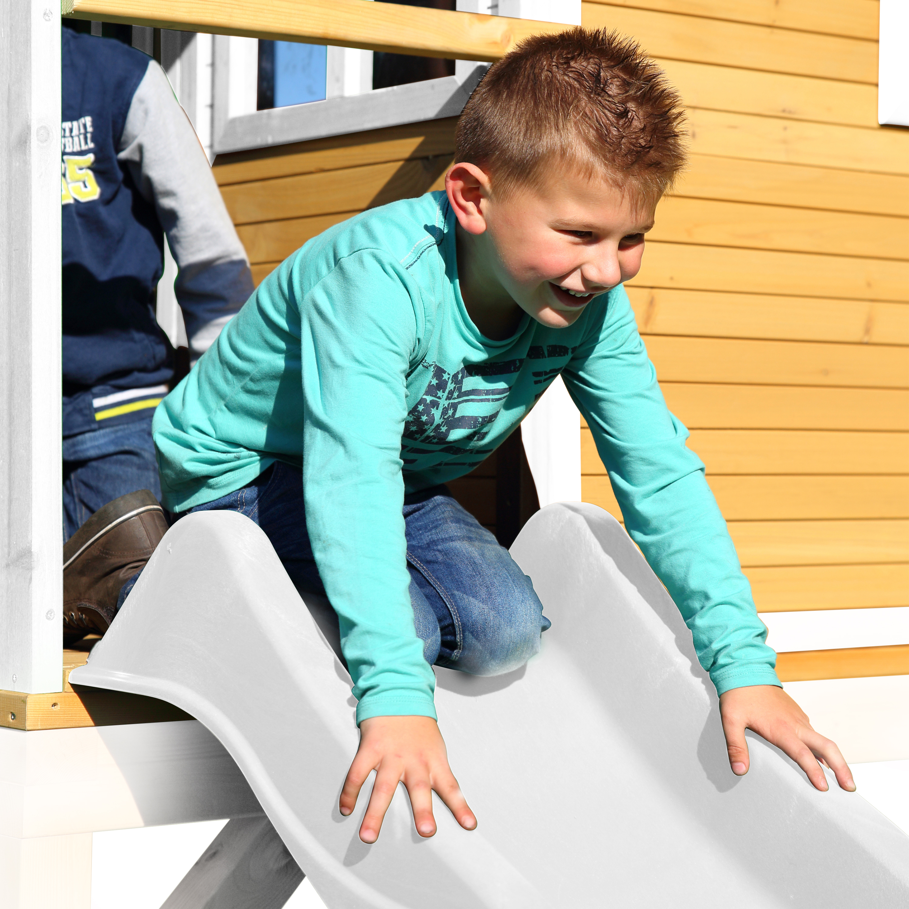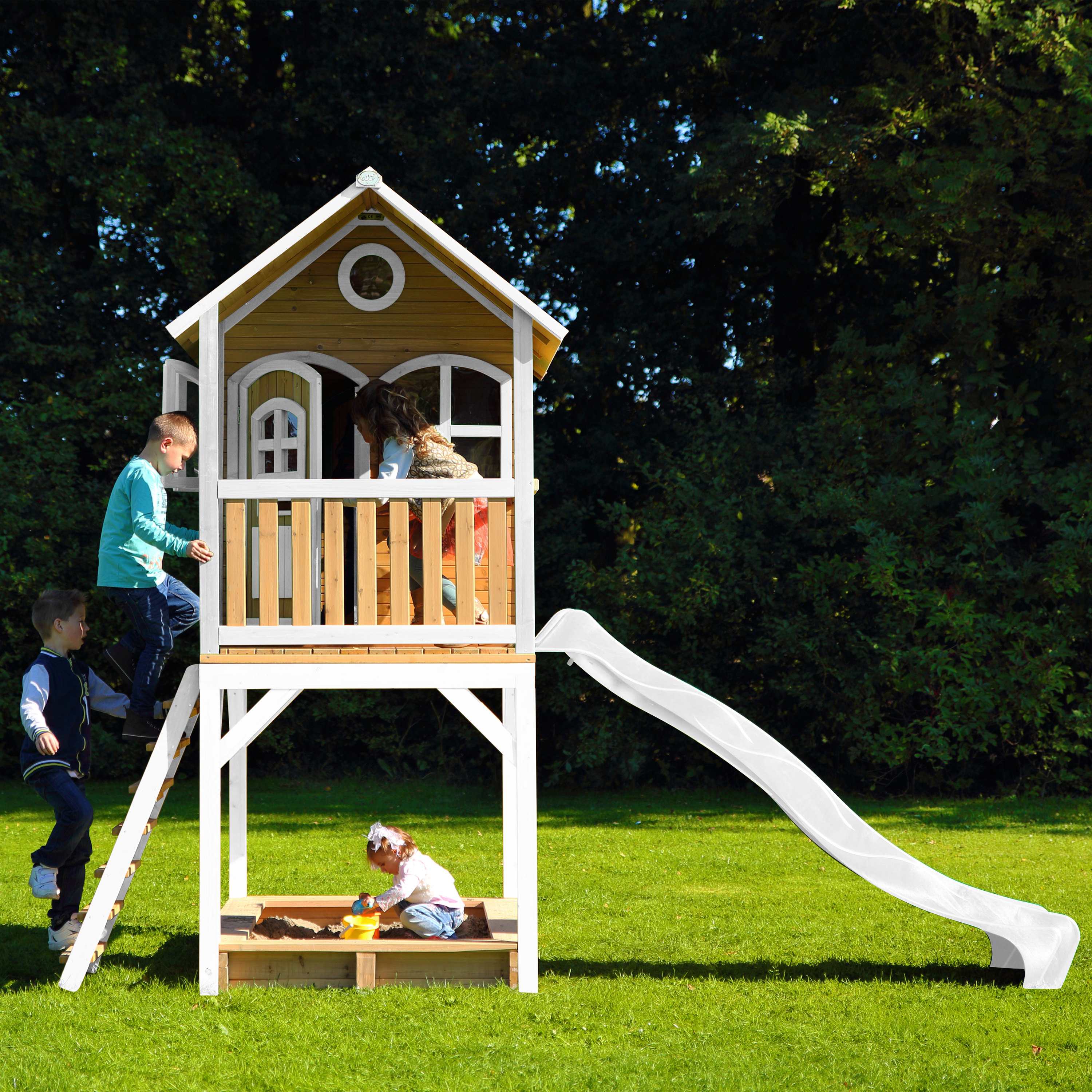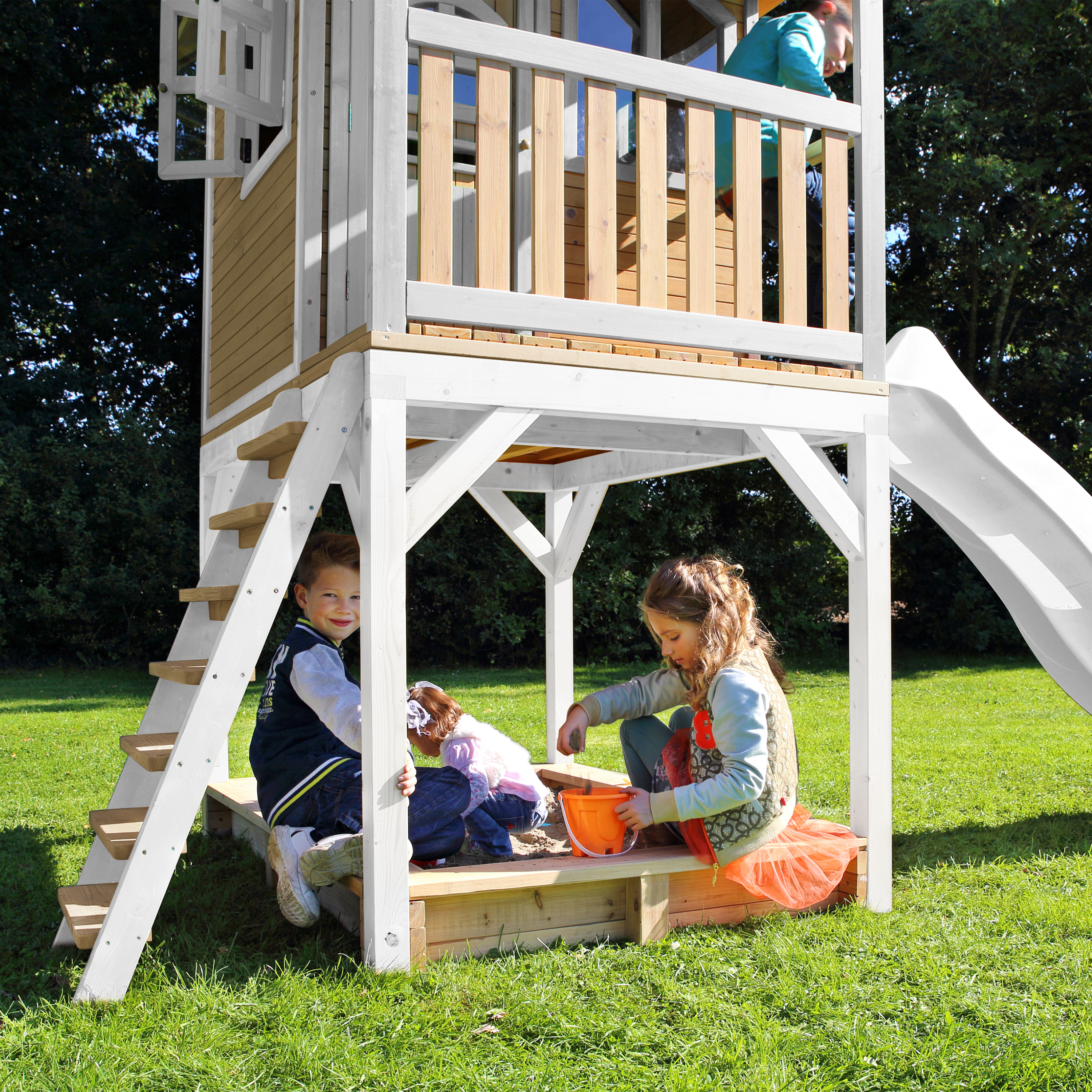 The Sarah Playhouse Brown/White from AXI really has everything your children could wish for! A ladder to climb into the cottage and then go down the long slide. And then they are not finished yet, because there is also a sandbox under the playhouse where they can all bake sand cakes together. In this playhouse they can tell each other the best secrets. As soon as they close the windows and door, nobody can listen to them anymore! Sarah is a versatile wooden playhouse with a semi-circular door and windows. The door has a letter box where children can throw mail through when they play letter carrier. The playhouse is executed in modern brown/white colours which fits perfectly in any contemporary garden. Sarah playhouse has a platform height of 118 cm and is equipped with a large slide of 228 cm long. The ladder and slide can be attached both on the left and on the right. When the children have finished playing, the sandbox can easily be covered with the supplied cover.