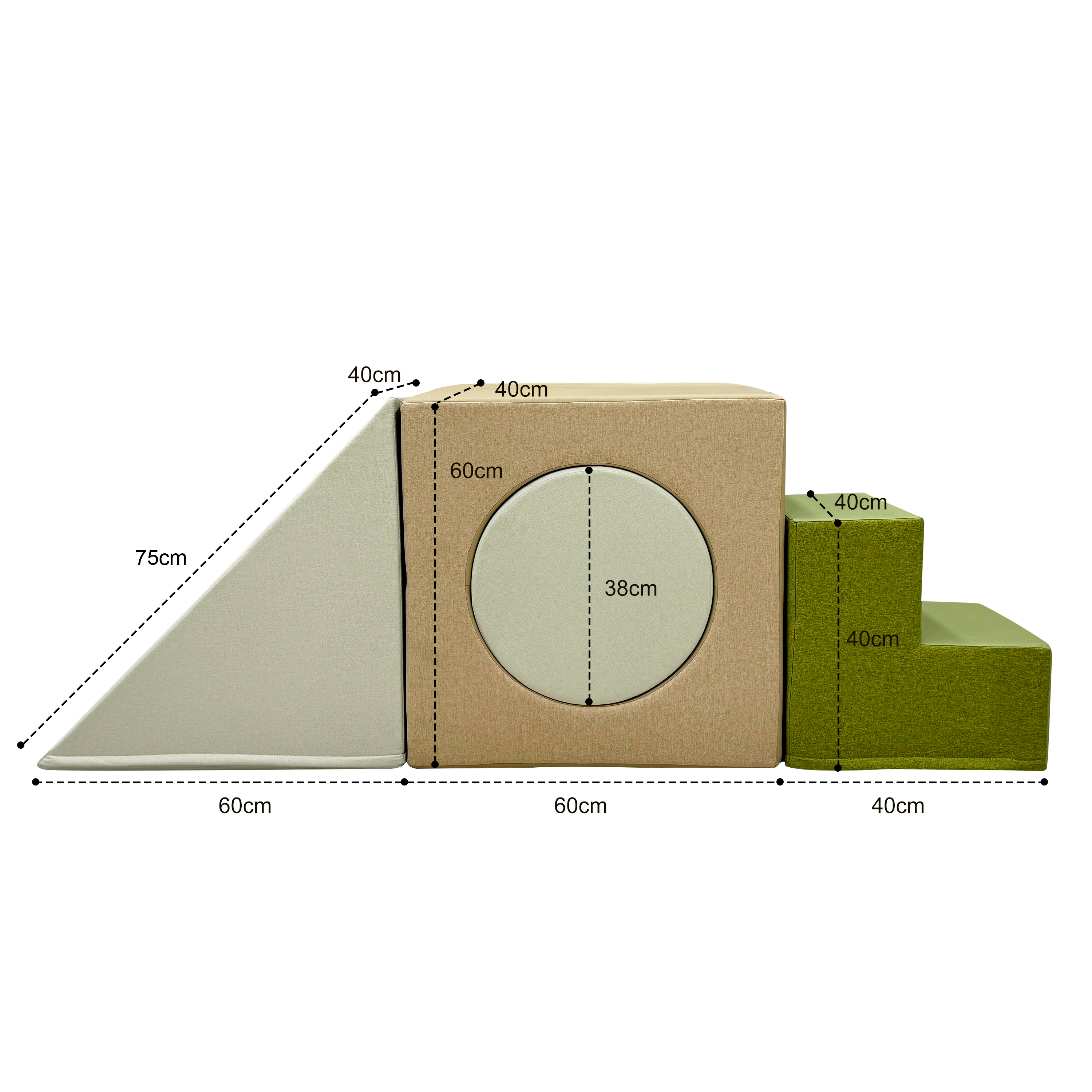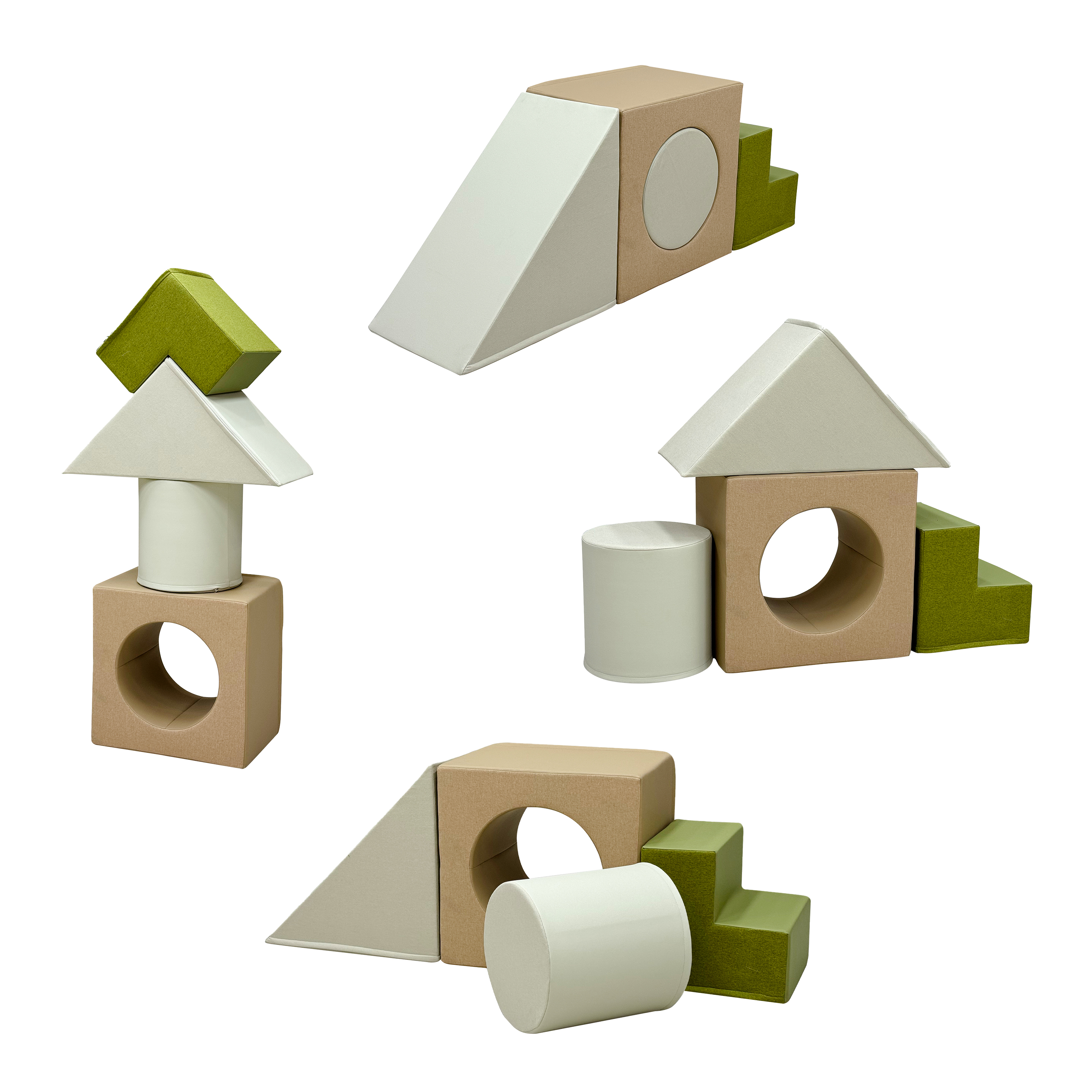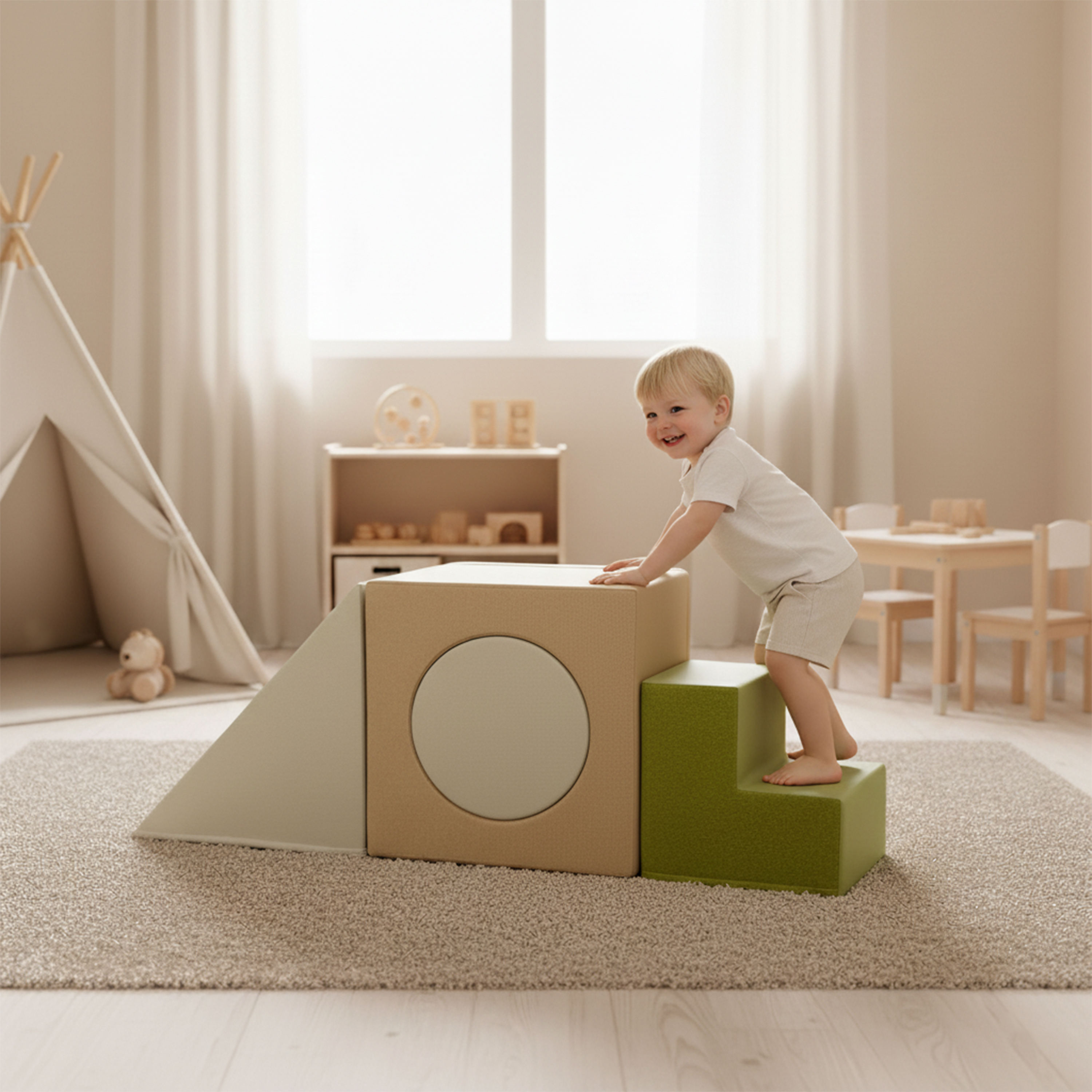 - 4‑piece set of foam play blocks in calm natural tones (stair, ramp, tunnel block and cylinder).