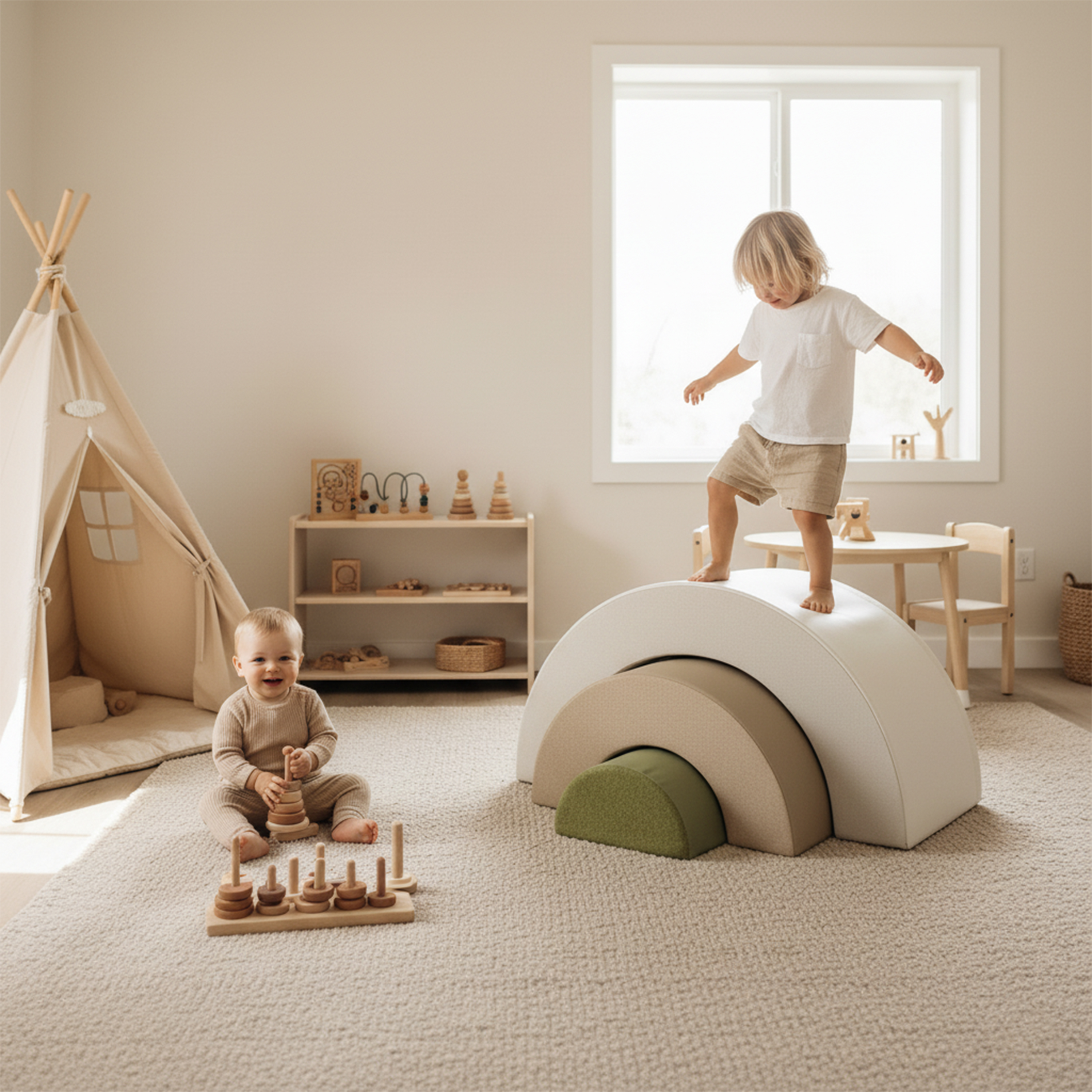 Play, discover and build: with the Sunny Seli Rainbow Foam Blocks, your little one can do it all. The set includes three soft arches made of sturdy foam that together form a cheerful rainbow. Perfect for climbing over, crawling under or turning into a bridge or tunnel for teddies and toy cars. Maybe today the biggest arch becomes a mountain, the middle one a slide and the smallest one the entrance to a secret cave. With these blocks, every play moment becomes a new adventure. The soft design and calm natural colours fit beautifully in any living room or playroom.