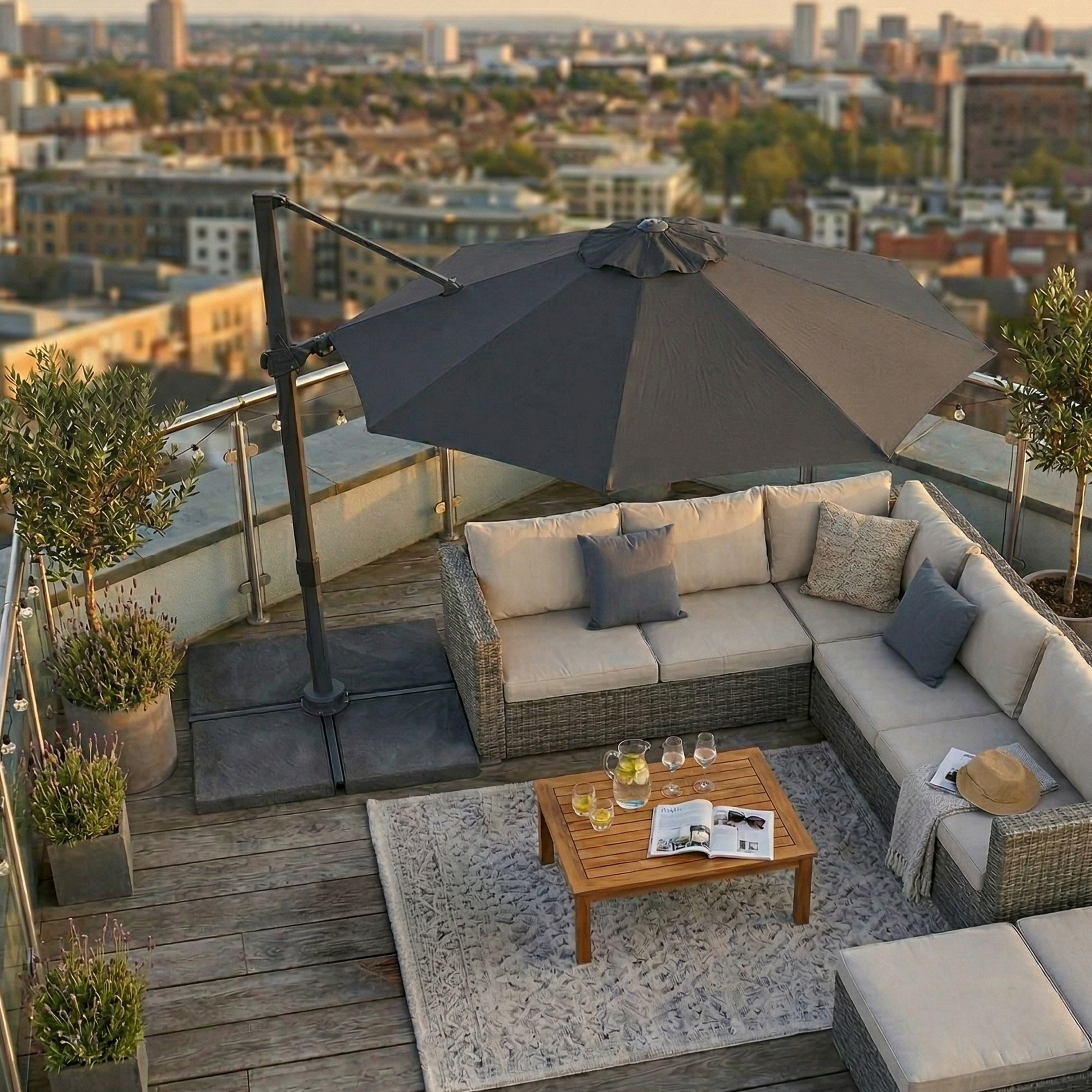 Thanks to the smart cantilever design, there is no pole in the middle. This keeps the space under the umbrella completely free, allowing you to position your garden furniture exactly how you like. Ideal for a lounge set, dining table or sunbeds. The round canopy also creates a soft, harmonious look that fits perfectly in both modern and classic gardens.