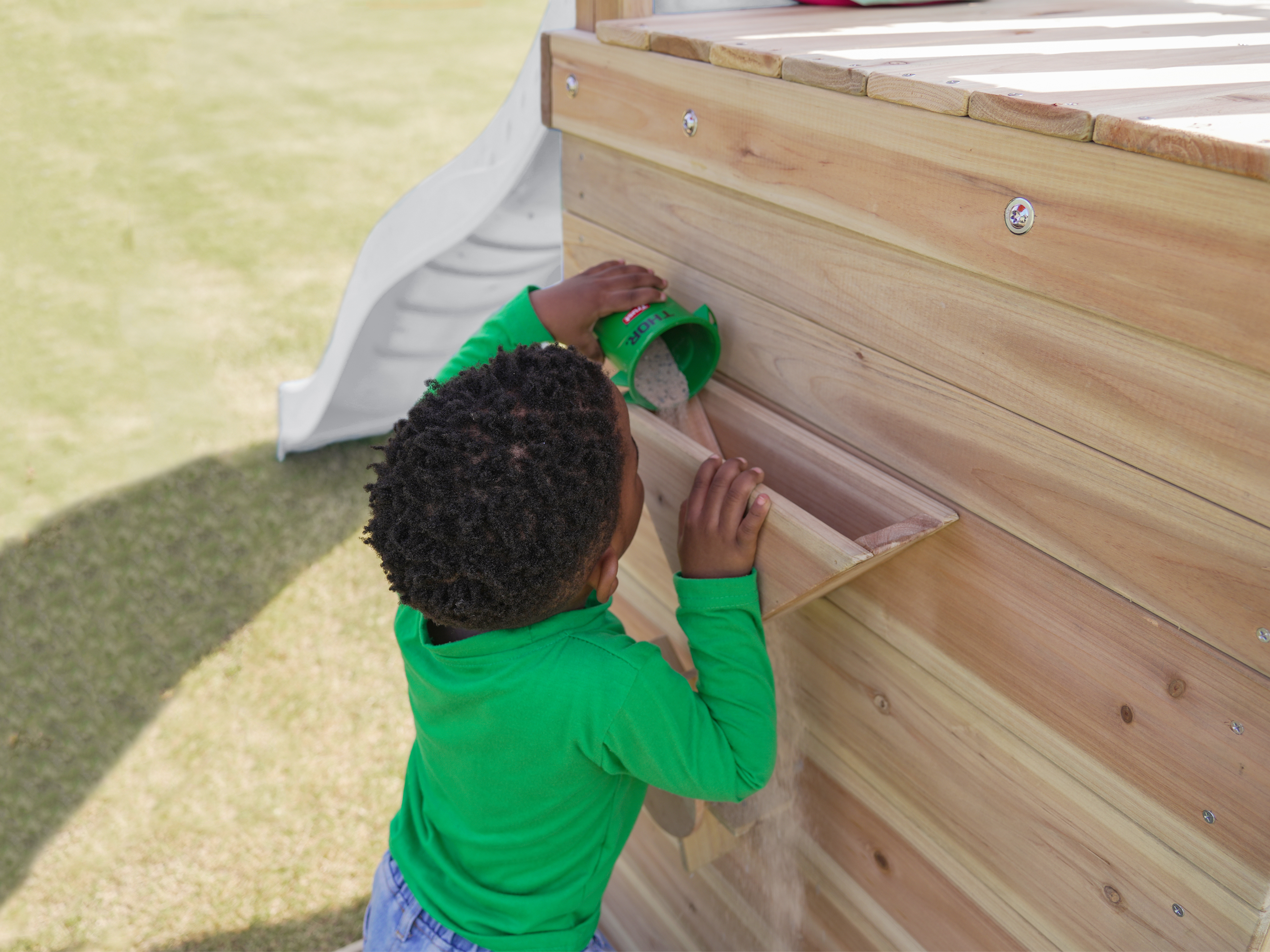 En empruntant l'escalier, les enfants accèdent à la tour, d'où ils ont une vue imprenable sur l'ensemble du jardin. Lorsqu'il est temps de descendre, le long toboggan offre une descente rapide et sans effort. Le toboggan est équipé d'un raccordement à l'eau qui peut être facilement percé. Vous pouvez ainsi profiter de l'eau pendant les journées chaudes et ensoleillées ! À côté de l'aire de jeux se trouve un bac à sable avec un mur de jeu spécial recouvert d'un auvent. Ici, les enfants peuvent verser du sable dans le bac du mur de jeu et faire tourner la roue ou préparer de délicieux gâteaux de sable.