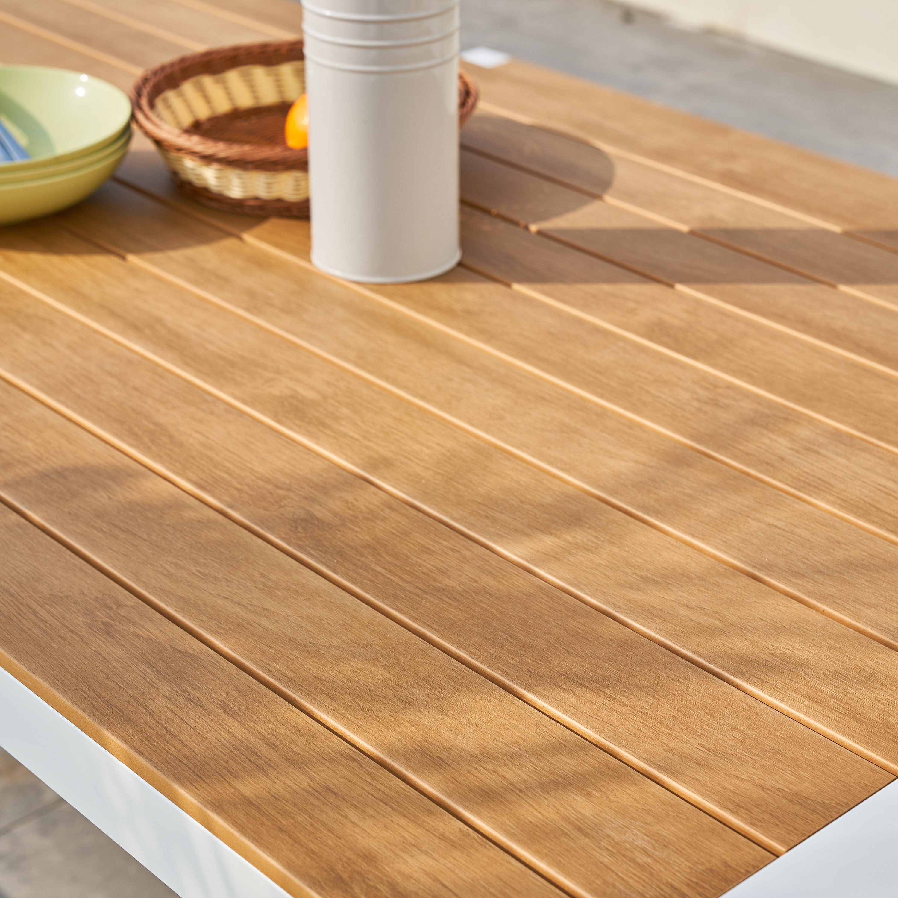 - Le plateau de table et les surfaces d'assise en polywood offrent l'aspect charmant du teck, mais avec la durabilité du plastique.