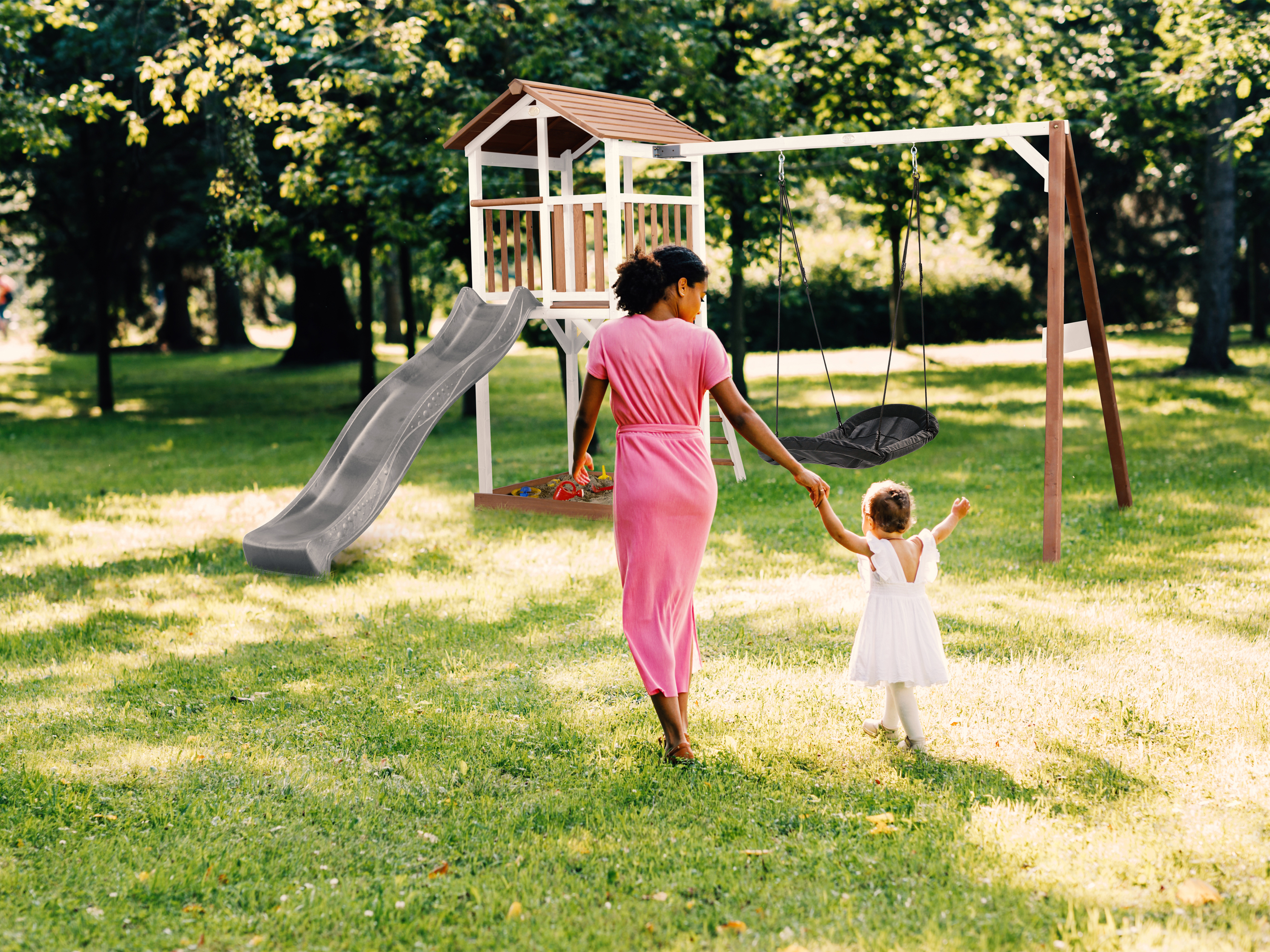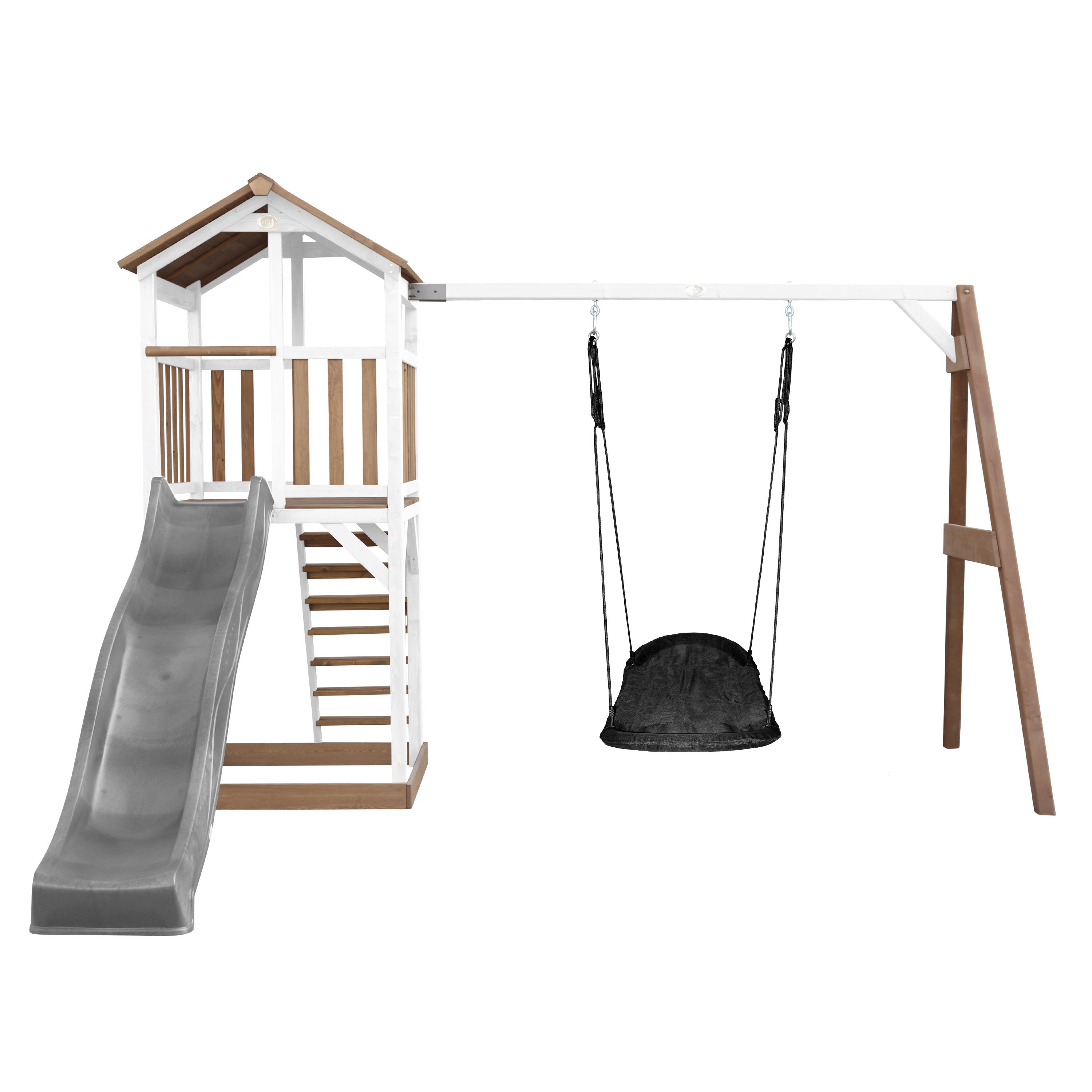 L’aire de jeux AXI Beach Tower, Marron et blanc avec la balançoire Roxy nid d’oiseau est comme si vos enfants étaient dans une vraie maison de plage. Grimper, glisser et se balancer sont les passe-temps favoris des jeunes enfants. Et tout cela est possible avec cette Beach Tower. Il est impossible que les enfants ne s'amusent pas pendant des heures avec celle-ci lors d'une belle journée ensoleillée.