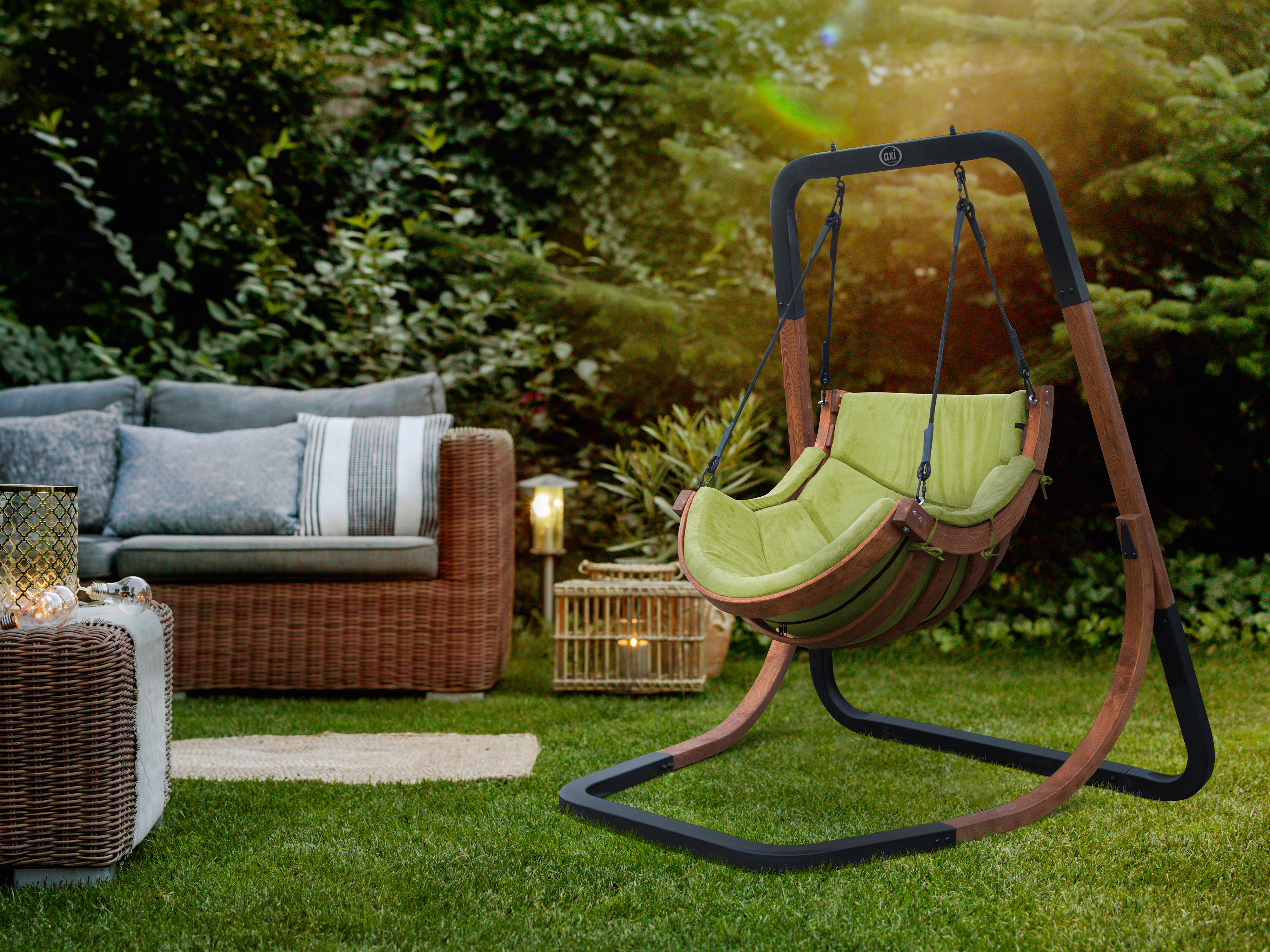 Avec l’œuf suspendu Capri Vert d'AXI, vous passerez l'été à vous détendre ! Se prélasser et profiter du soleil ; cette chaise suspendue confortable est l'endroit idéal pour se détendre. Grâce à son design luxueux, ce fauteuil suspendu sur pied est le nouveau point d'attraction de votre jardin ! Le fauteuil balancelle Capri est fabriqué en daim véritable et est suspendu à deux points de suspension sur le cadre stable. Vous pouvez ainsi vous asseoir et vous balancer dans le plus grand confort. Le support robuste est en bois de mélèze et en acier.
