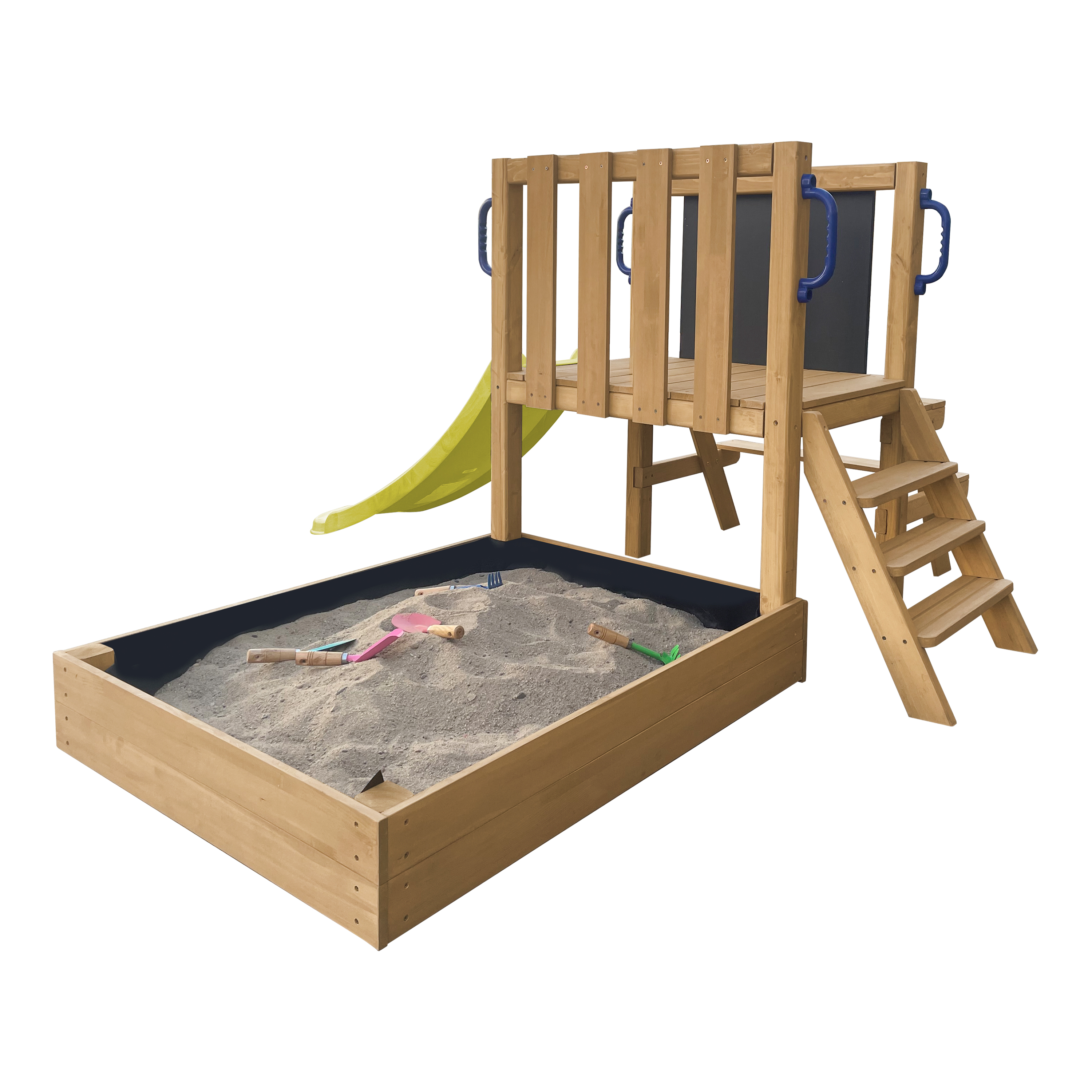Avec une plate-forme de 58 cm de haut, la mini aire de jeux Leah est parfaitement adaptée aux jeunes enfants. Après avoir joué, le bac à sable peut facilement être recouvert de la housse de protection fournie. Les enfants peuvent également utiliser le tableau noir pour exprimer leur créativité ou manger un morceau à la table de pique-nique.
