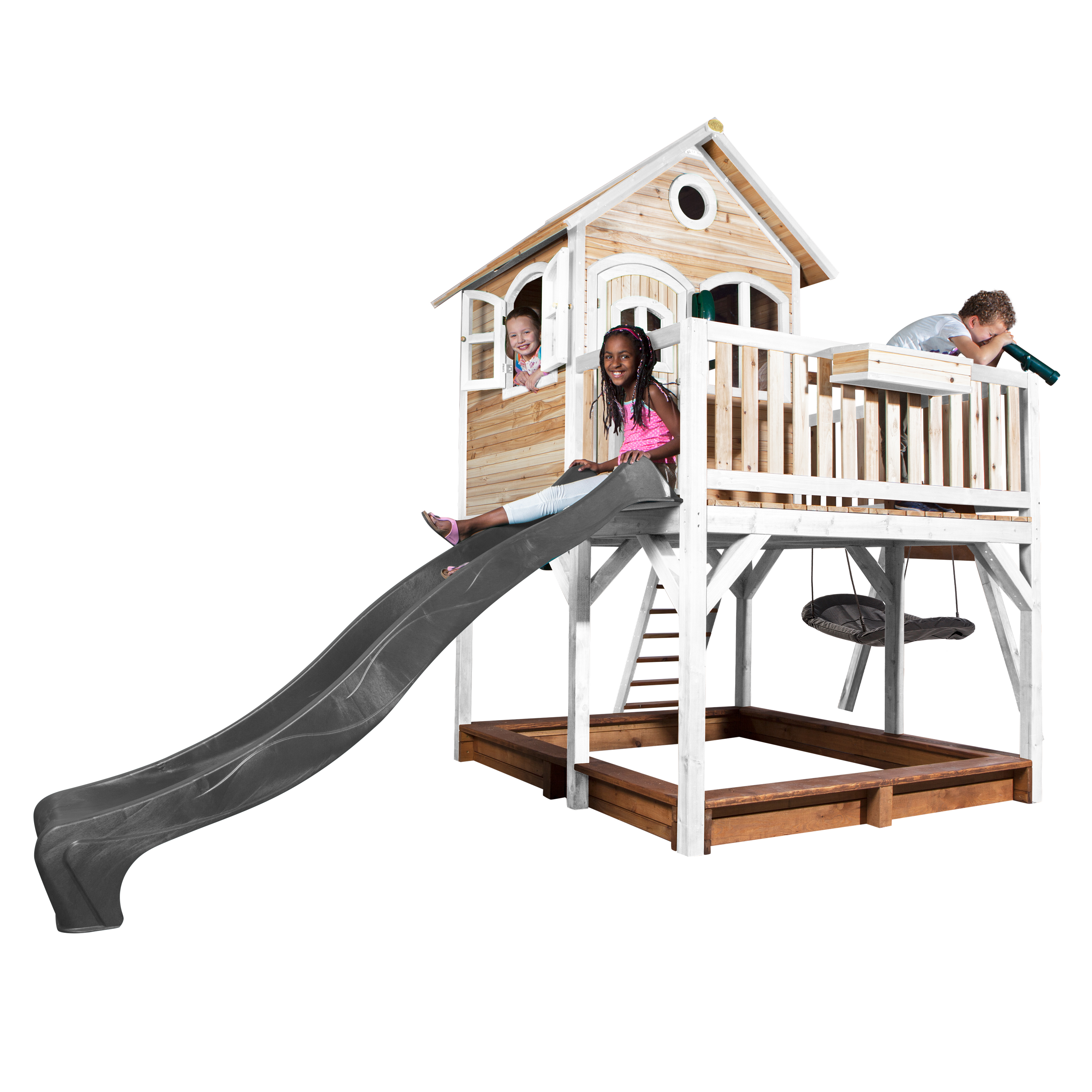 En utilisant les escaliers, ils peuvent grimper pour entrer dans la maison et ensuite glisser sur le long toboggan. Et ils n'ont pas fini de jouer, car sous la maison de jeu, il y a aussi un bac à sable où ils peuvent faire des gâteaux de sable ensemble. Dans cette maison, ils peuvent se raconter les plus beaux secrets. Une fois qu'ils ont fermé les fenêtres et la porte, personne ne peut les entendre ! Liam est une maison de jeu polyvalente en bois avec une porte semi-circulaire et des fenêtres. La porte est munie d'une boîte aux lettres par laquelle les enfants peuvent jeter le courrier lorsqu'ils jouent à la poste. La maison de jeu est proposée dans des couleurs marron/blanc modernes qui s'intègrent parfaitement dans tout jardin contemporain. La maison de jeu Liam a une hauteur de plate-forme de 118 cm et est équipée d'un grand toboggan de 228 cm de long. Lorsque les enfants ont fini de jouer, le bac à sable peut facilement être recouvert à l'aide de la housse fournie.