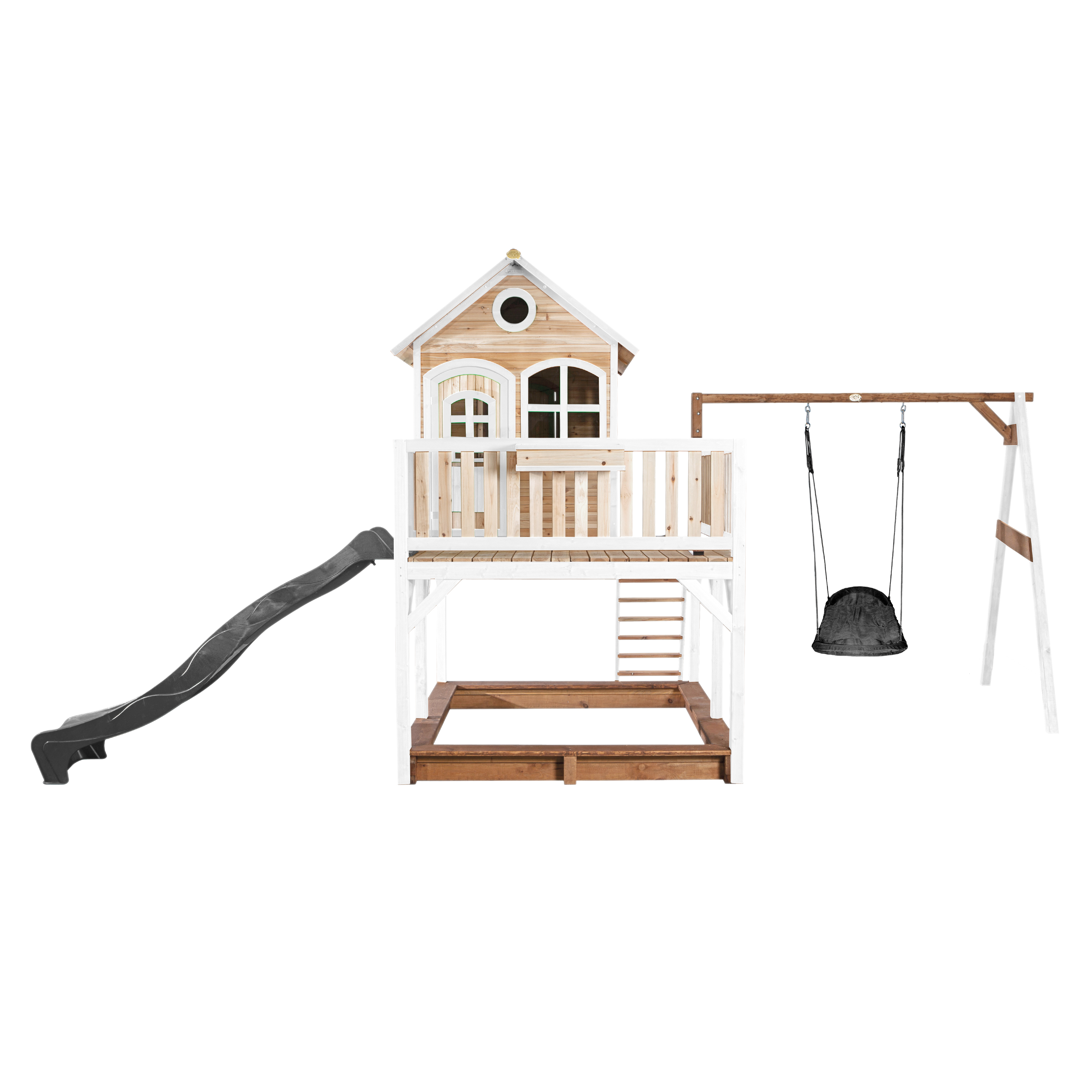 La maisonnette en bois Liam Marron et Blanche avec balançoire nid d’oiseau Roxy Nest d'AXI permet à vos enfants de s'amuser à l'infini ! Grimper, glisser et se balancer sont les passe-temps préférés des jeunes enfants. Avec Liam, c'est tout à fait possible. Il est impossible que les enfants ne s'amusent pas pendant des heures lors d'une belle journée ensoleillée. La grande véranda rend le tout encore plus unique. Grâce à elle, les enfants peuvent observer les environs et voir leurs amis s'approcher de loin. En plus de la vue depuis la véranda, ils peuvent profiter de leur liberté lorsqu'ils se balancent. Heureusement, sur cette balançoire nid, ils ne sont pas obligés de se balancer seuls, mais ils peuvent le faire avec un ou plusieurs amis en même temps. L'assise extra-large de la Roxy donne l'impression à vos enfants d'être dans un bateau à bascule, ce qui ajoute à l'amusement !