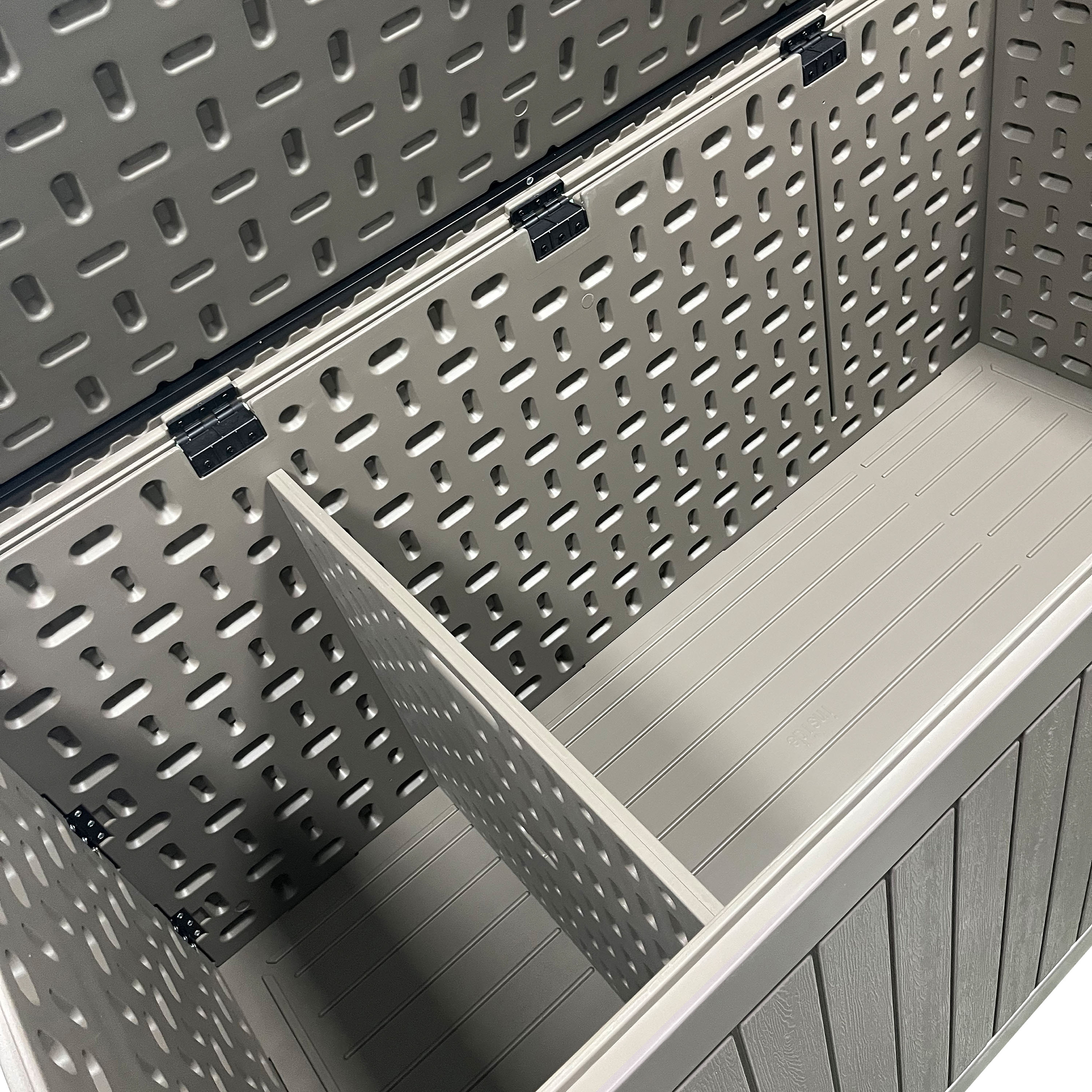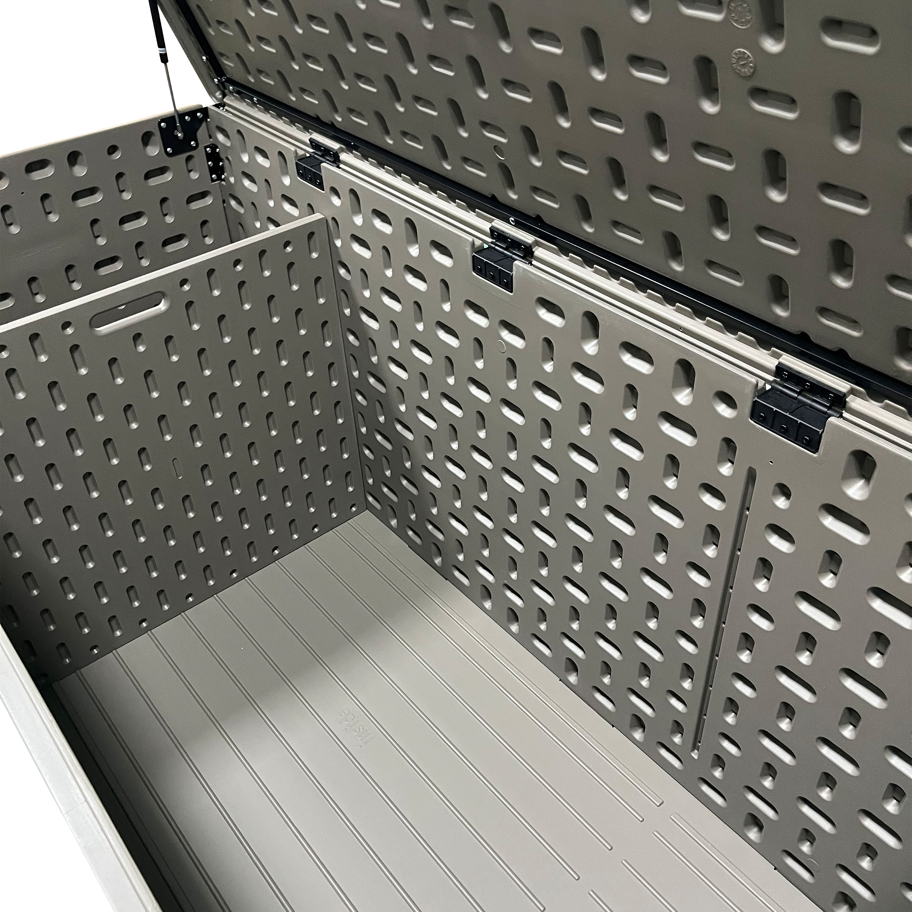Le couvercle est équipé de ressorts à gaz et s'ouvre en douceur, tout en restant ouvert en toute sécurité. Vous avez ainsi toujours facilement accès à vos affaires. Avec une capacité de charge maximale de 330 kg, le couvercle est également suffisamment solide pour être utilisé comme siège supplémentaire. Des ouvertures de ventilation permettent de garder le contenu au frais.