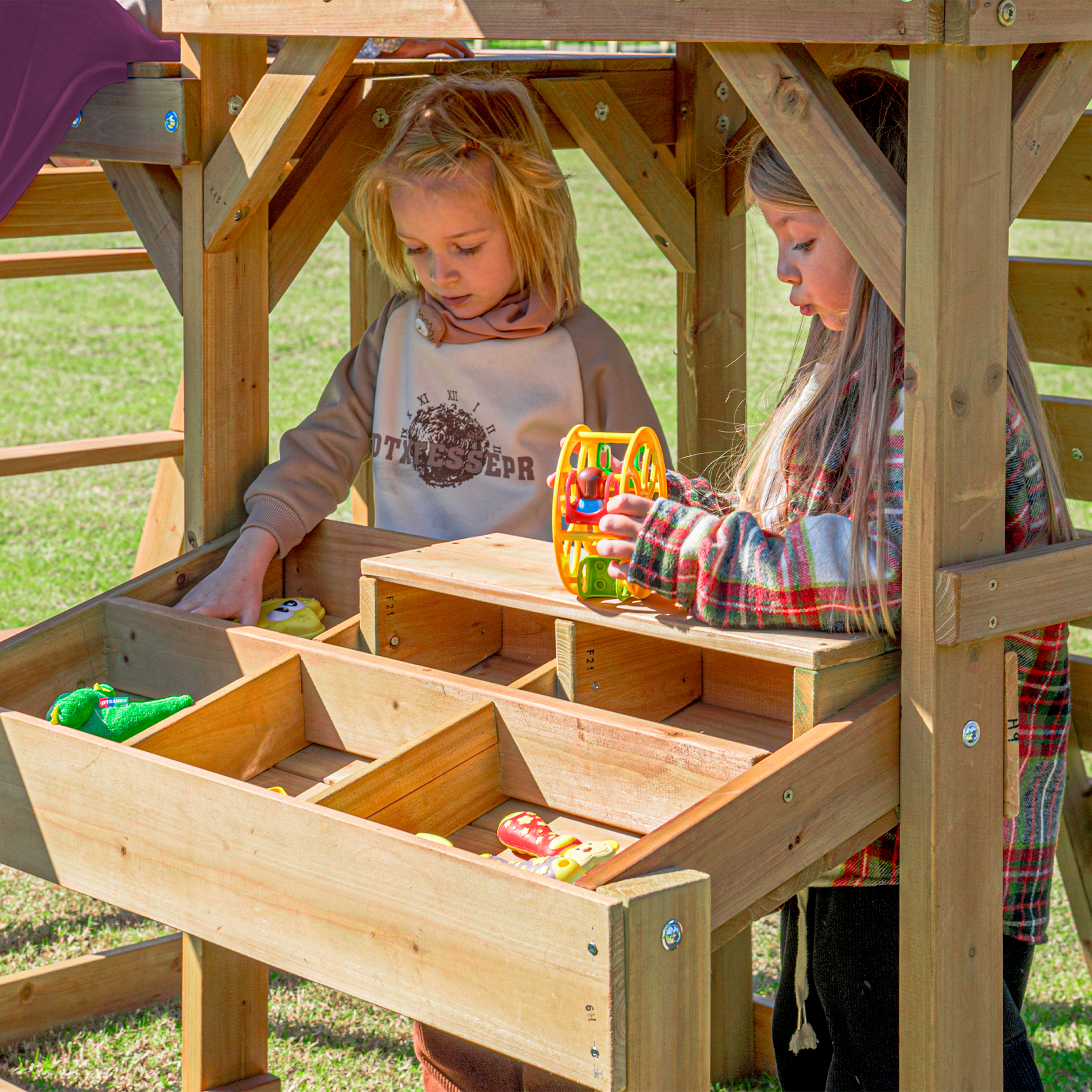Le toboggan dispose d'un raccordement à l'eau - parfait pour les chaudes journées d'été, pour profiter de tous les plaisirs aquatiques ! Il y a également une table d'activités où les petits peuvent par exemple installer une petite boutique et laisser libre cours à leur imagination. Qui vendra le plus de gâteaux de boue ou de biscuits de sable ? Sous la tour de jeu se trouve un bac à sable dans lequel les enfants peuvent construire ensemble les plus belles créations de sable.