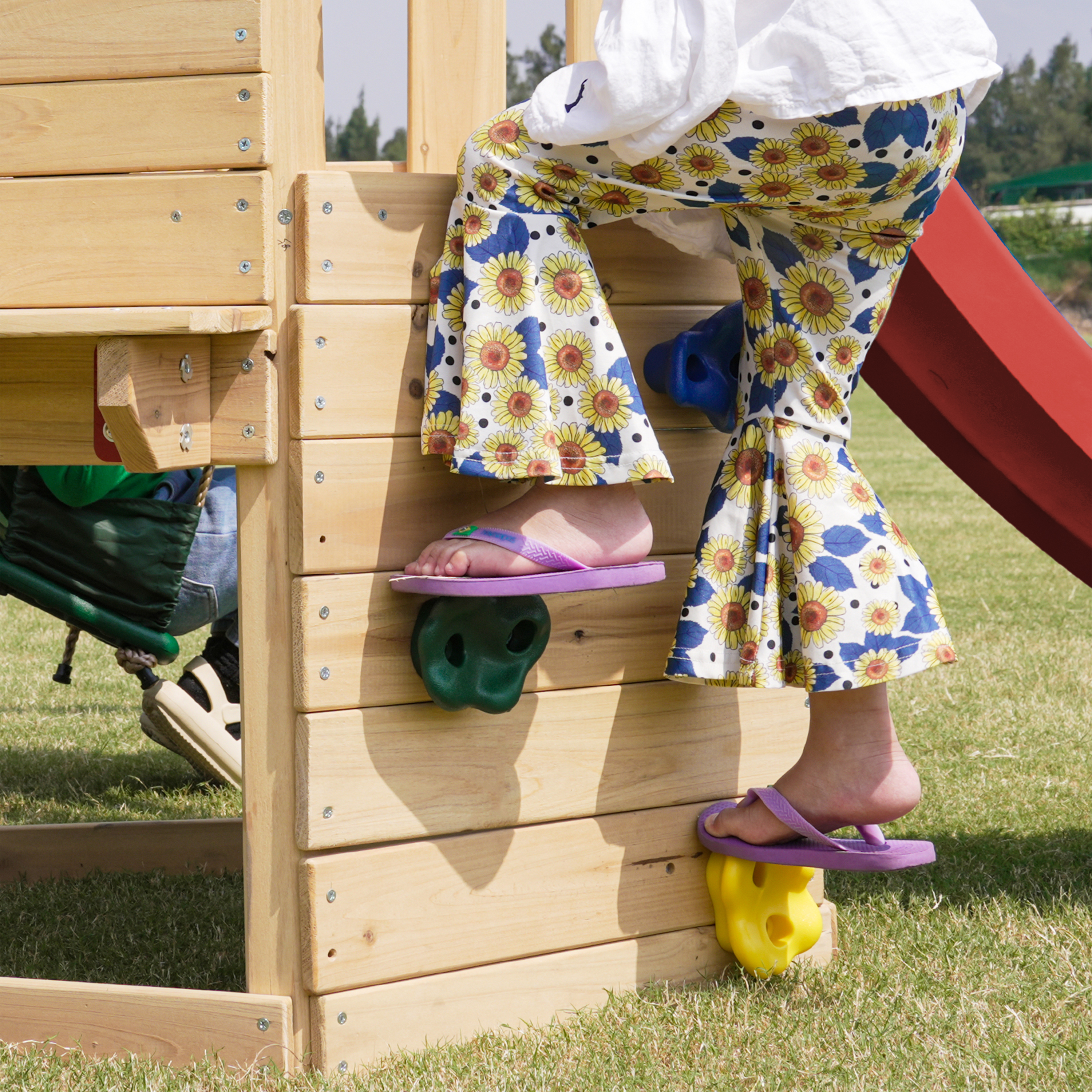 Les enfants peuvent facilement grimper jusqu'à la plate-forme à l'aide de l'escalier. De là, ils peuvent redescendre par le toboggan. À côté de l’aire de jeux se trouve une balançoire où les enfants peuvent se balancer à leur guise. Le siège de la balançoire peut également être replié lorsqu'il n'est pas utilisé. Sur le côté de l’aire de jeux se trouve un mur d'escalade qui offre un défi supplémentaire et un plaisir de jeu actif.