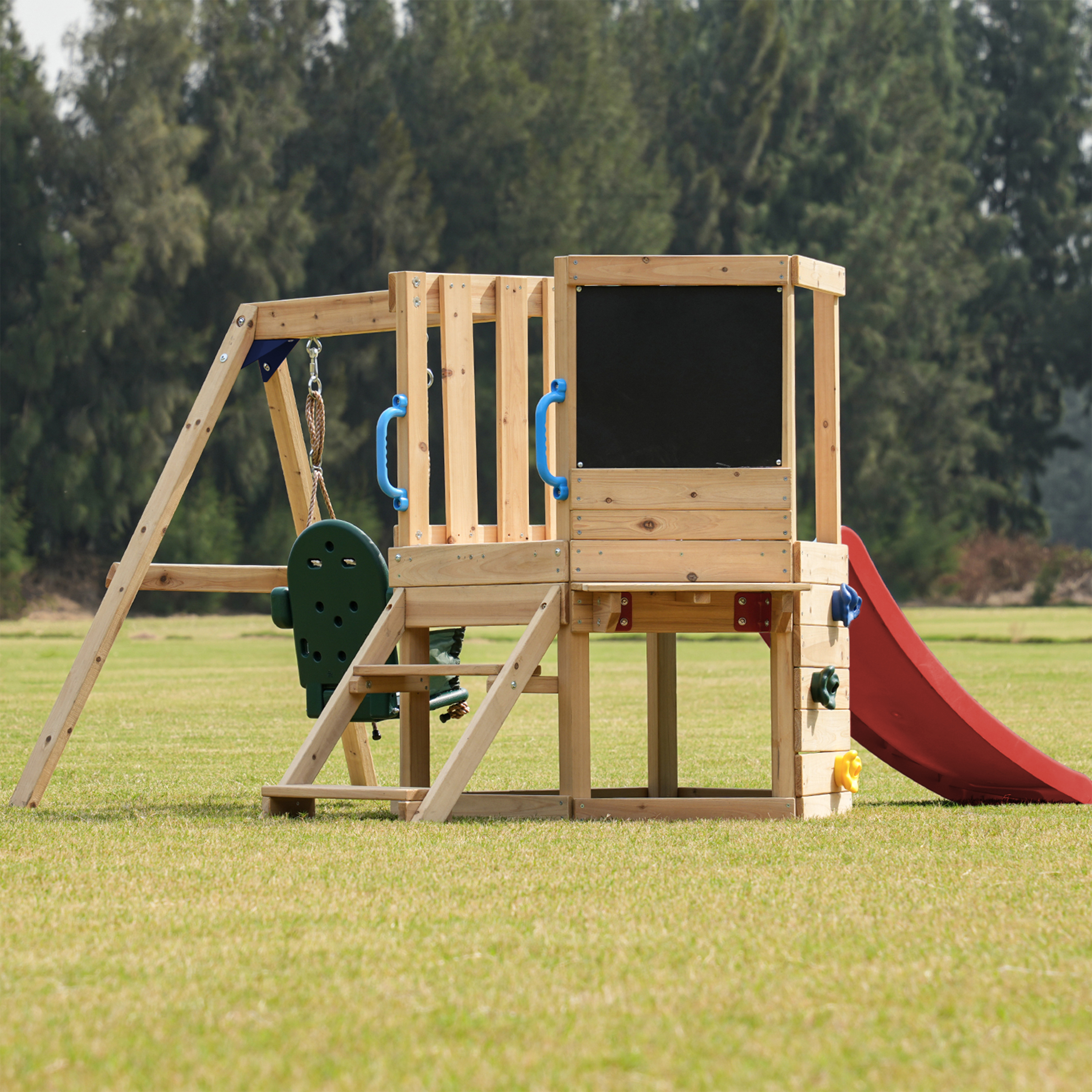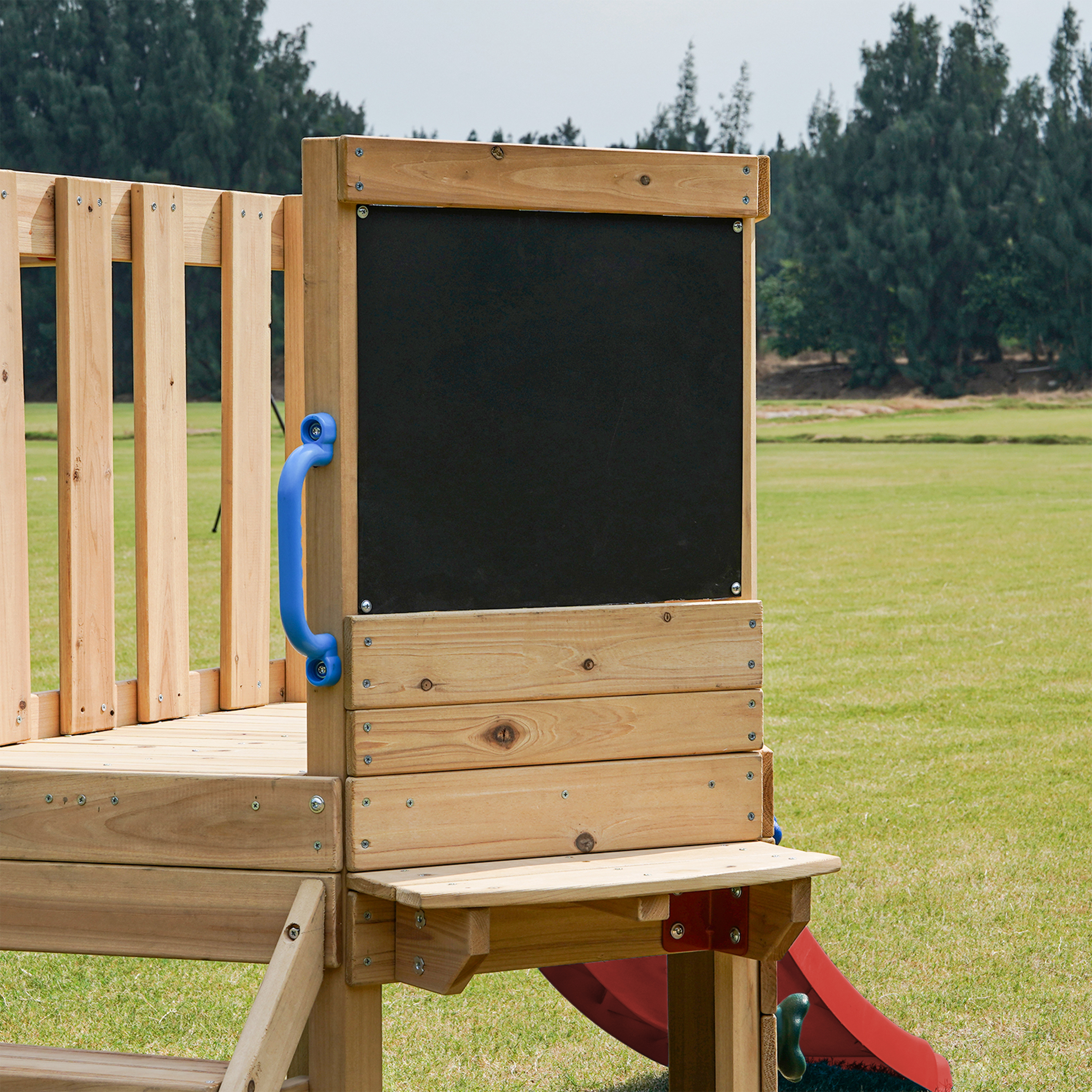 Grâce à sa conception compacte et ouverte, jusqu'à trois enfants peuvent jouer en même temps. Pendant que l'un dévale le toboggan, un autre grimpe ou dessine sur le tableau noir. L'aire de jeux se transforme ainsi rapidement en un lieu de jeu animé où l'imagination et le mouvement se rencontrent.