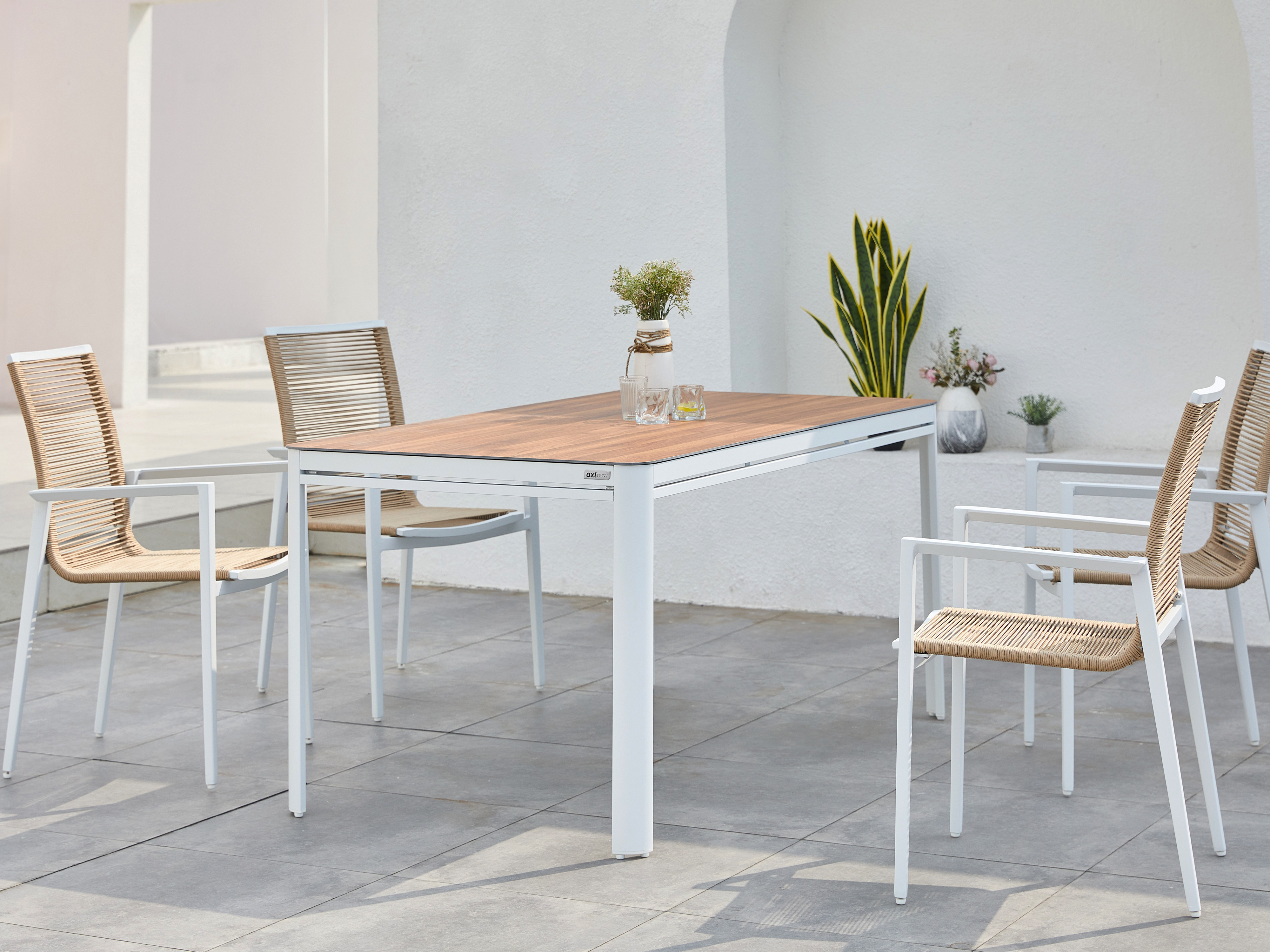 L'ensemble Table et chaises de jardin AXI Zora vous permet de passer des moments agréables dans votre jardin ou sur votre terrasse. Avec une combinaison fraîche de blanc et de PSPC aspect bois, vous vous sentirez comme à Ibiza ! Le cadre robuste en aluminium peint par poudrage offre une grande durabilité sans sacrifier la mobilité. Ses dimensions font de ce salon de jardin un complément idéal à tout espace extérieur. La table est dotée d'un plateau en PSPC avec une impression de bois naturel et d'élégants pieds arrondis, tandis que les chaises sont doublement tressées avec une corde en polyester beige pour plus de confort. De plus, les chaises sont empilables, ce qui permet d'économiser de l'espace lorsqu'elles ne sont pas utilisées. Pouvant accueillir 4 personnes, cet ensemble de jardin est parfait pour les moments de détente tels que les apéritifs d'été ou les barbecues en famille ou entre amis.