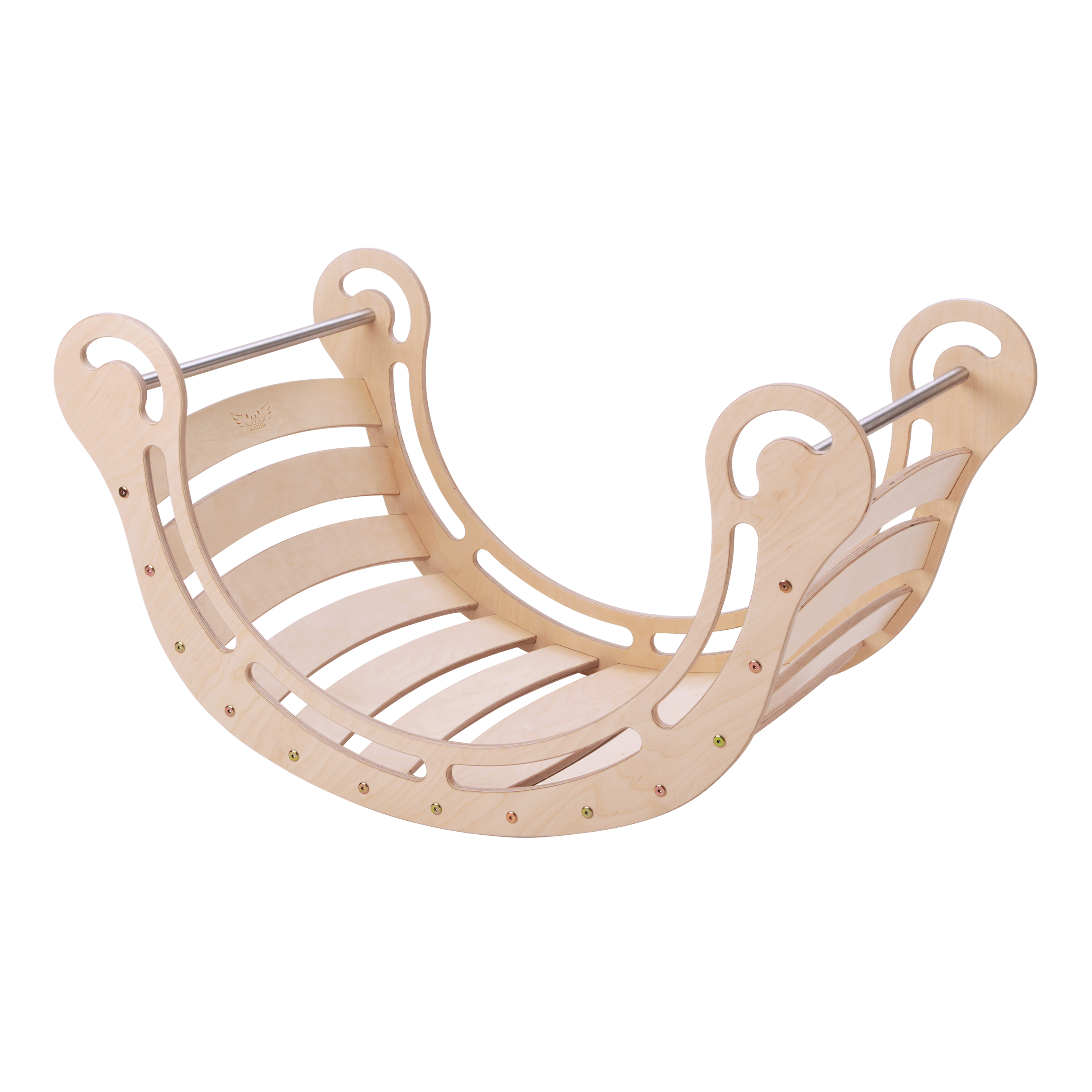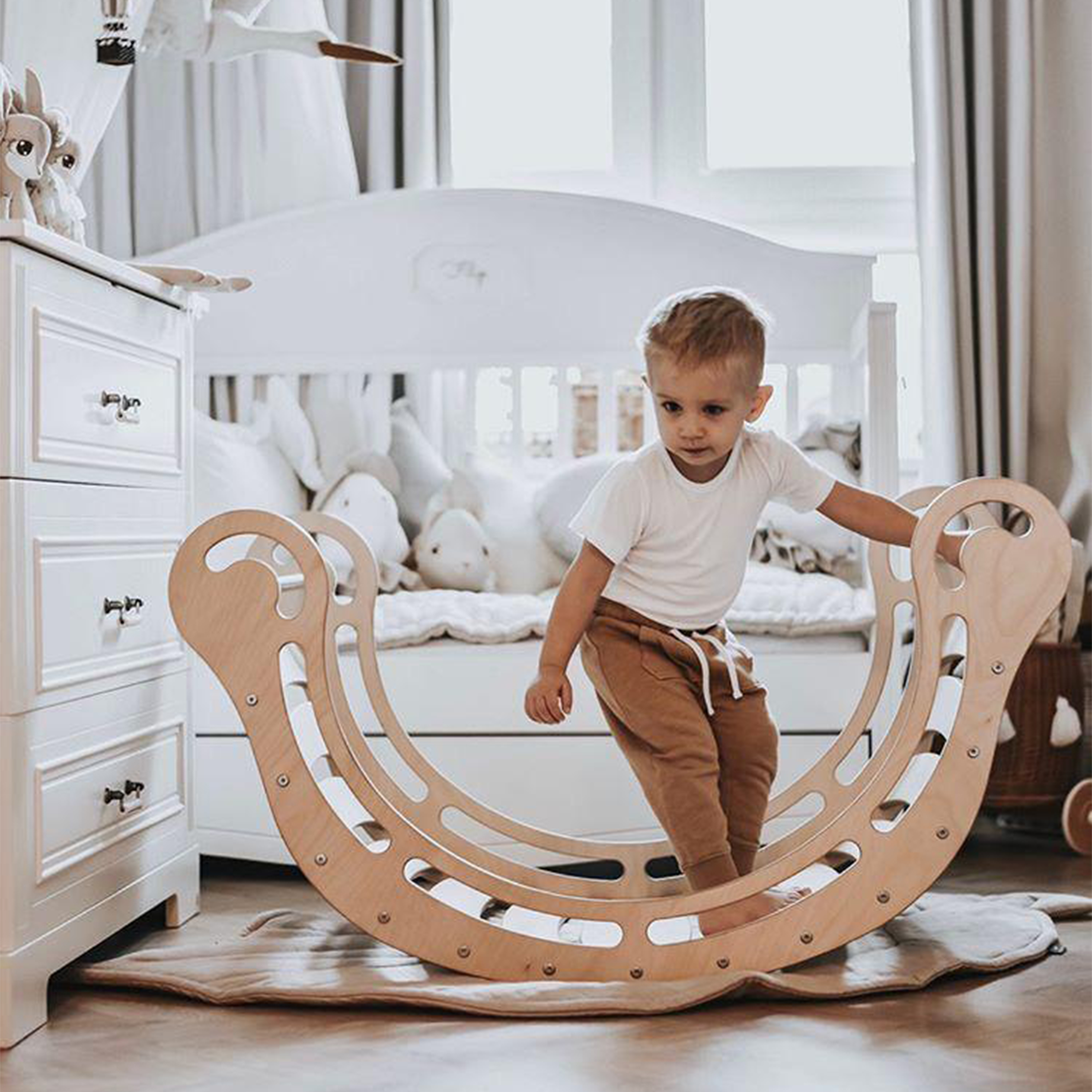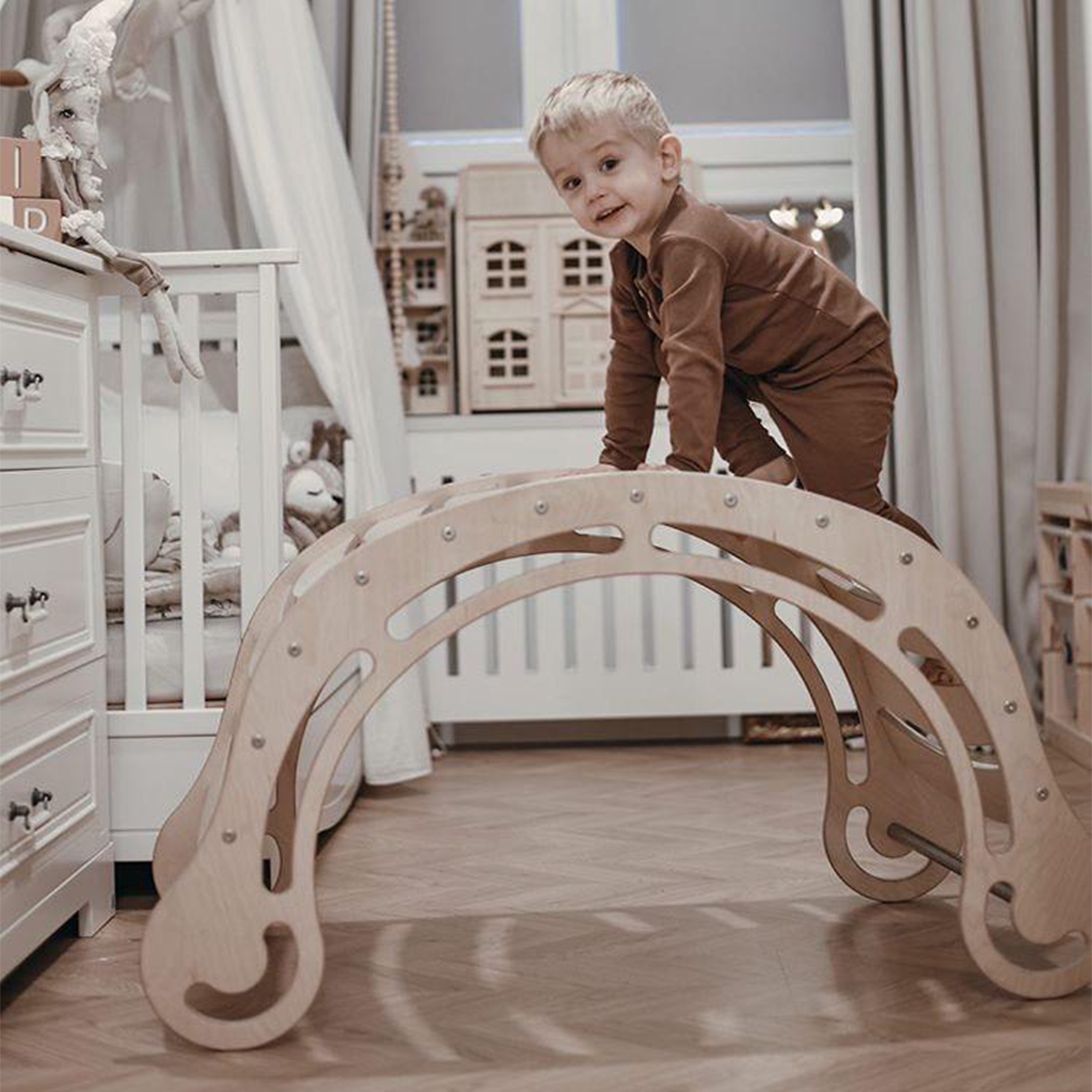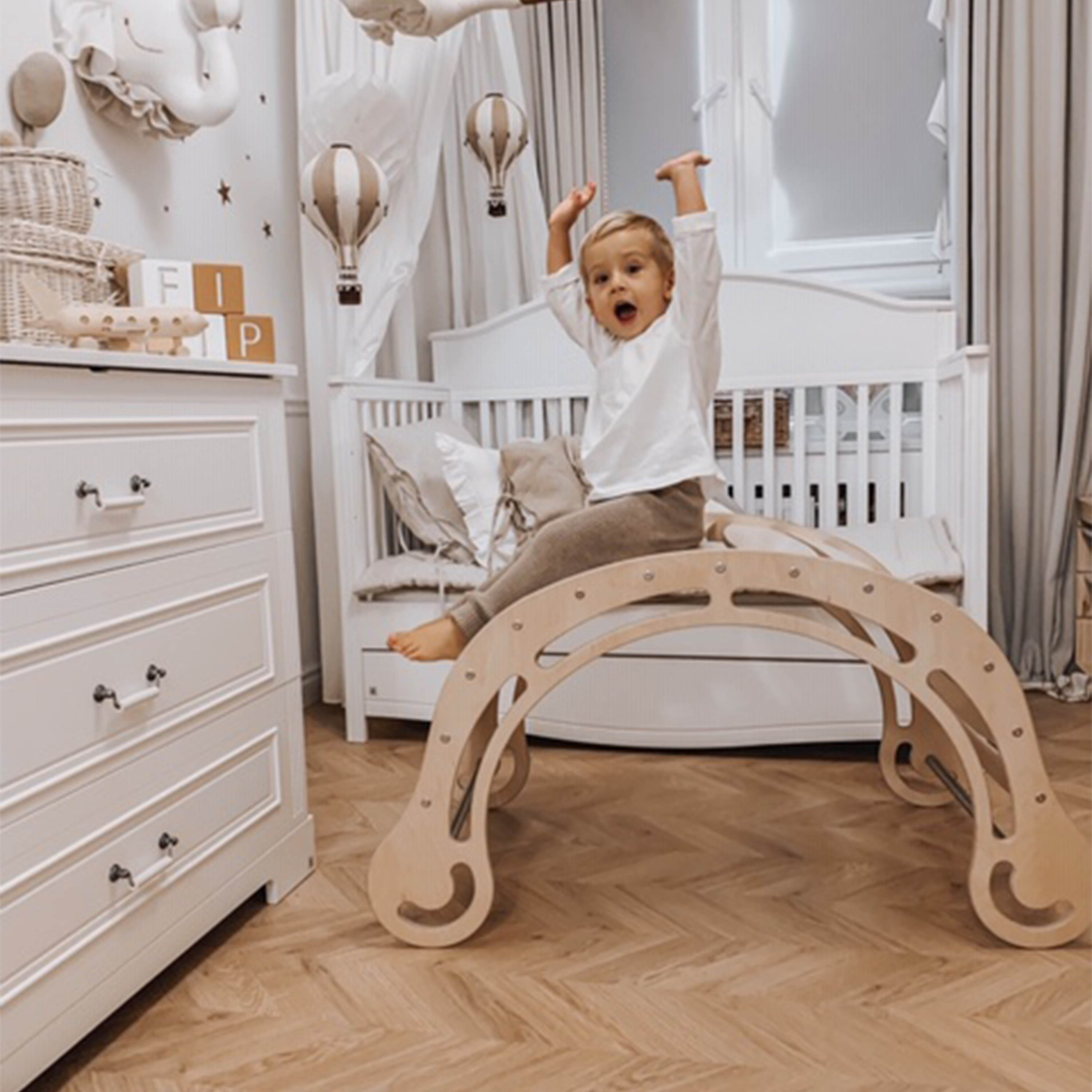 De KateHaa Houten XXL Klimboog Rocker Naturel is innovatief speelgoed dat esthetisch design met praktische speelfuncties combineert. Kinderen leren hun evenwicht en balans te houden terwijl zij klimmen of aan het schommelen zijn. Je kindje wordt al spelend behendig, leert evenwicht te houden en ontwikkelt zijn motoriek. Door de verschillende functies van de rocker is dit speelgoed de perfecte toevoeging voor iedere kinderkamer!