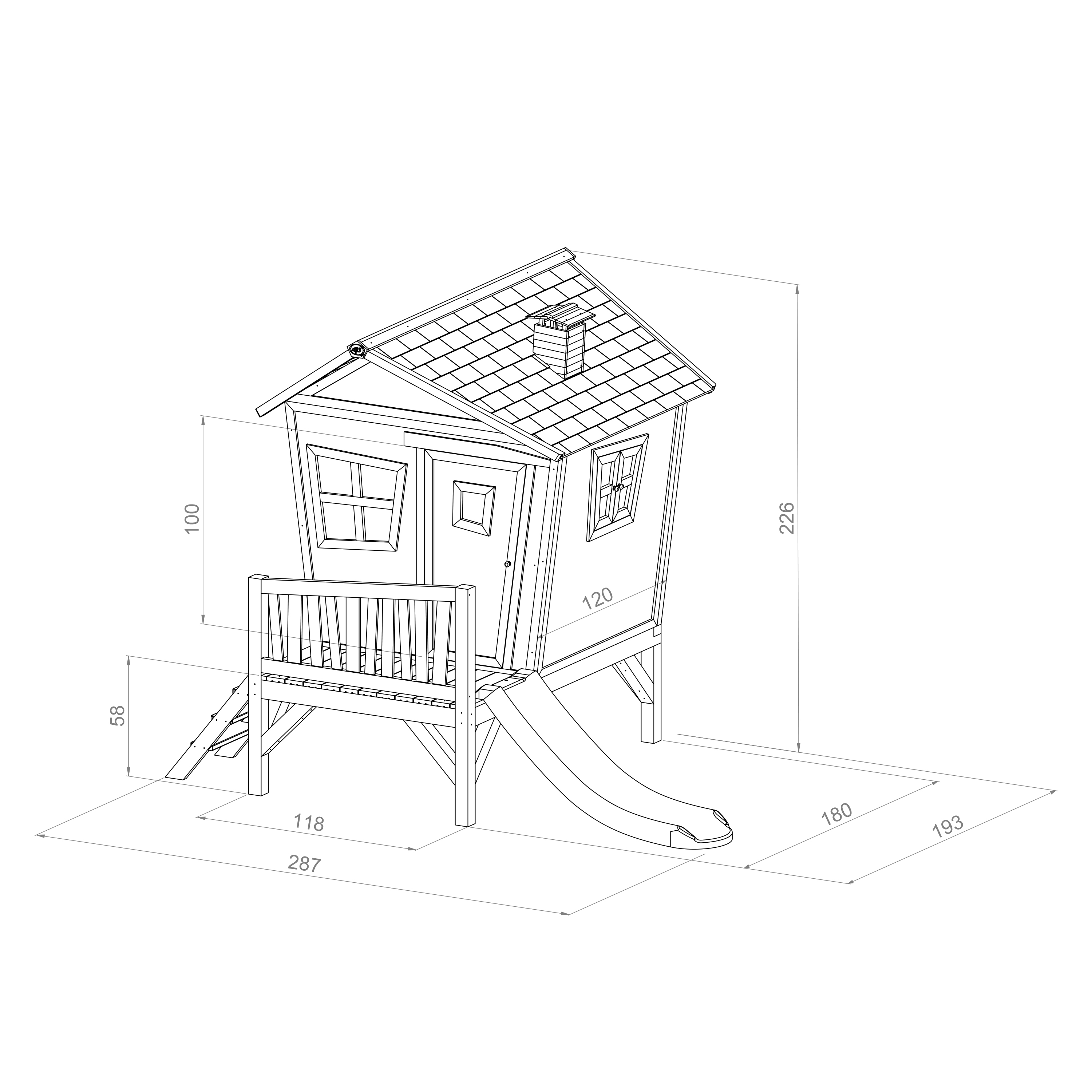 Speelhuis Iris heeft een platformhoogte van 58 cm en een totale hoogte van 226 cm. Het speelhuis is 193 cm lang en 287 cm breed. Vanwege het schuine ontwerp heeft dit speelhuis een afwijkende binnenmaat. Zo is de vloerbreedte 113 cm, maximale breedte 144 cm en de lengte 115 cm. Met een nokhoogte van ca. 165 cm is Iris een middelgroot houten speelhuis.