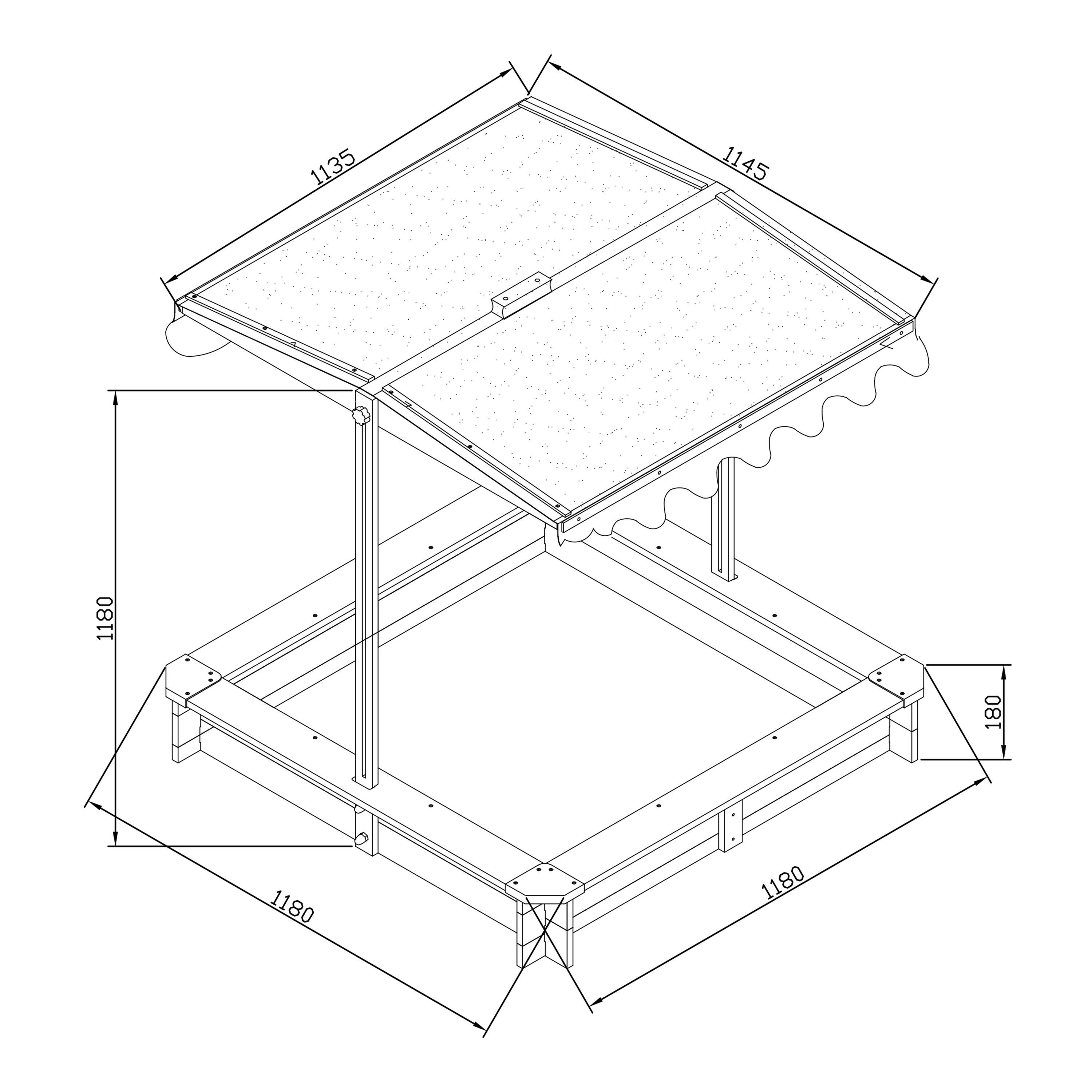 - In een gesloten positie fungeert het dak als een beschermhoes om het speelzand schoon te houden.