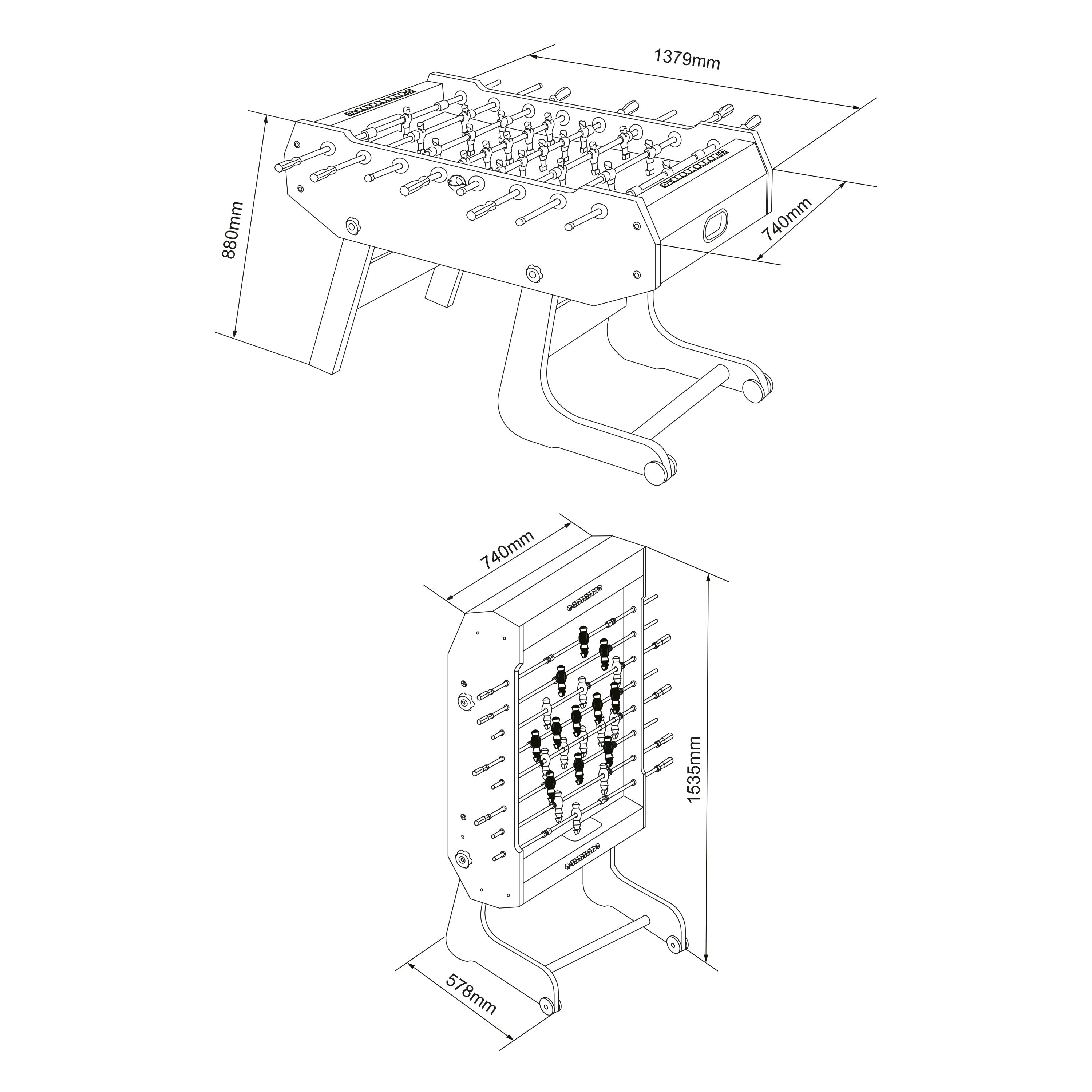 Afmetingen speeltafel (LxBxH): 139 x 74 x 88 cm.