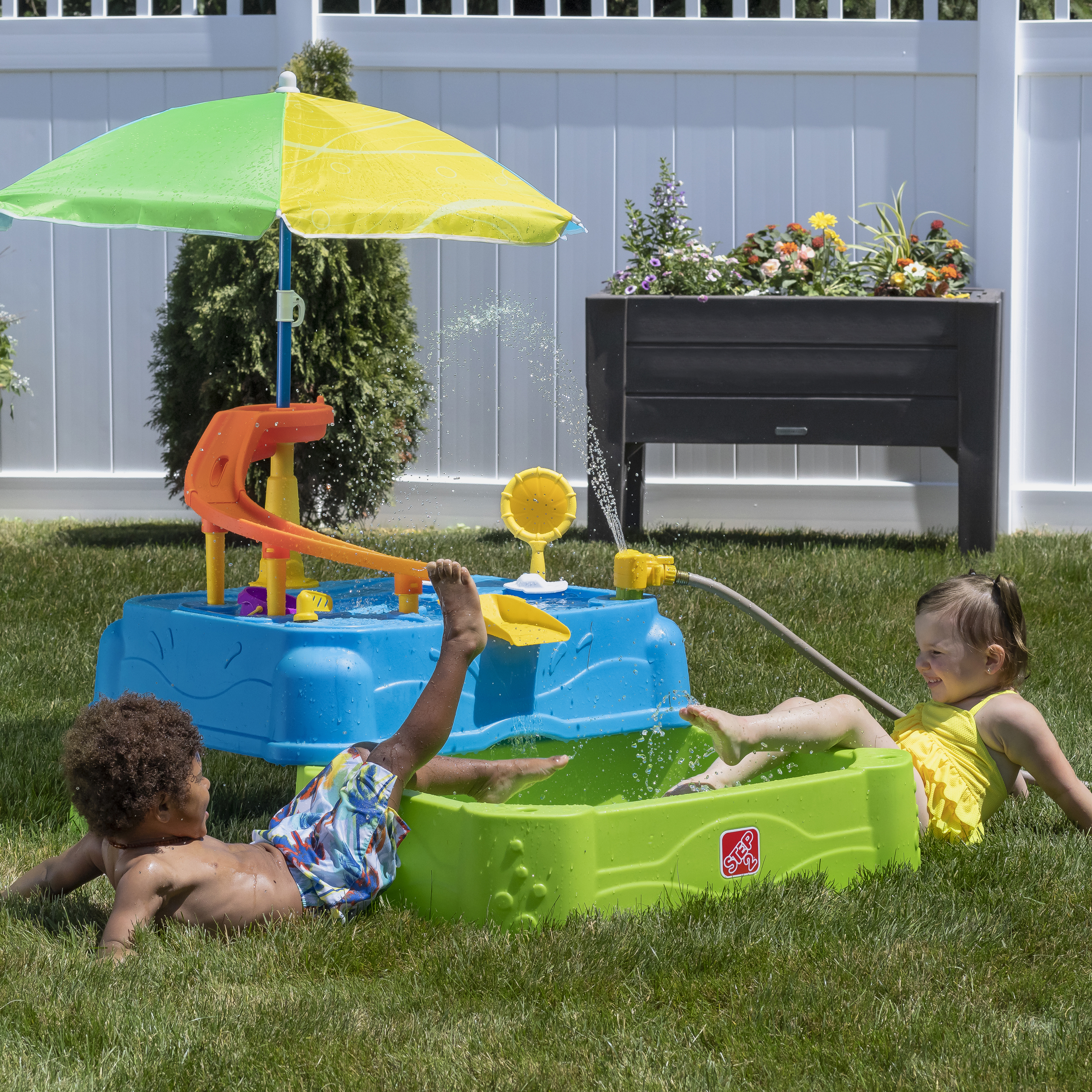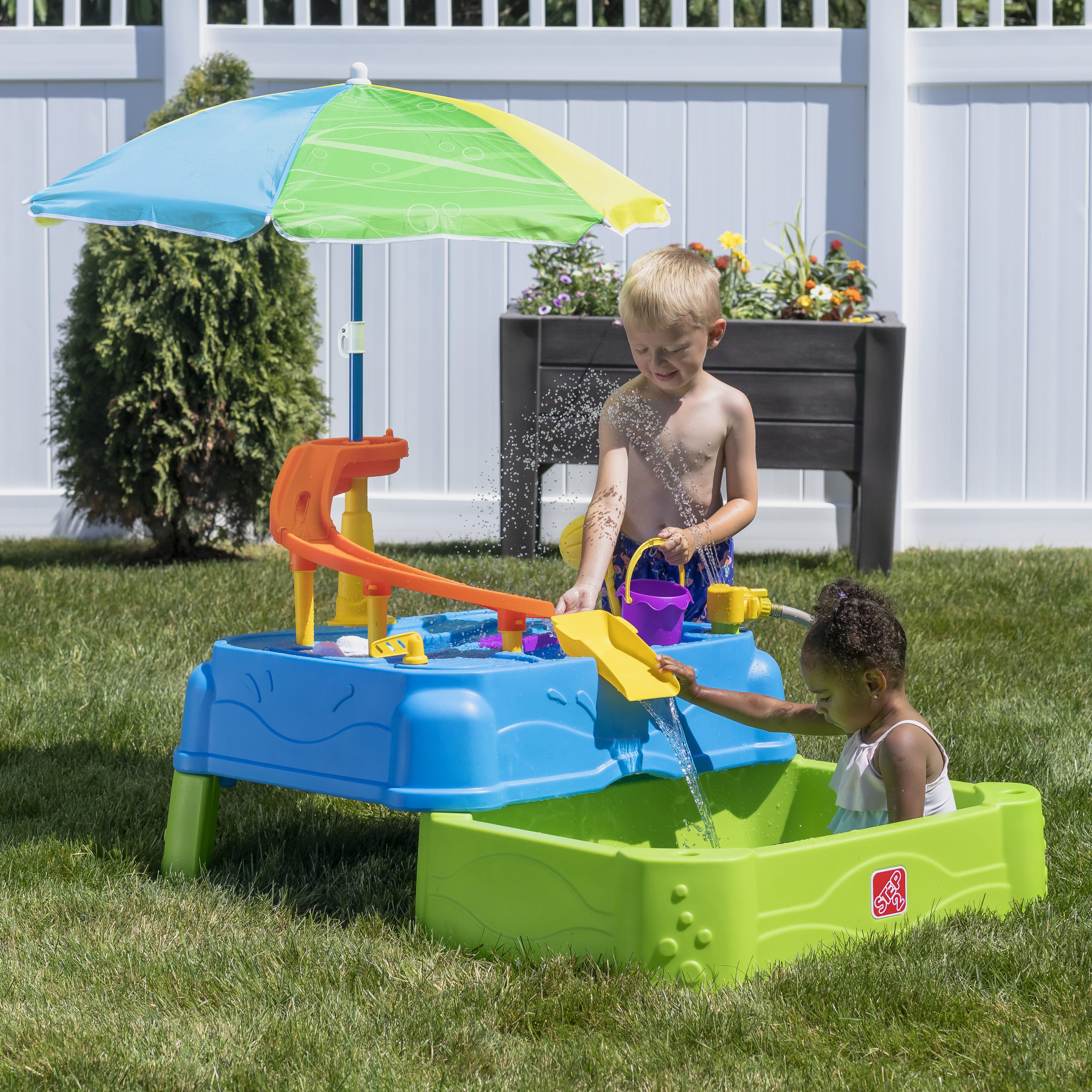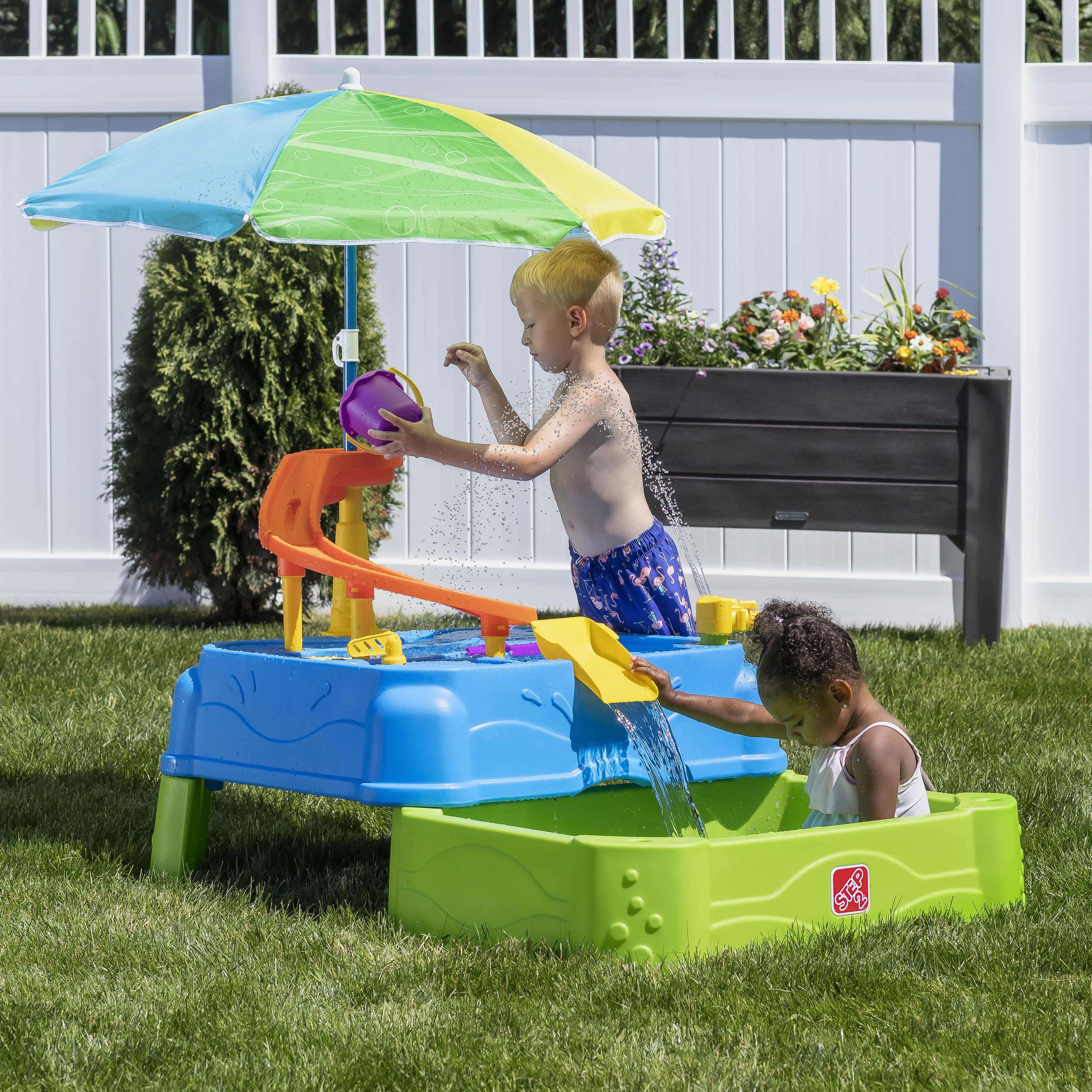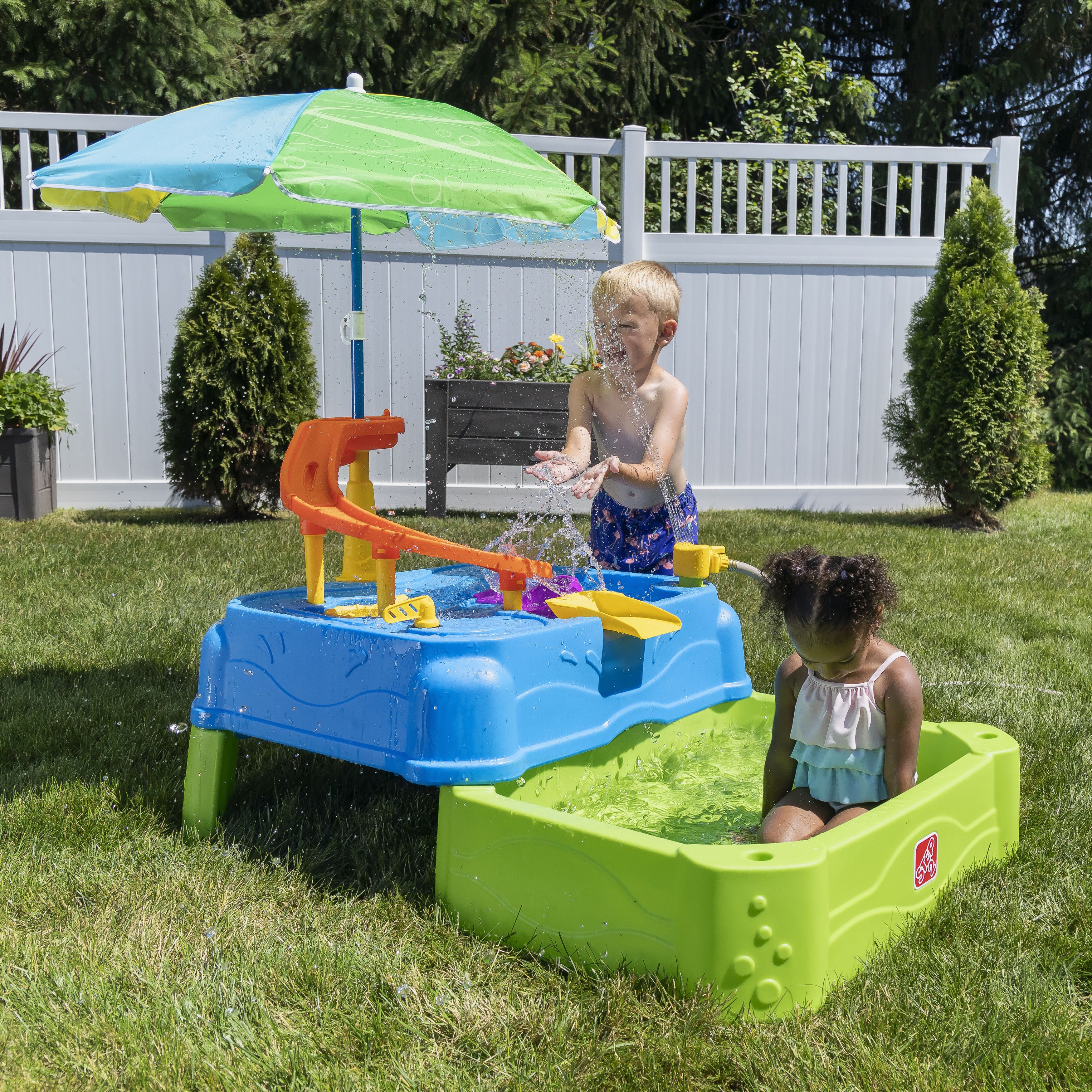 Speel, spetter en plons met de watertafel Waterpark Wonders Two-Tier van Step2! Deze watertafel is een variant op onze traditionele watertafel en biedt eindeloos speel- en spetterplezier. Je kindje kan in de schaduw van de parasol de hele dag plonsen en spannende wateractiviteiten ondernemen! Breng het bootspeelgoed van zee naar land met de ingebouwde wielen en gebruik de echt werkende ophaalbrug om matrozen en automobilisten door te laten. Sluit een gewone tuinslang aan op de watertafel-sproeier om het te laten regenen! En creëer een waterglijbaan door water uit de lagune van het waterpark op de torenhoge glijbaan te gieten en zie het water helemaal naar beneden stromen in het onderste bassin. Kindjes kunnen hun tenen in het grote bassin beneden laten zakken en op beide niveaus spetteren met de meegeleverde accessoires. Als het speelkwartier voorbij is, is het schoonmaken een fluitje van een cent dankzij de lekvrije aftappluggen in het bovenste en onderste niveau! Schuif de onderste bak weer onder de grote watertafel om hem compact op te bergen.
