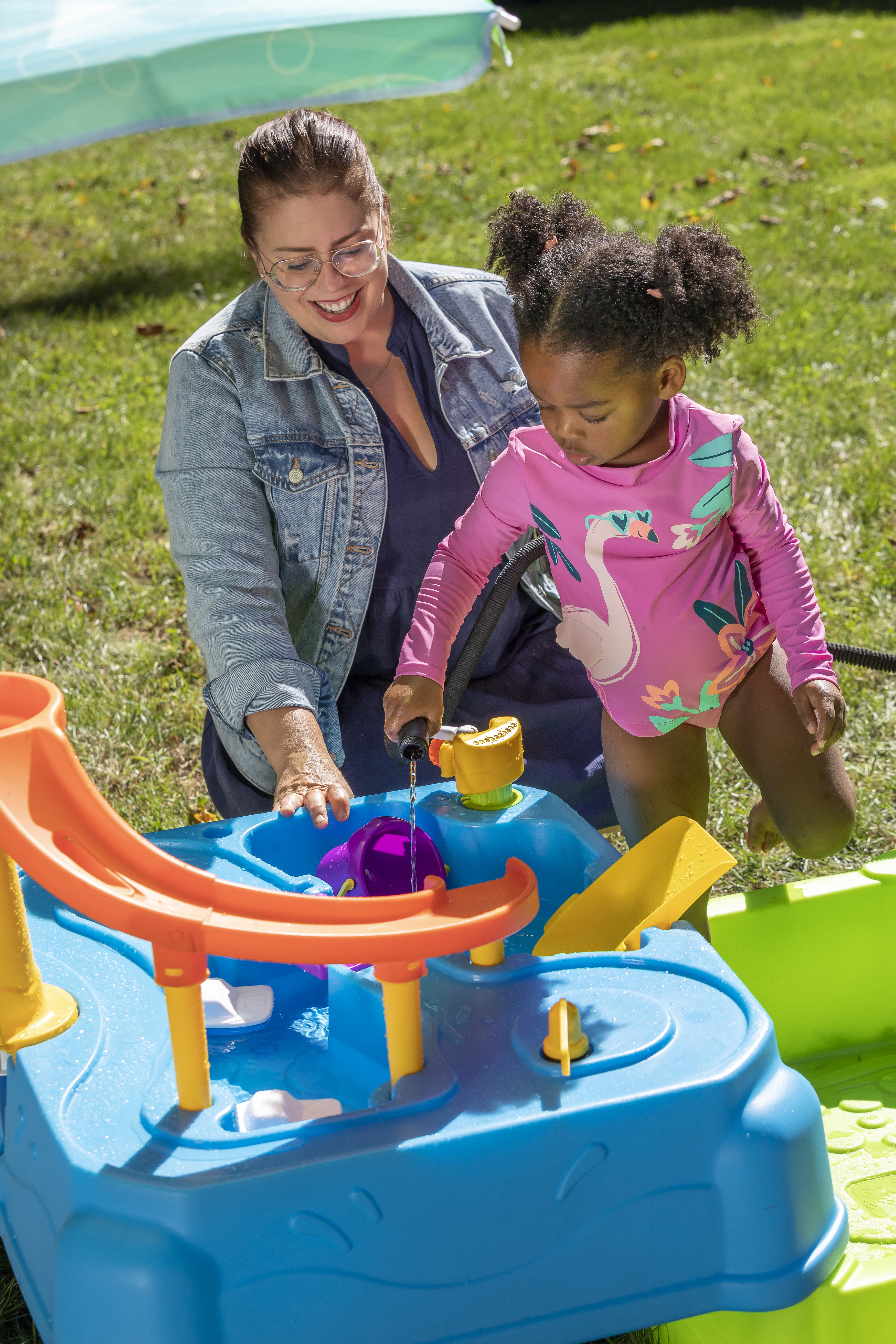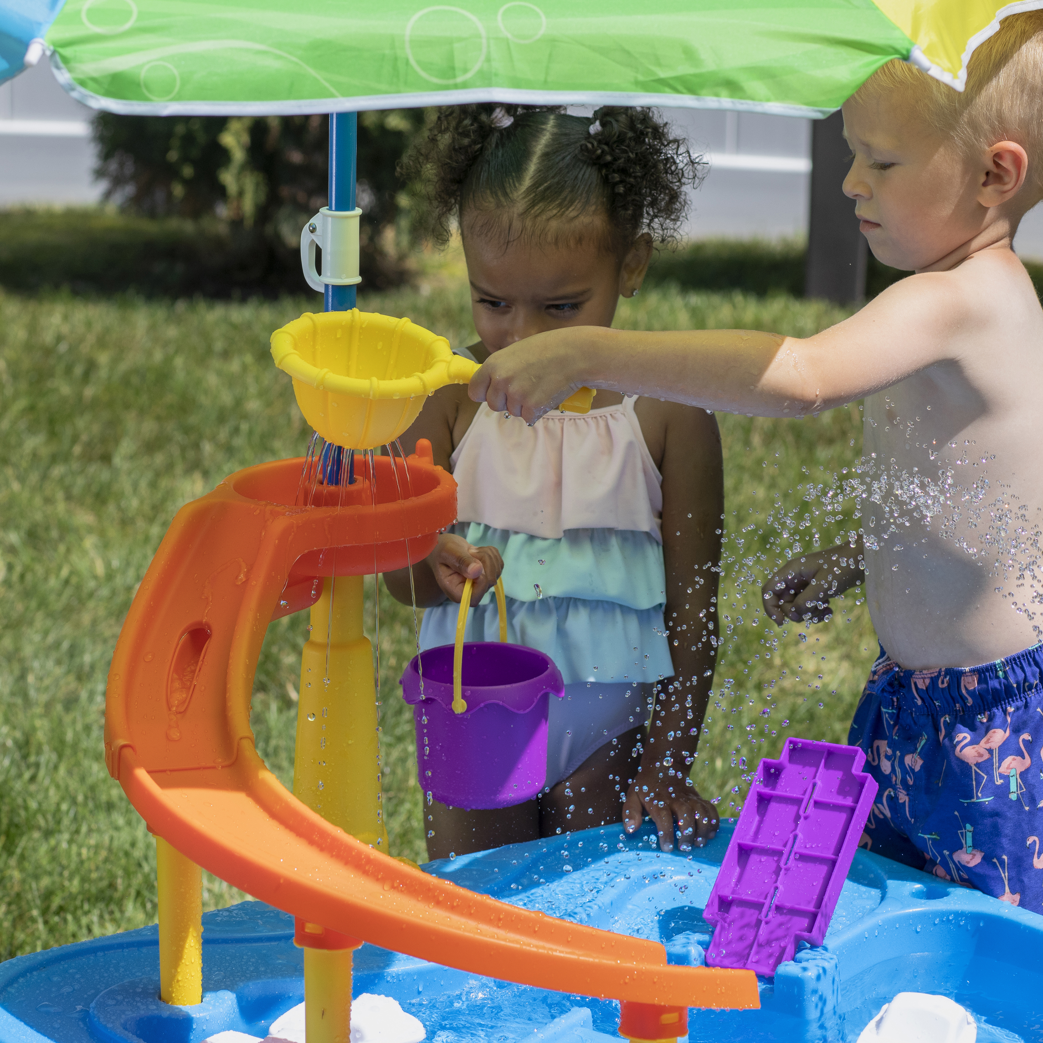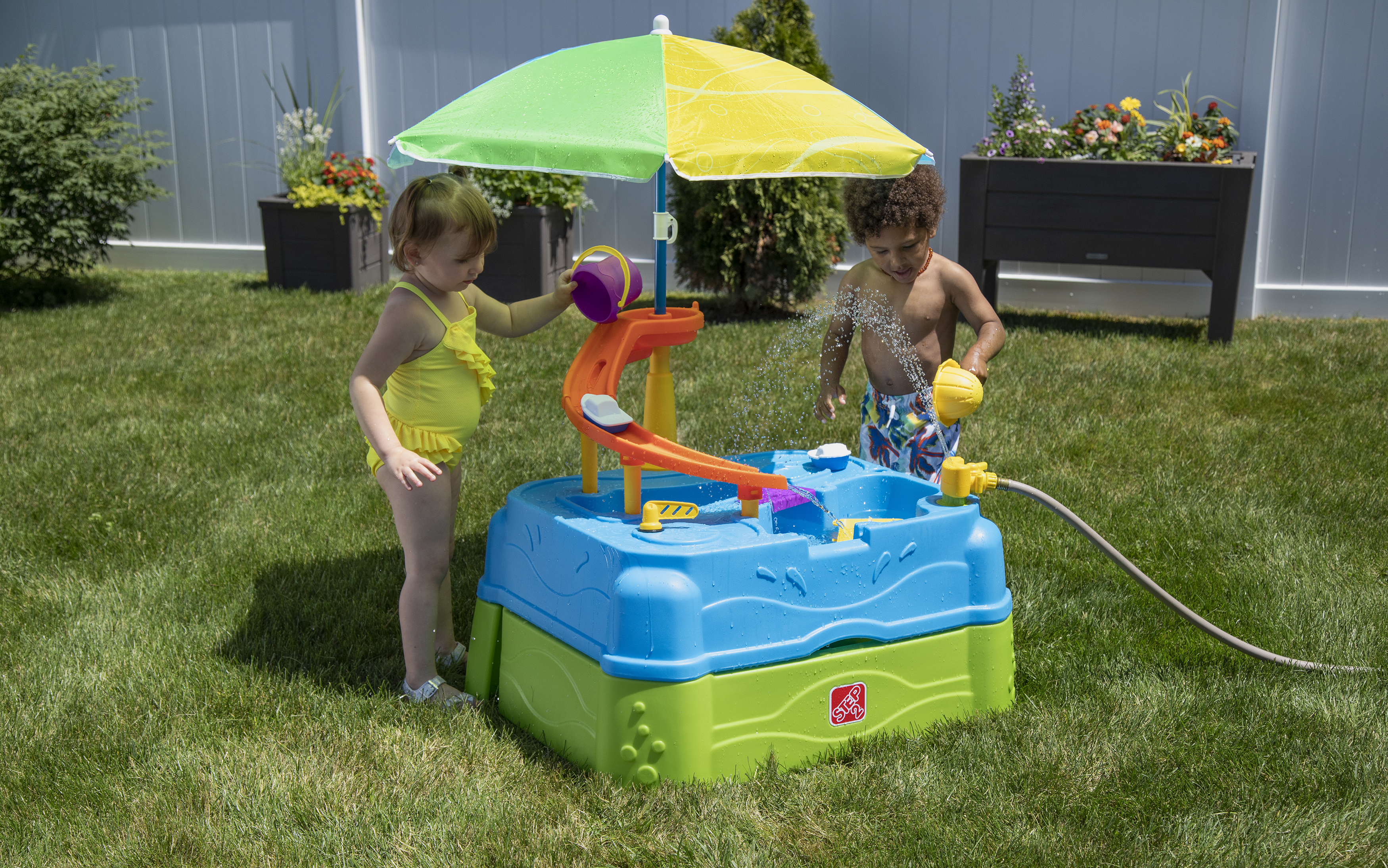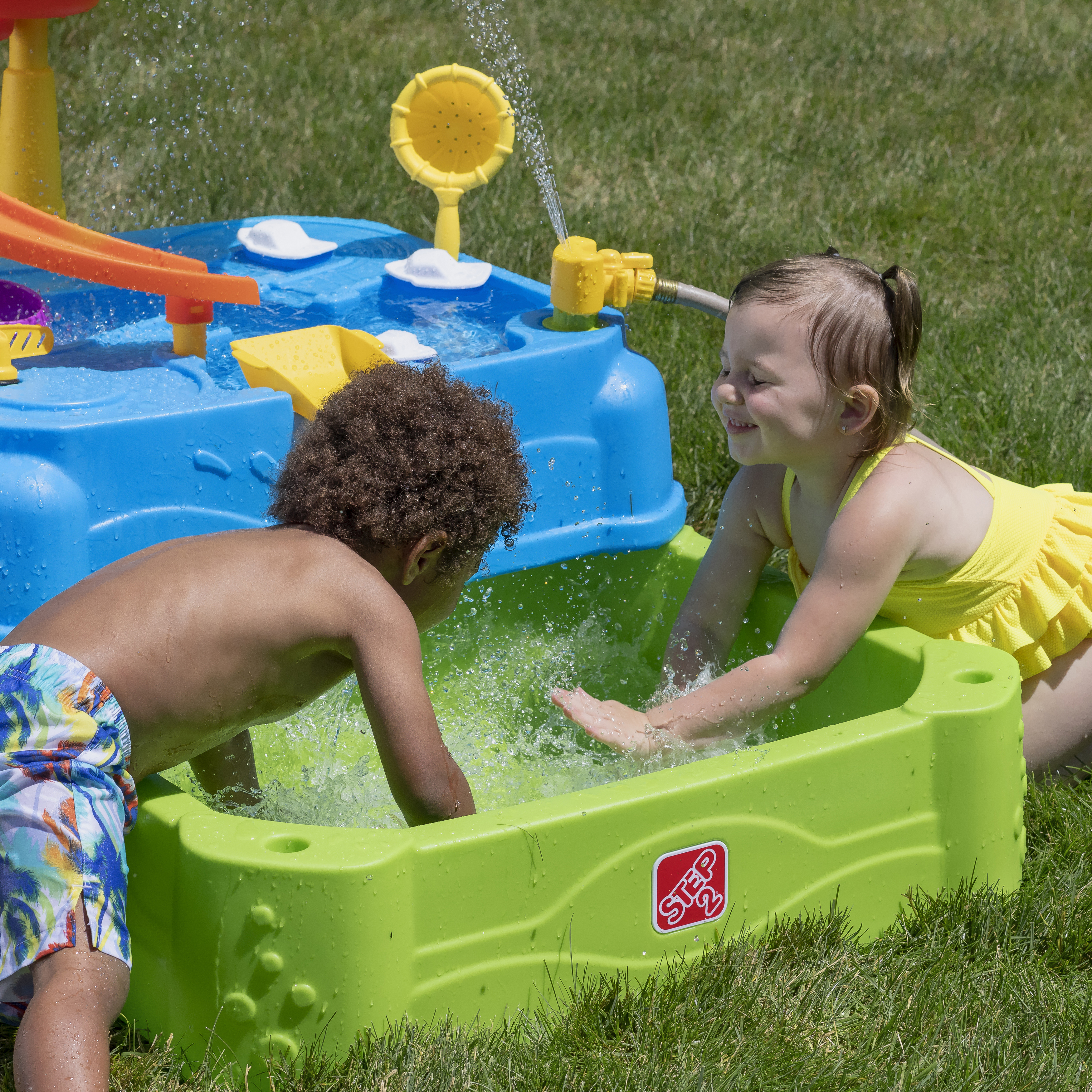 Speel, spetter en plons met de watertafel Waterpark Wonders Two-Tier van Step2! Deze watertafel is een variant op onze traditionele watertafel en biedt eindeloos speel- en spetterplezier. Je kindje kan in de schaduw van de parasol de hele dag plonsen en spannende wateractiviteiten ondernemen! Breng het bootspeelgoed van zee naar land met de ingebouwde wielen en gebruik de echt werkende ophaalbrug om matrozen en automobilisten door te laten. Sluit een gewone tuinslang aan op de watertafel-sproeier om het te laten regenen! En creëer een waterglijbaan door water uit de lagune van het waterpark op de torenhoge glijbaan te gieten en zie het water helemaal naar beneden stromen in het onderste bassin. Kindjes kunnen hun tenen in het grote bassin beneden laten zakken en op beide niveaus spetteren met de meegeleverde accessoires. Als het speelkwartier voorbij is, is het schoonmaken een fluitje van een cent dankzij de lekvrije aftappluggen in het bovenste en onderste niveau! Schuif de onderste bak weer onder de grote watertafel om hem compact op te bergen.